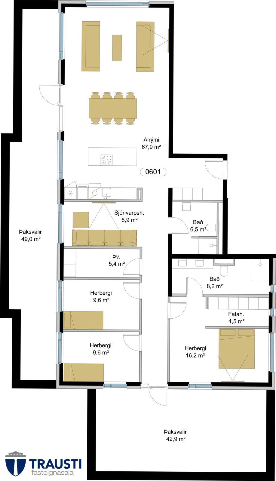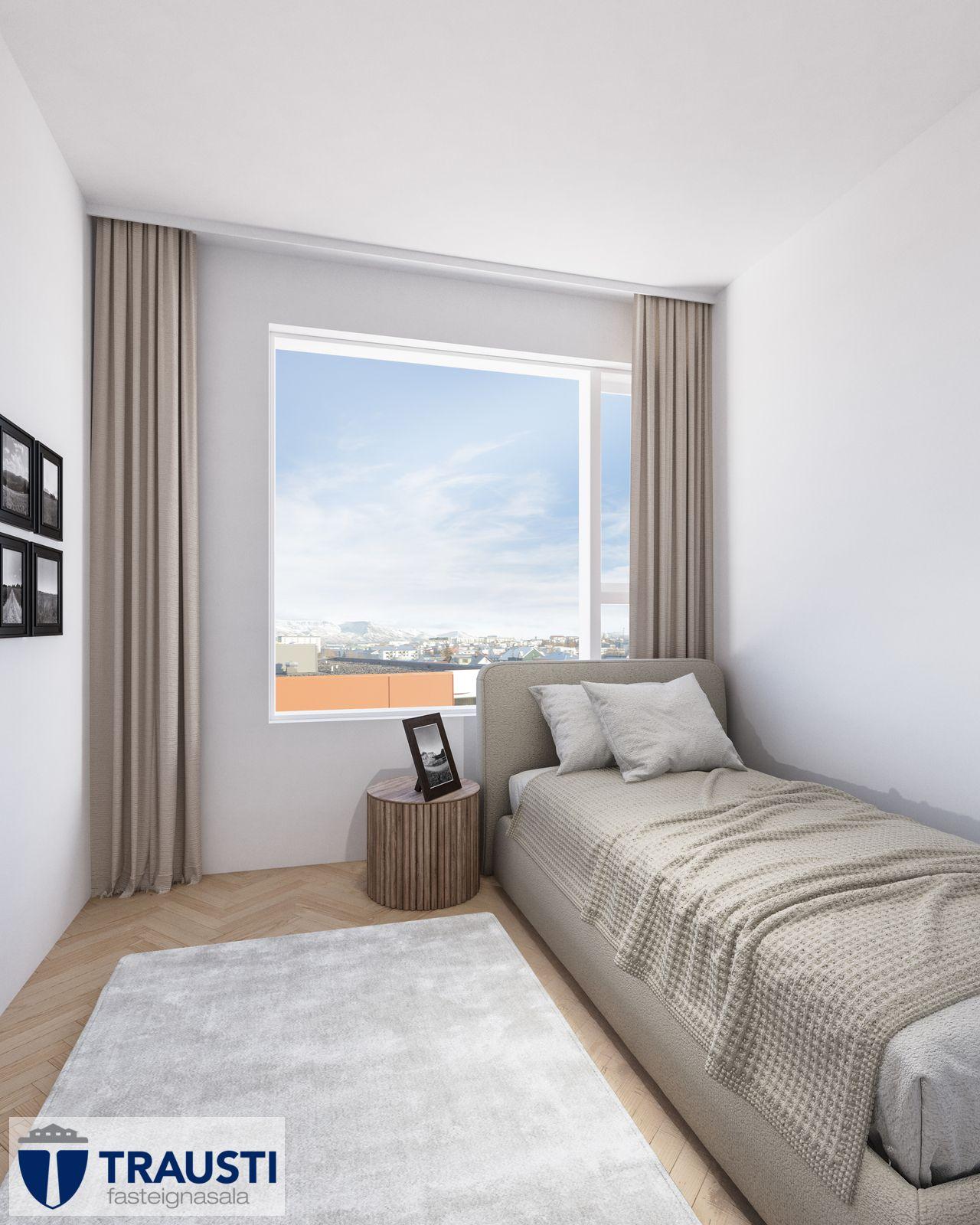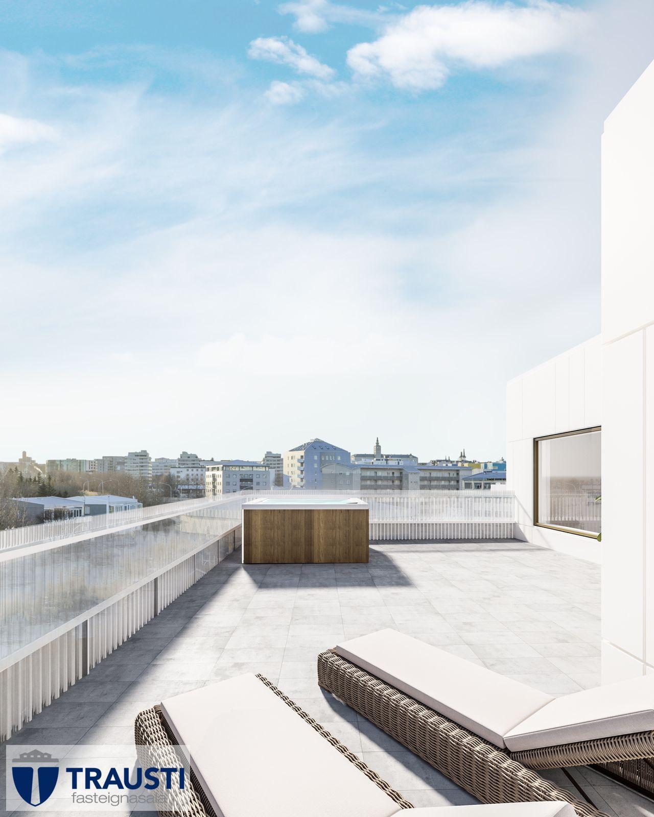 NÁNARI LÝSING: Laugaborg (íbúð 601) er glæsileg íbúð á 6. hæð með tvennum þaksvölum sem eru samtals 91,9 fm að stærð. Forstofa er með með fataskáp sem nær upp í loft. Stofa/alrými er björt og stór með útgengi á 49,0 fm þaksvalir til vesturs. Sjónvarpshol sem gæti verið möguleiki á að nýta sem fjórða svefnherbergið. Eldhús með fallegri sérsmíðaðri innréttingu með eldunareyju og quartz plötum á borðum. Span helluborð í eyju með innbyggðum gufugleypi. Bakaraofn með kjöthitamæli og sjálfhreinsibúnaði. Hjónasvíta er rúmgóð með fataherbergi og baðherbergi með sturtu inn af því. Útgengt á þaksvalir til suðurs. Tvö auka svefnherbergi eru í eigninni. Baðherbergi er með vönduðum sérsmíðuðum innréttingum frá Egger, quartz borðplötu og sturtu með Unidrain gólfrennupakka. Þvottahús með flísum á gólfum og upphengdum innréttingum. Geymsla íbúðar er 15,1 fm (Myndir á vef eru dæmi um útlit eignar en endurspegla ekki alltaf nákvæmlega auglýsta eign).