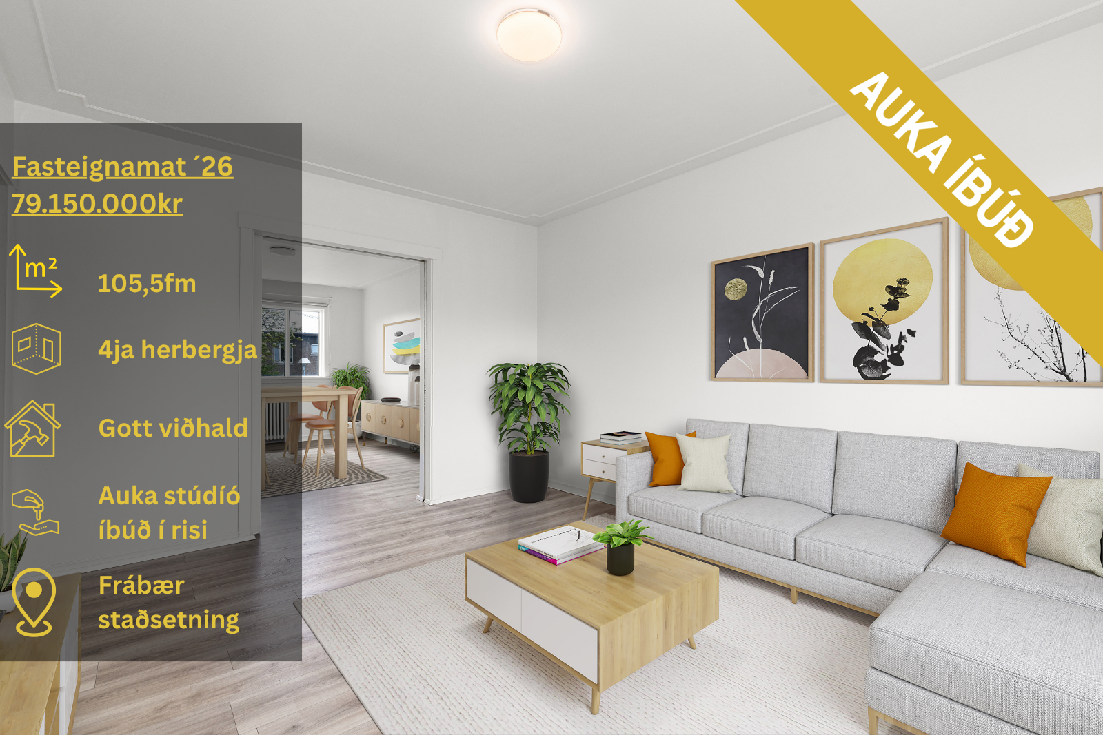 Mjög góð og vel skipulögð 4ja herbergja íbúð með auka stúdíóíbúð í risi á góðum og vinsælum stað í miðbæ Reykjavíkur. Auðvelt að færa eldhús inn í aðra stofuna og fá þannig 4 svefnherbergið. Einnig rennihurð á milli stofa sem lokar á milli. Frábær staðsetning með alla helstu verslun og þjónustu við dyragættina ásamt miðbæ Reykjavíkur með allt sem hann hefur upp á að bjóða ásamt útivistarparadísina á Klambratúni. Þá eru skólar á öllum stigum í nágrenninu.