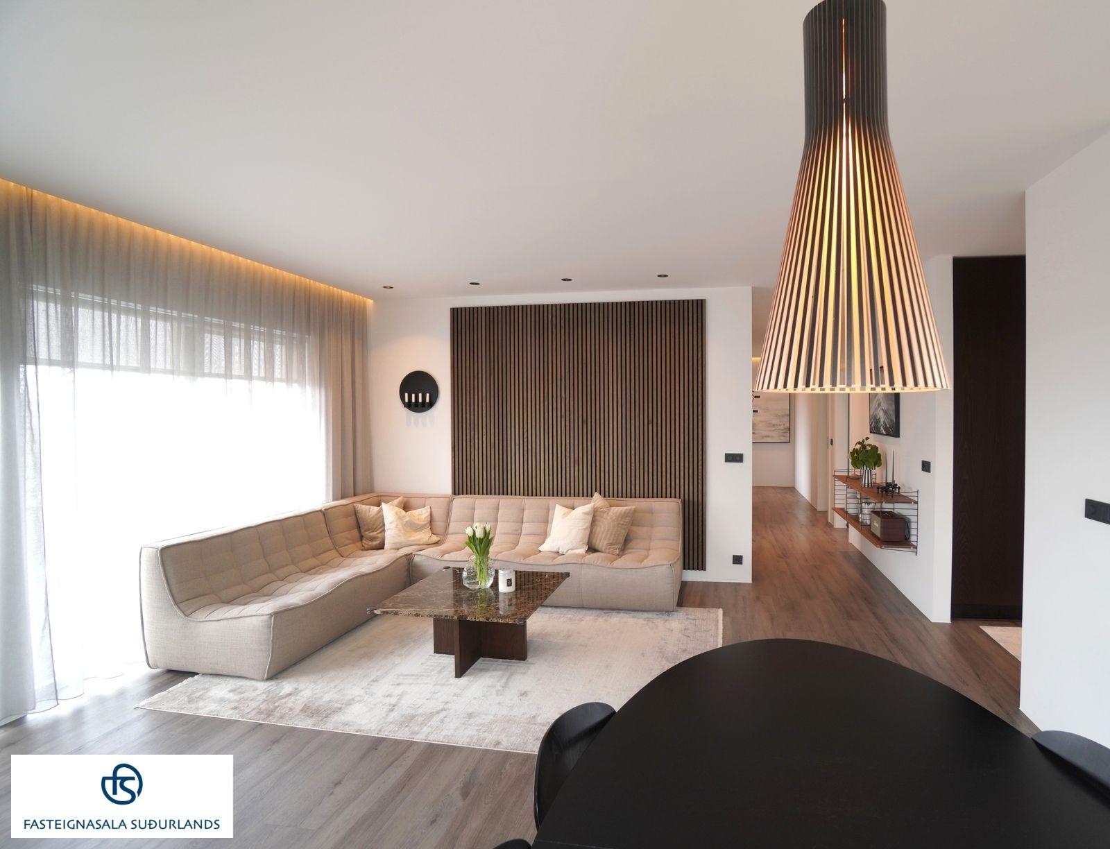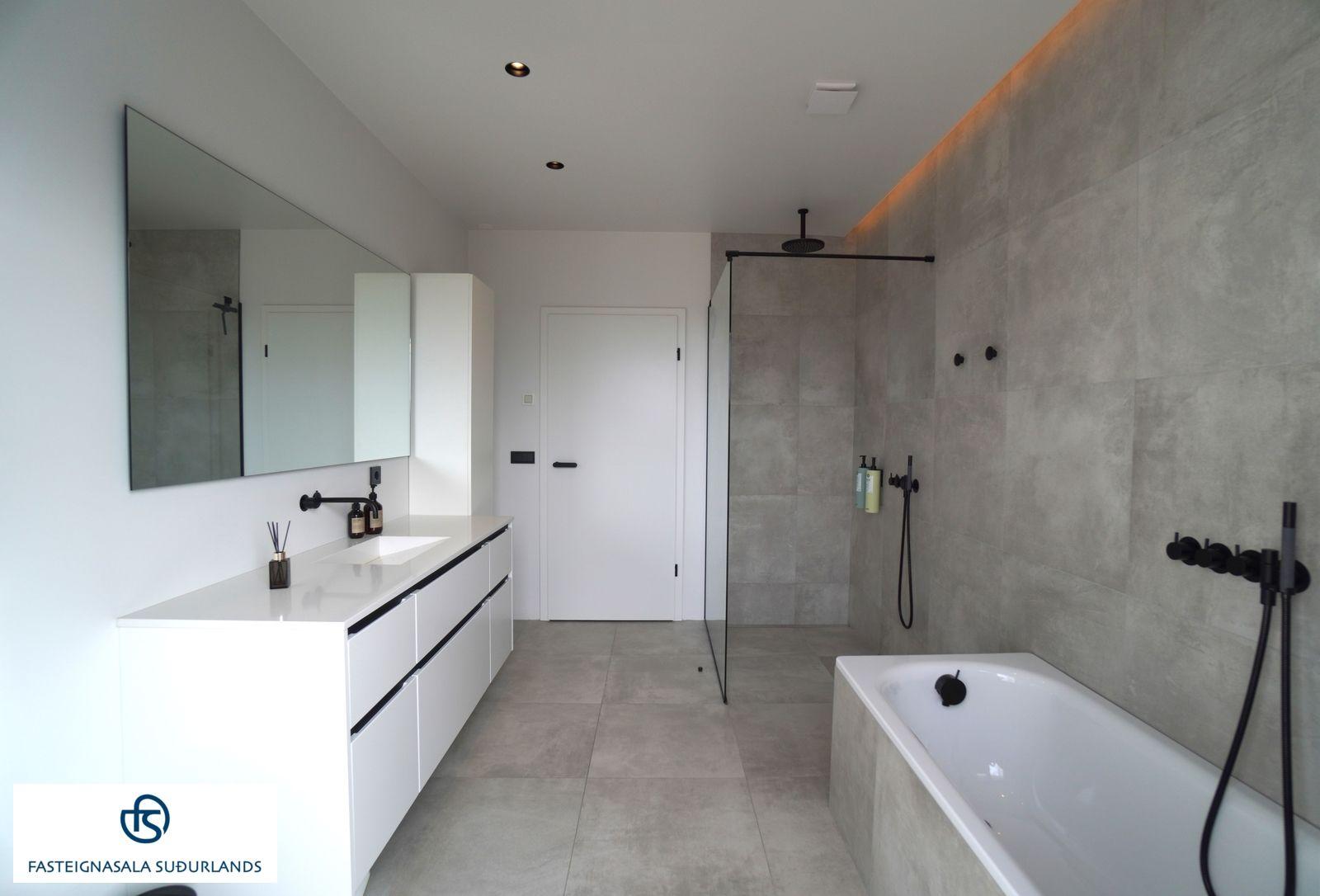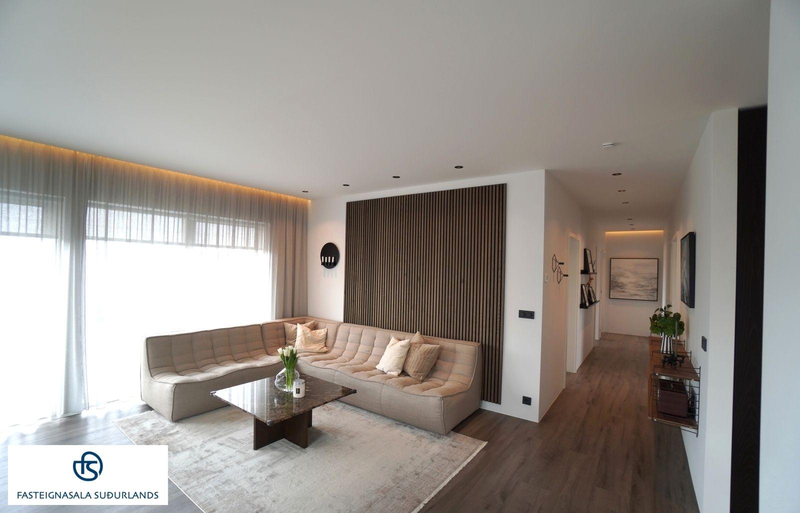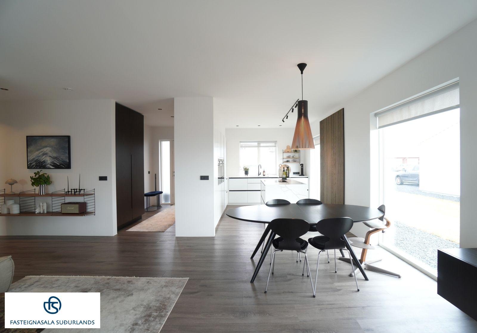 Eignin telur: * Mjög rúmgóða forstofu með stórum fataskáp. * Glæsilega stofu þaðan sem utangengt er um rennihurð á stóra verönd með heitum potti ! * Skuggafúga með ljósi er í stofunni sem gefur henni einstaklega hlýlegt yfirbragð. * Stórglæsilegt eldhús með stórri eyju, 2 ofnum, vínkælir og góðum tækjaskáp. Innréttingin er frá Kvik og borðplatan er frá Granítsmiðjunni (quartz steinn). Yfir eyjunni er kastarabraut frá Lumex. * Stór innfelldur ísskápur og stór innfelldur frystiskápur fylgja. * 3 stór svefnherbergi. Mjög góðir fataskápar eru í hjónaherbergi. ** Allir skápar í húsinu eru sérsmíðaðir. ** Í hjónaherbergi er skuggafúga með ljósi. * Glæsilegt baðherbergi með hvítri innréttingu með borðplötu frá Steinsmiðjunni Rein, baðkari og sturtu úr glerþili. Blöndunartæki eru innbygð frá Vola. Skuggafúga með ljósi er á baðherbergi. * Úr baðherberginu er utangengt á veröndina þar sem er heitur pottur. * Mjög rúmgott þvottahús með stórri innréttingu með vinnuborði og vask. Úr þvottahúsinu er innangengt í bílskúrinn.