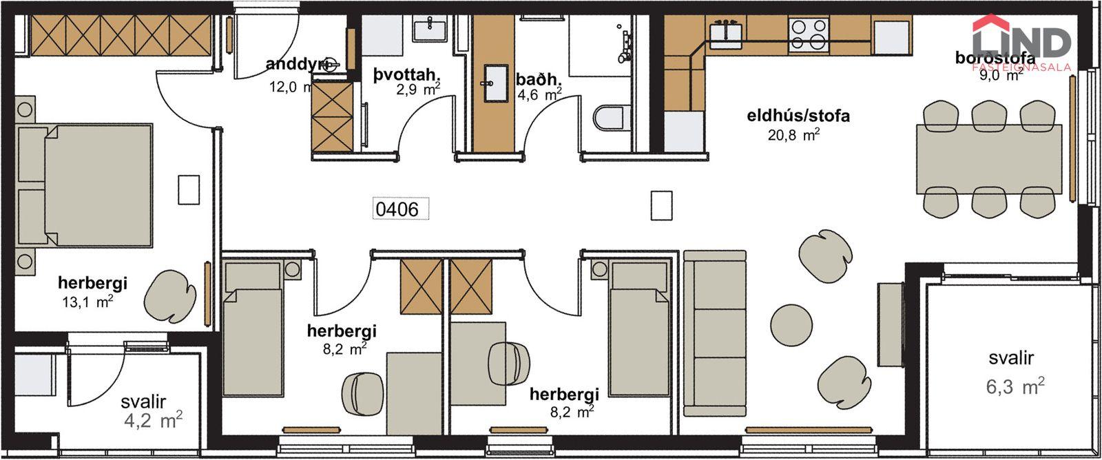 Íbúð 406 er fjögurra herbergja með þvottahúsi og bílastæði í kjallara.
