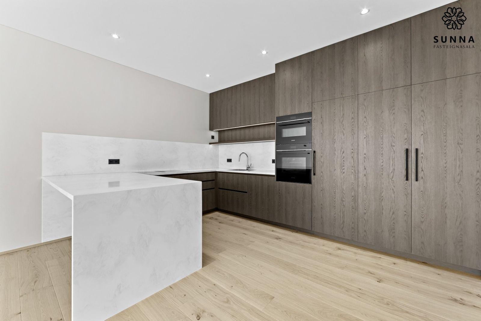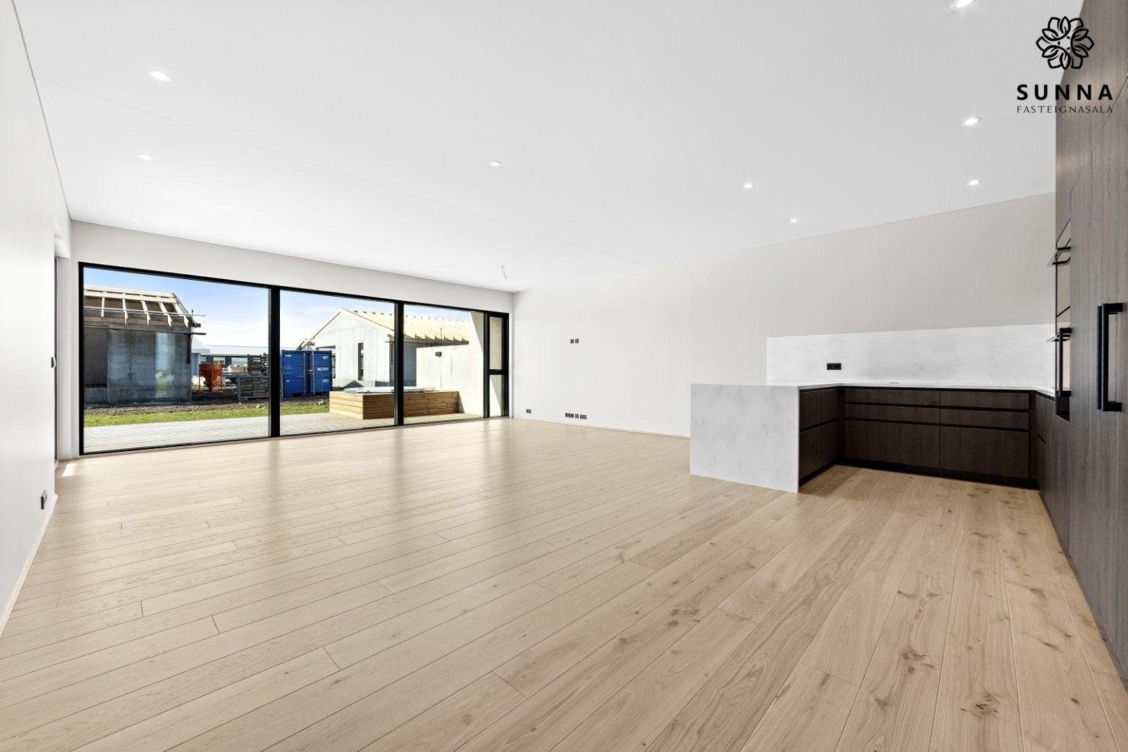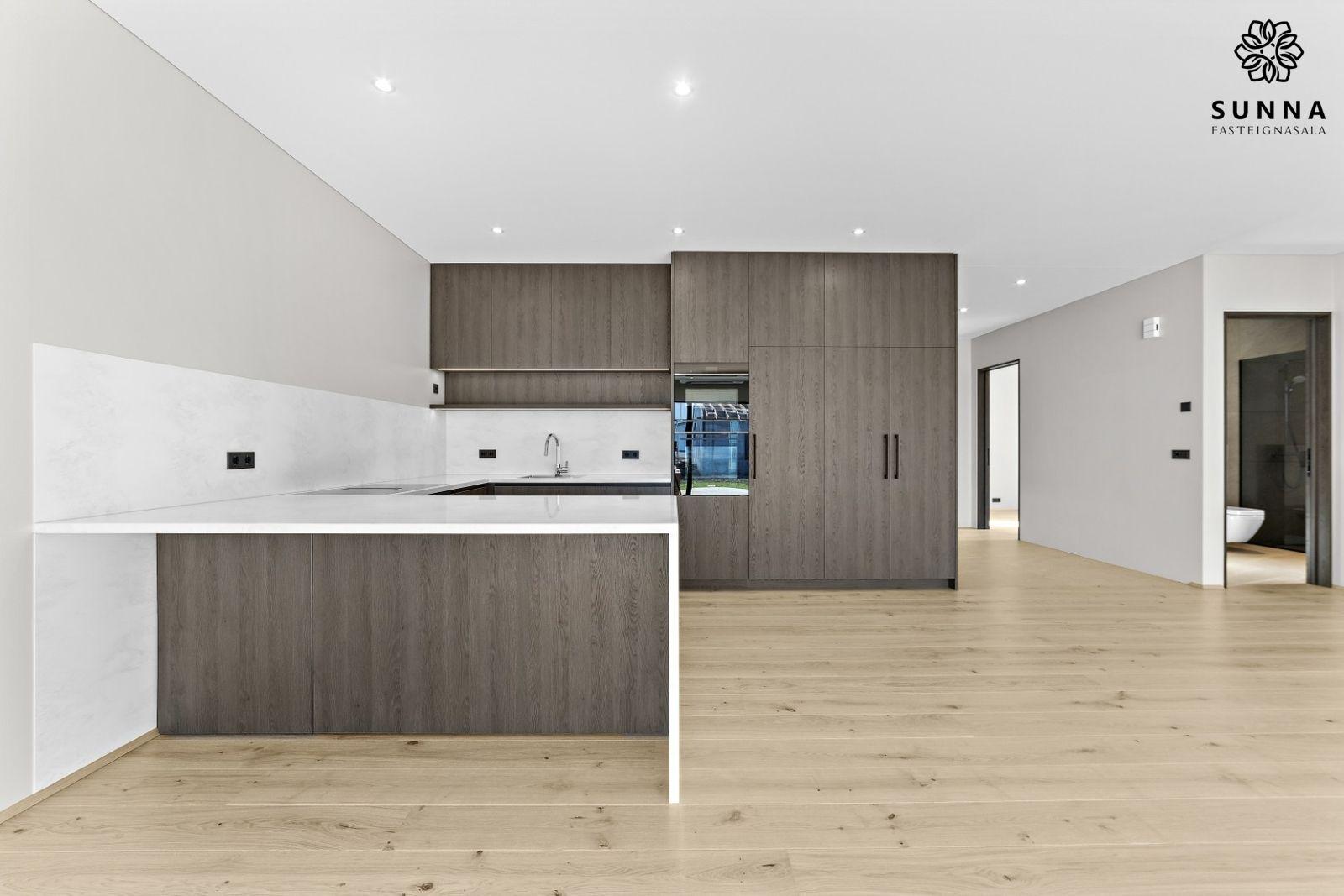 ATH. Húsin eru tilbúin til afhendingar. Skoða myndband af eigninni. Allar innréttingar og hurðar eru sérsmíðaðar frá Grindinni ehf. og skilast með vönduðum eldhústækjum frá Siemens, þ.á.m. innbyggðum ísskáp og uppþvottavél. Þau skilast fullmáluð og með hágæða gólfefnum. Gólfhiti er í öllum gólfum og hljóðvistardúkur er í loftum. Akrýlsteinn er á borðplötum. Nánari upplýsingar eru í skilalýsingu: