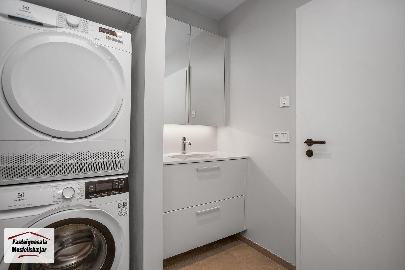 Baðherbergi flísalagt og með vandaðri innréttingu. Á baði er vegghengt salerni, 'walk in' sturta og handklæðaofn. Tengi er fyrir þvottavél og þurrkara.
