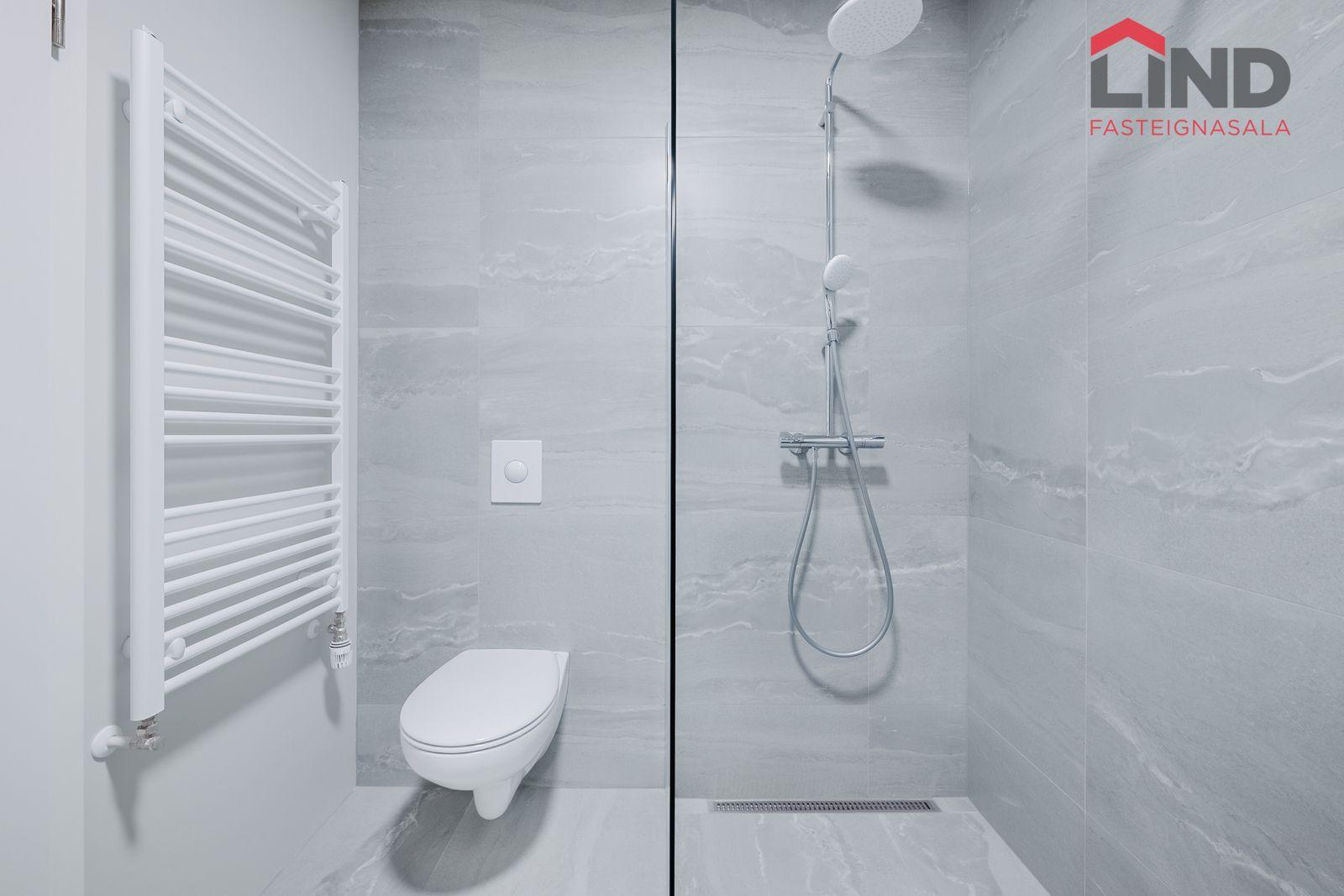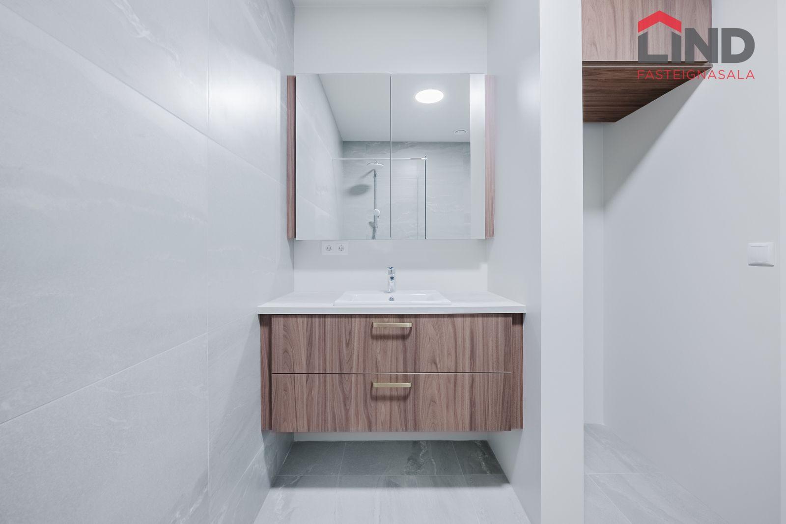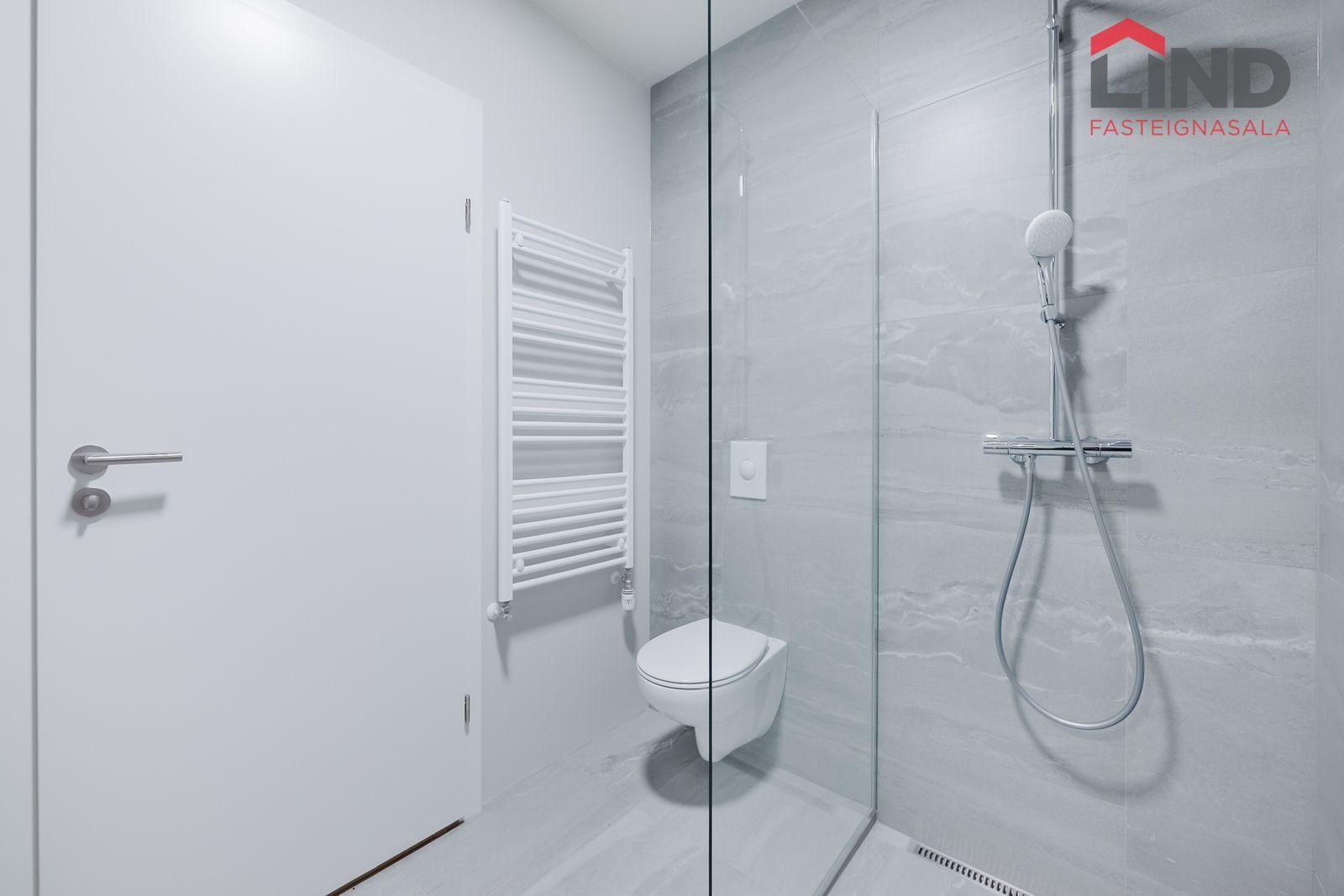 Baðherbergi: Baðinnrétting kemur frá Axis. Hreinlætistæki og handklæðaofn eru frá Byko. Salernið er upphengt og innbyggt. Hitastýrð blöndunartæki verða við sturtu. Gólf eru flísalögð og veggir að hluta upp í loft