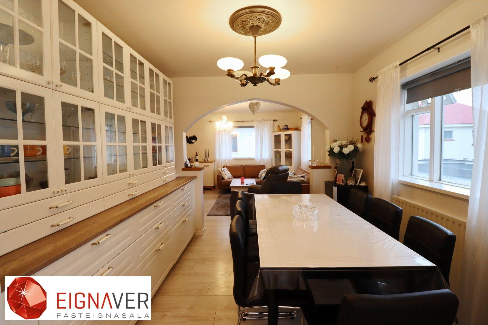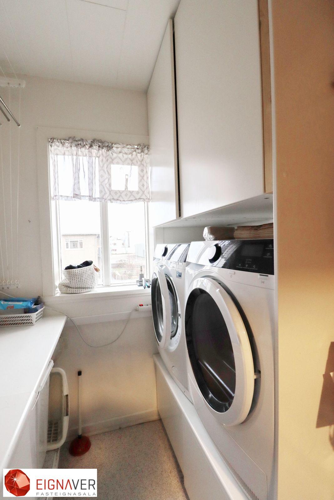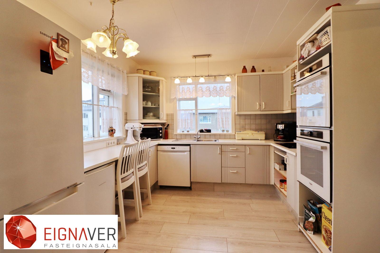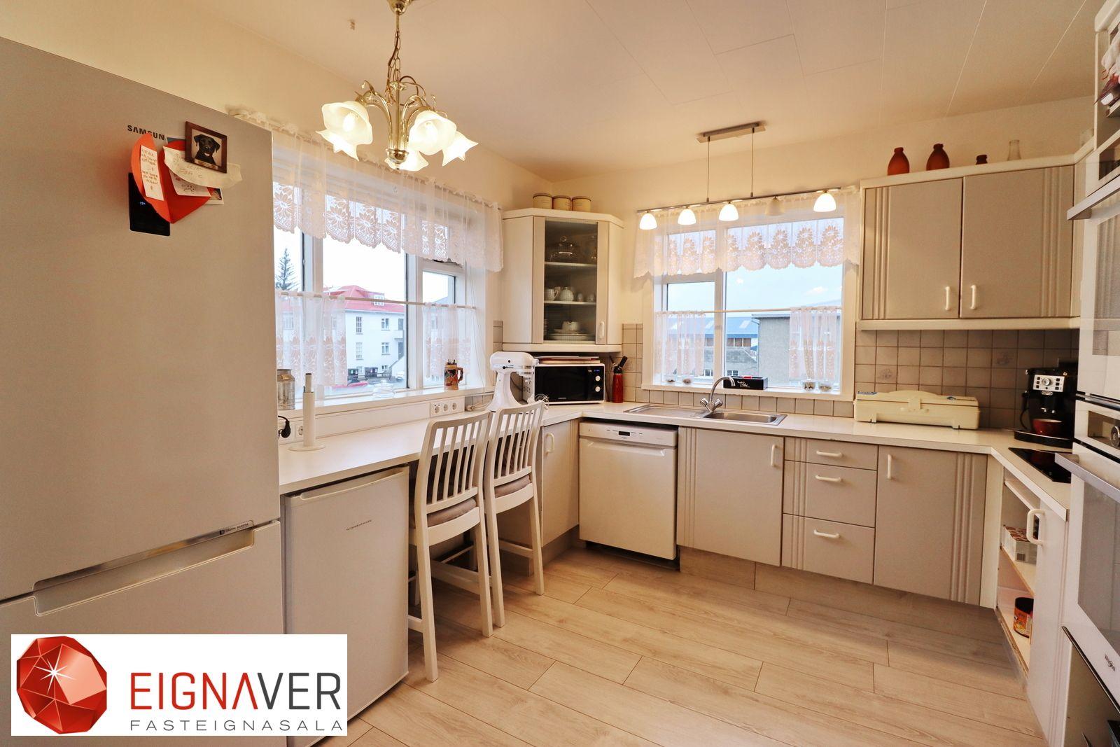 Nánari lýsing: Forstofa með flísum á gólfi, góð köld geymsla, þar er jafnframt gengið inn í sameiginlegt þvottahús ( sem eigendur íbúðar eru ekki að nota í dag ) og sameiginlega geymslu. Stigi upp er flísalagður og mjög rúmgóður.gengið upp flísalagðan stiga. Á efri palli er pláss fyrir yfirhafnir. Útgengt út á svalir af efri palli. Þvottahús á hæð með dúk á gólfi, gluggi, mjög góð innrétting, vélar í vinnuhæð. Hol er rúmgott og bjart, parket á gólfi. Úr holi er gengið inn í öll rými eignarinnar. Eldhús parket á gólfi, góð innrétting, Góð borðstofa tengir saman eldhús og stofu. Gott skápapláss er í borðstofu. Stofa með parketi á gólfi gluggar til suðurs og vesturs. Björt og rúmgóð stofa. Baðherbergi með flísum á gólfi, gluggi til austurs,baðkar, fín innrétting. Svefnherbergi eru þrjú, öll með parketi á gólfi, góðir skápar í hjónaherbergi.