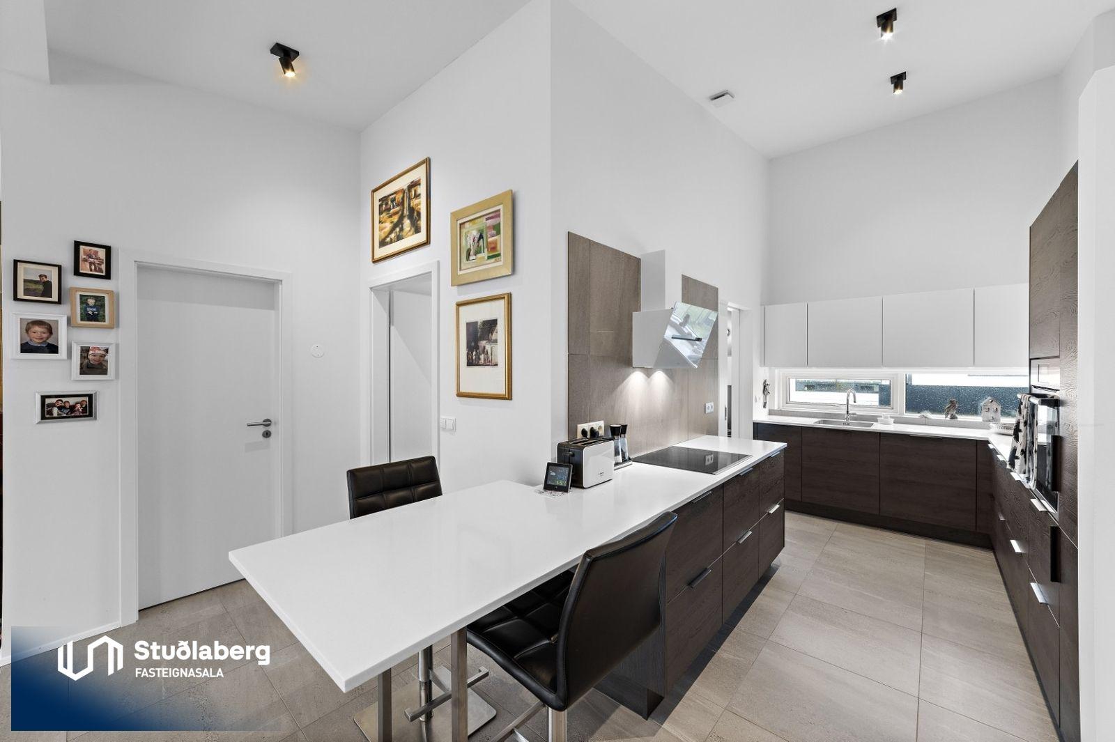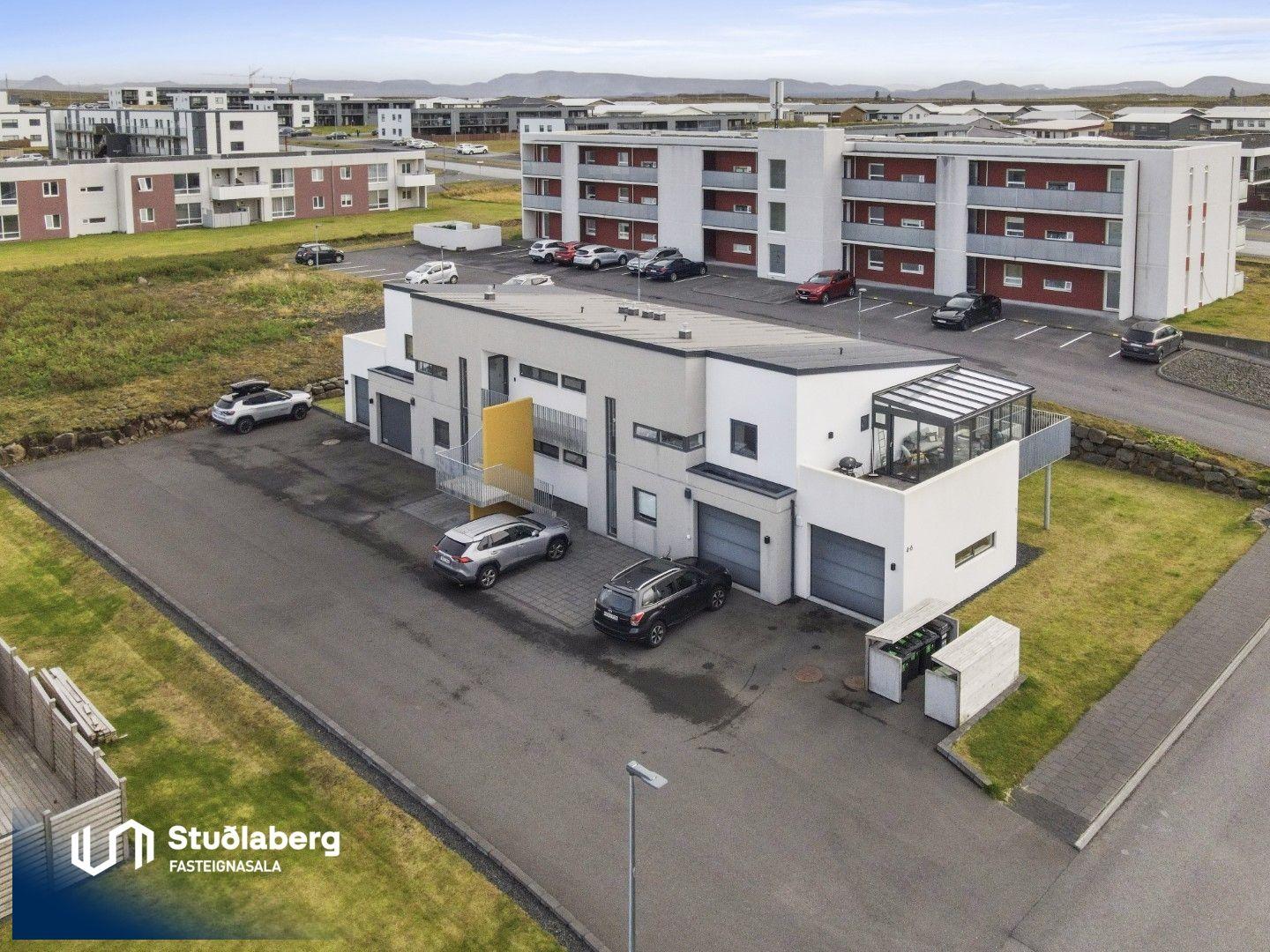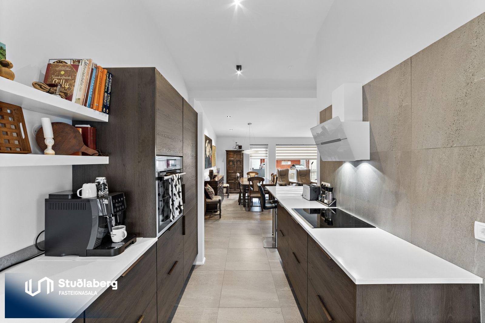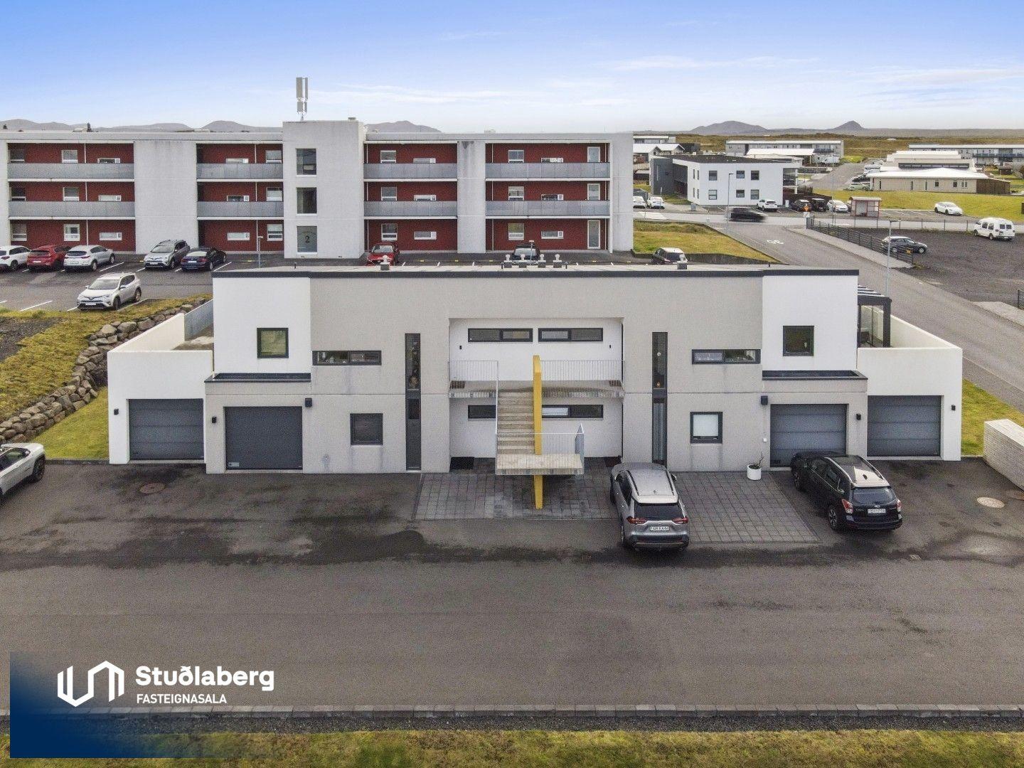 Helstu kostir: Lúxus innréttingar: Þýskar innréttingar frá Nobila, innbyggður ísskápur með frysti ásamt uppþvottavél. Falleg lýsing er frá Lumex. Tvö baðherbergi: Bæði eru með gólfhita og hágæða hreinlætistækjum. Stórar svalir: 40fm svalir. Bílskúr snyrtilegur með hurðaropnara. Vönduð gólfefni: Ítalskar flísar á votrýmum og harðparket frá Parka á stofu og svefnherbergjum. Frábær staðsetning: Íbúðin er aðeins 20 mínútur frá höfuðborgarsvæðinu og steinsnar frá Stapaskóla.