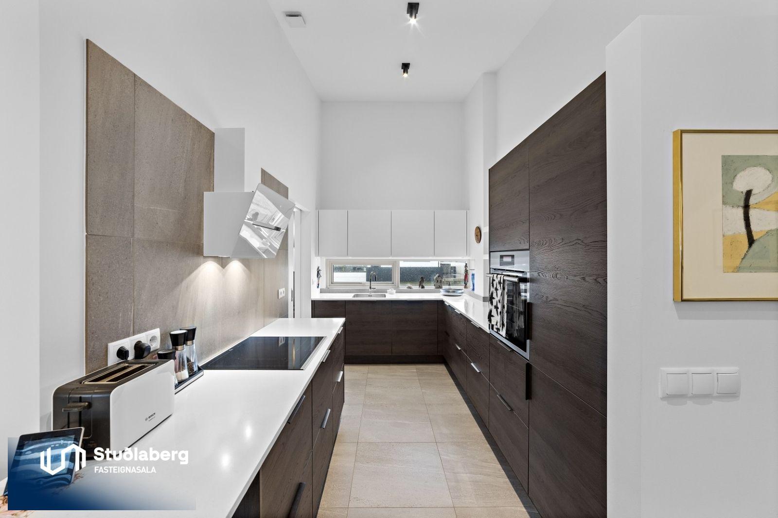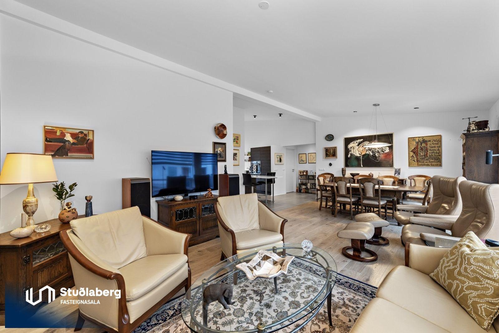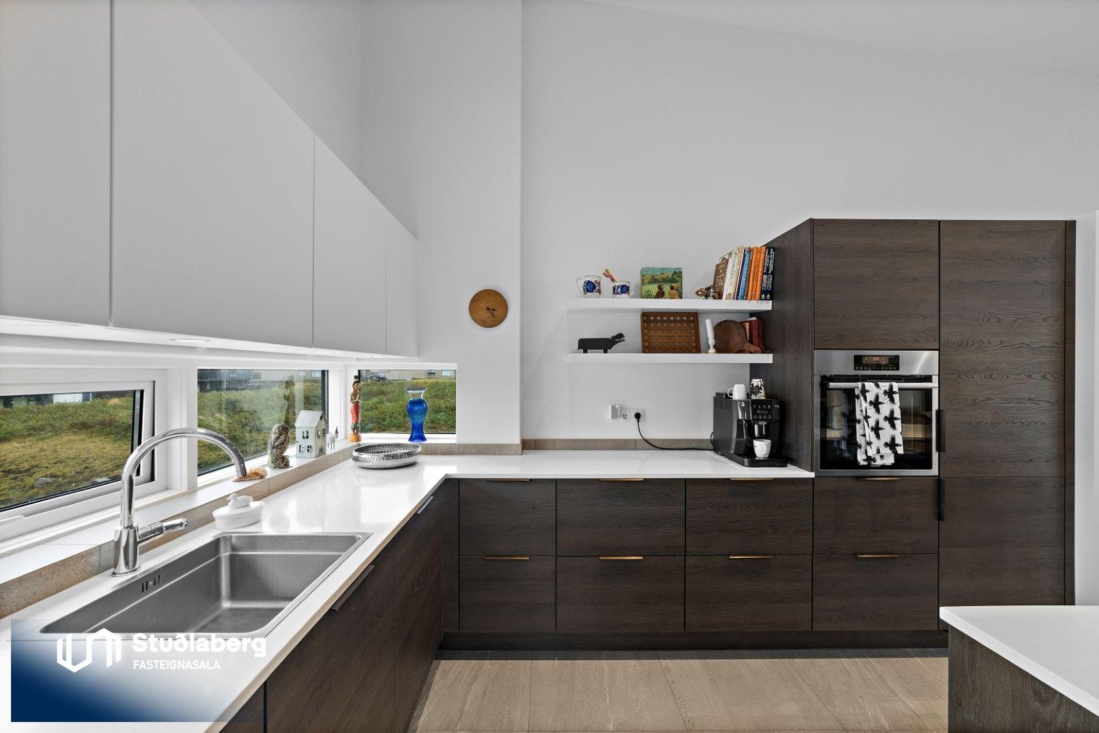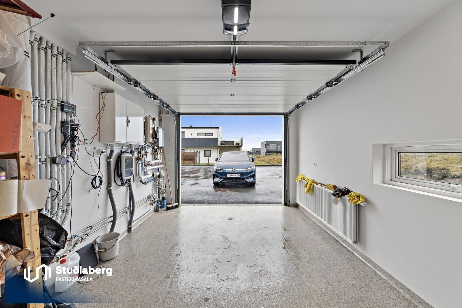Helstu kostir: Lúxus innréttingar: Þýskar innréttingar frá Nobila, innbyggður ísskápur með frysti ásamt uppþvottavél. Falleg lýsing er frá Lumex. Tvö baðherbergi: Bæði eru með gólfhita og hágæða hreinlætistækjum. Stórar svalir: 40fm svalir. Bílskúr snyrtilegur með hurðaropnara. Vönduð gólfefni: Ítalskar flísar á votrýmum og harðparket frá Parka á stofu og svefnherbergjum. Frábær staðsetning: Íbúðin er aðeins 20 mínútur frá höfuðborgarsvæðinu og steinsnar frá Stapaskóla.