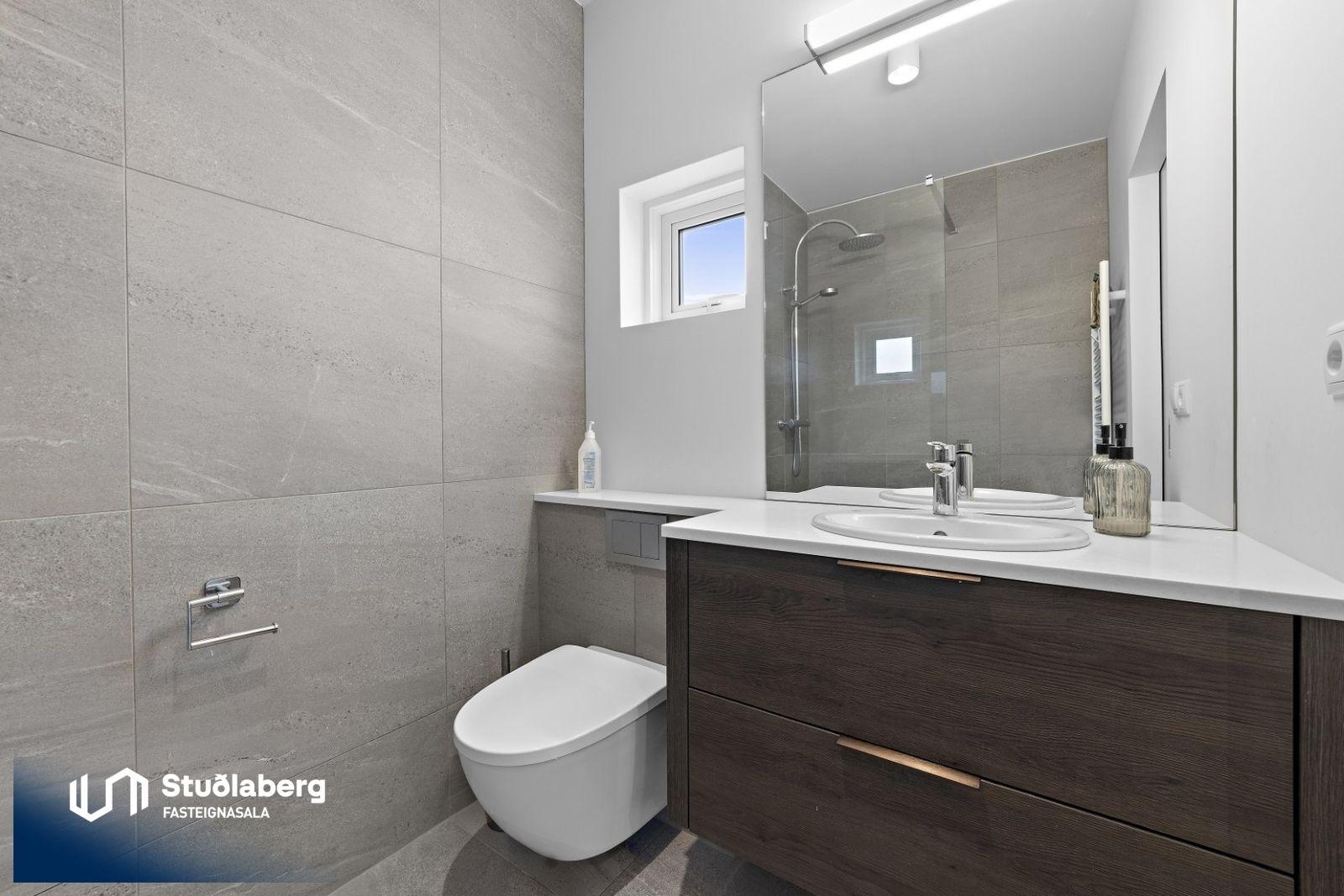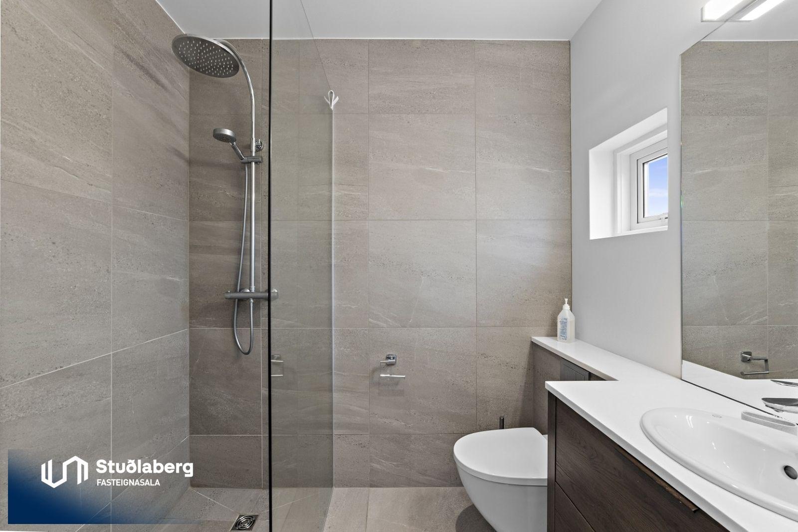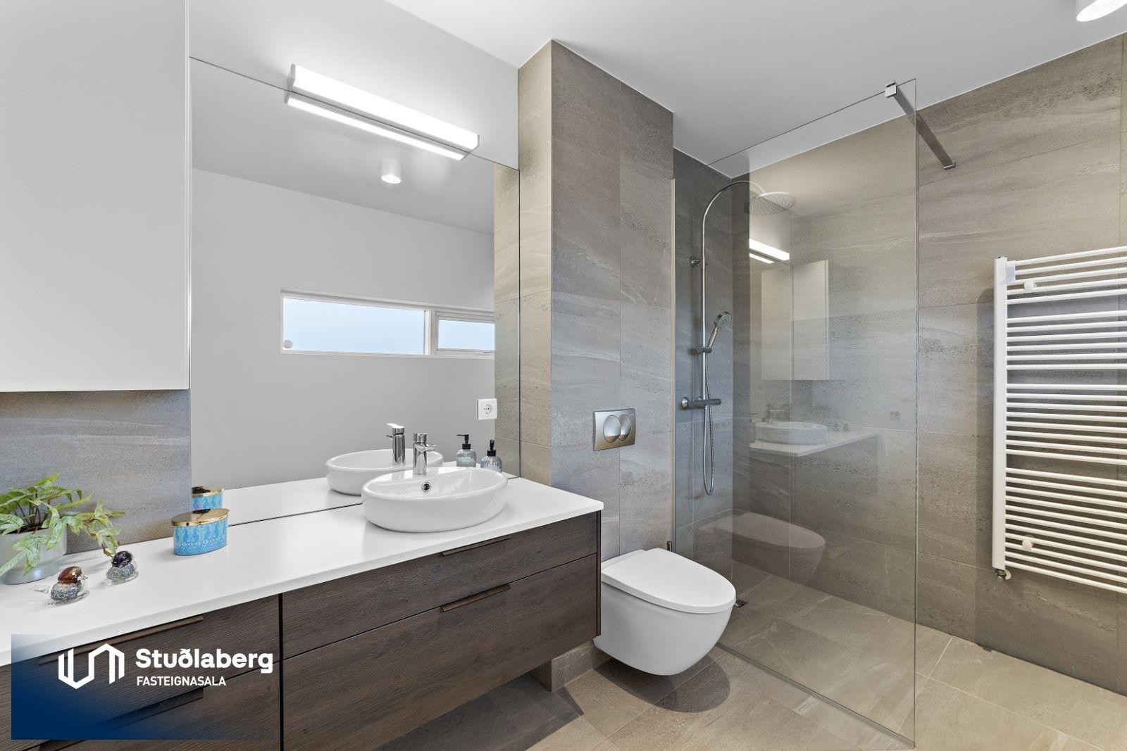 Nánari lýsing: Forstofa: Flísalögð með rúmgóðum fataskápum. Hægt að ganga inn í eldhús og alrými. Eldhús: Flísar á gólfi, með sér smíðuðum innréttingum og borðplötu úr Meganite “stein”, dimmanleg lýsing er undir efri skápum. Eldhúsið er með innbyggðum tækjum frá Progress (AEG). Stofa: Er björt og rúmgóð með harðparketi ásamt útgangi út á svalir. Svefnherbergi I: Hjónaherbergi er með virkilega góðum fataskápum sér baðherbergi ásamt útgangi út á svalir. Svefnherbergi II: Er með góðum fataskápum og harðparketi á gólfi. Baðherbergin: Eru bæði flísalögð með gólfhita, fallegum innréttingum og steinborðplötu. Annað baðherbergi er inn af hjónaherbergi. Þvottahús: Flísar á gólfi. Vönduð innrétting þar sem gert er ráð fyrir þvottavél og þurrkara í vinnuhæð, ásamt skolvask.