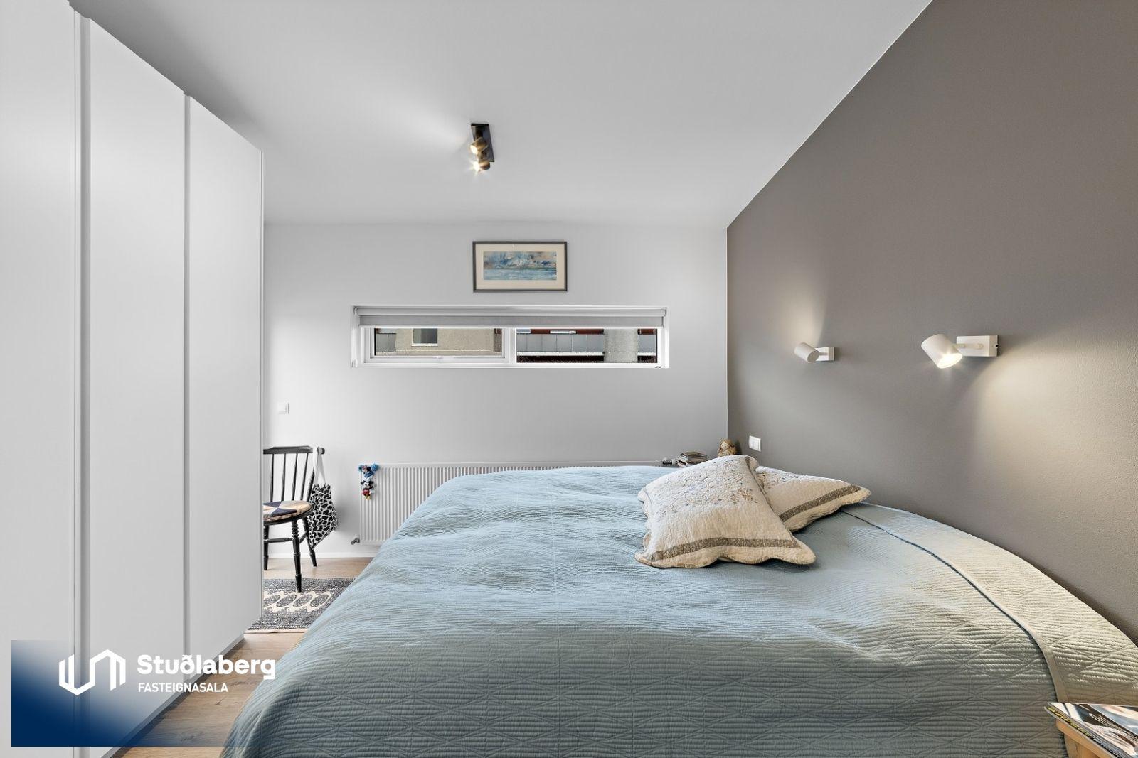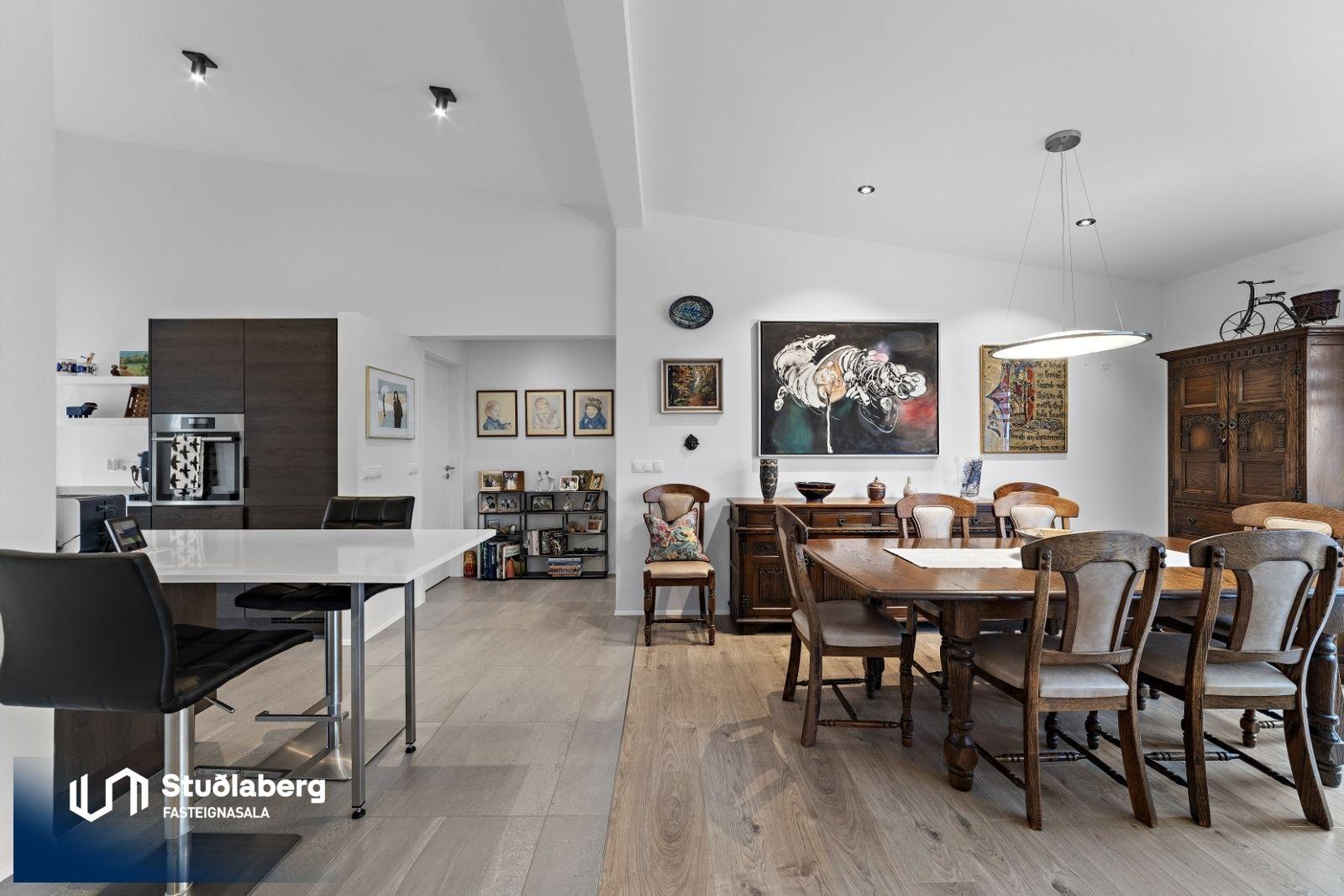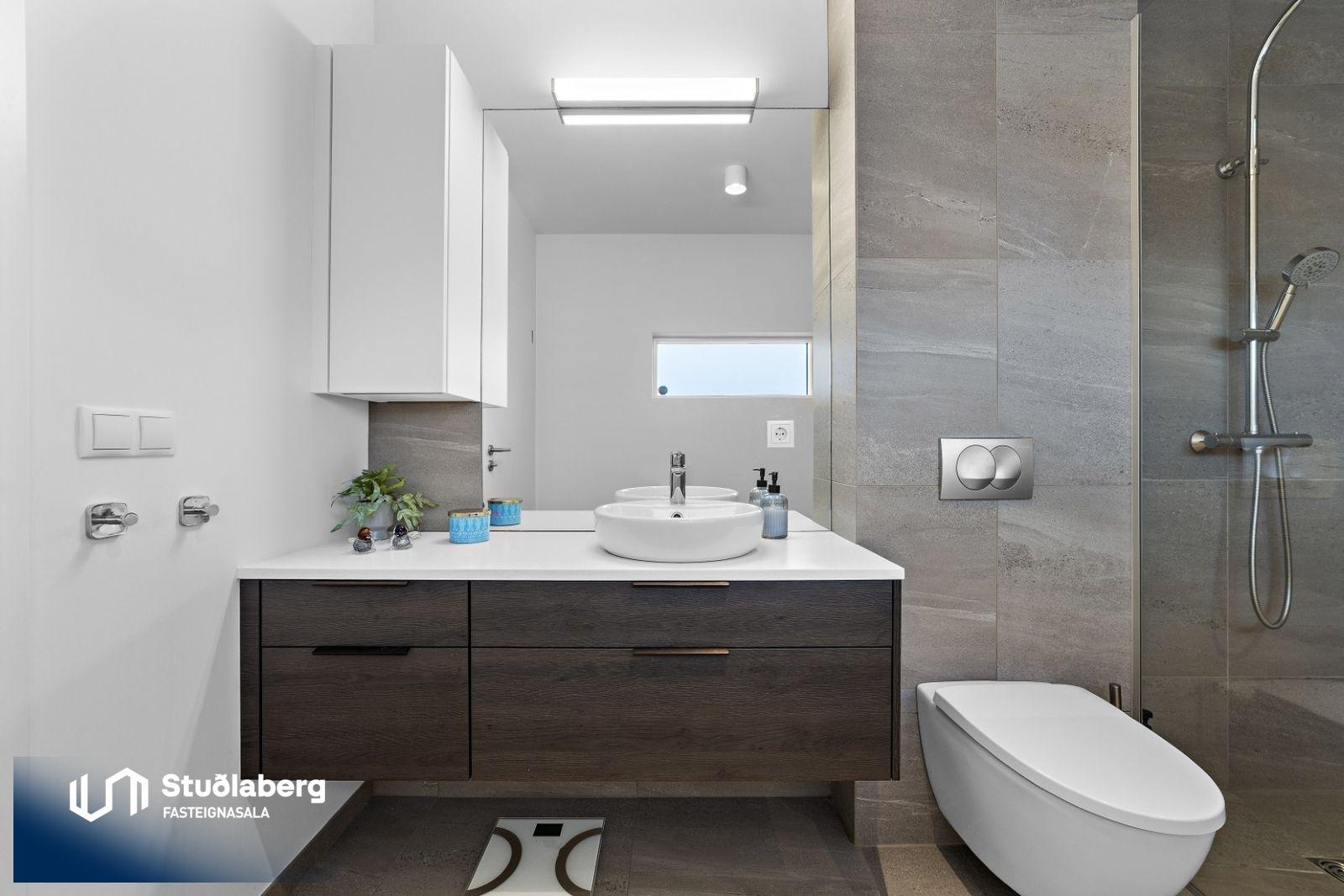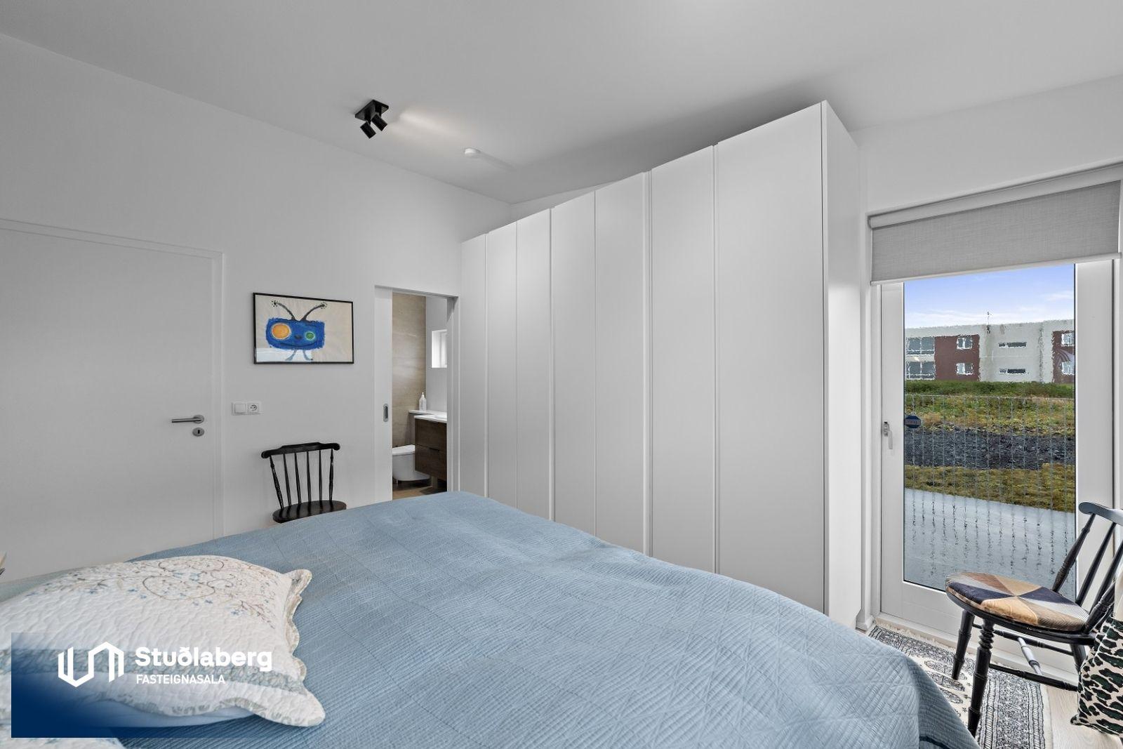 Nánari lýsing: Forstofa: Flísalögð með rúmgóðum fataskápum. Hægt að ganga inn í eldhús og alrými. Eldhús: Flísar á gólfi, með sér smíðuðum innréttingum og borðplötu úr Meganite “stein”, dimmanleg lýsing er undir efri skápum. Eldhúsið er með innbyggðum tækjum frá Progress (AEG). Stofa: Er björt og rúmgóð með harðparketi ásamt útgangi út á svalir. Svefnherbergi I: Hjónaherbergi er með virkilega góðum fataskápum sér baðherbergi ásamt útgangi út á svalir. Svefnherbergi II: Er með góðum fataskápum og harðparketi á gólfi. Baðherbergin: Eru bæði flísalögð með gólfhita, fallegum innréttingum og steinborðplötu. Annað baðherbergi er inn af hjónaherbergi. Þvottahús: Flísar á gólfi. Vönduð innrétting þar sem gert er ráð fyrir þvottavél og þurrkara í vinnuhæð, ásamt skolvask.