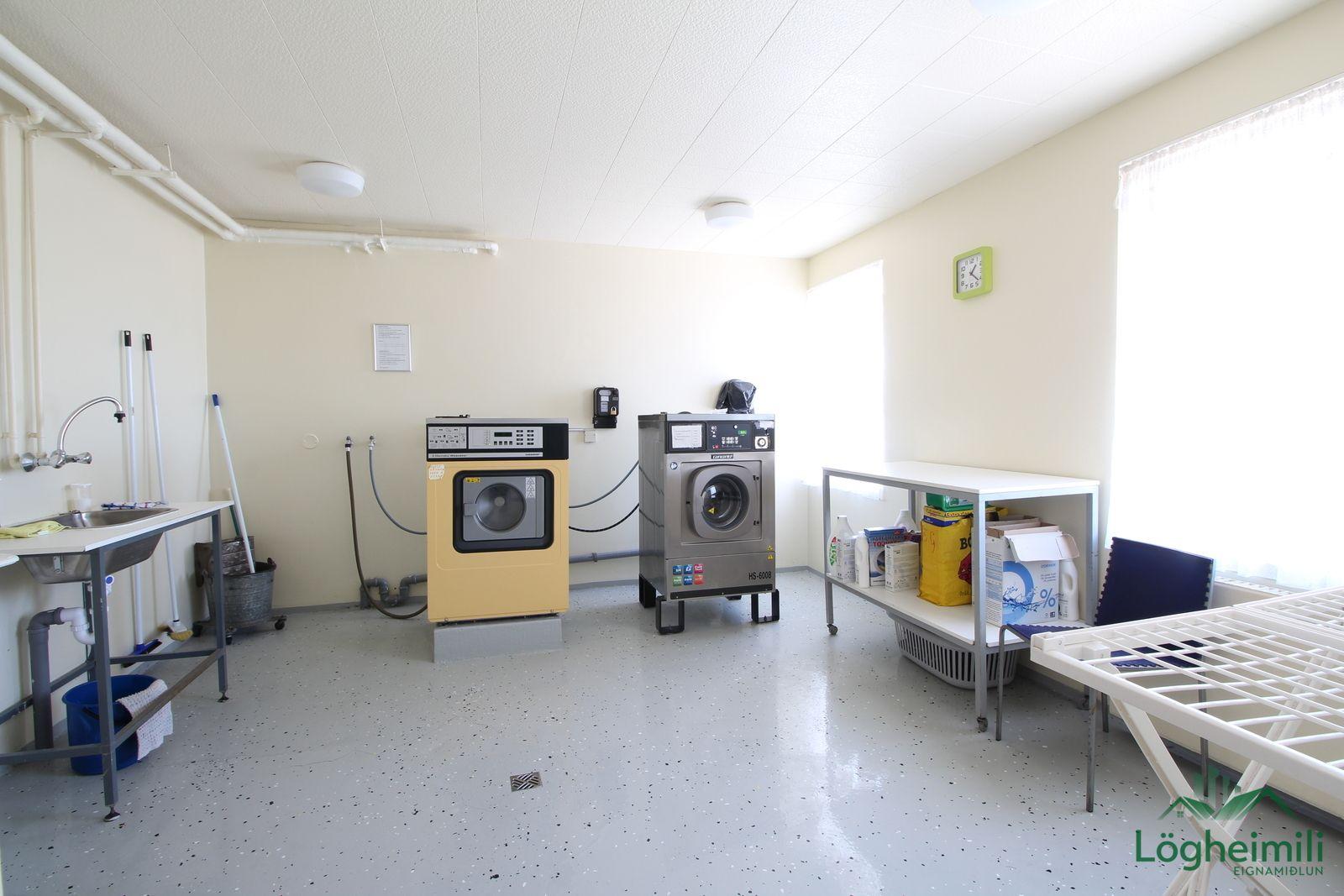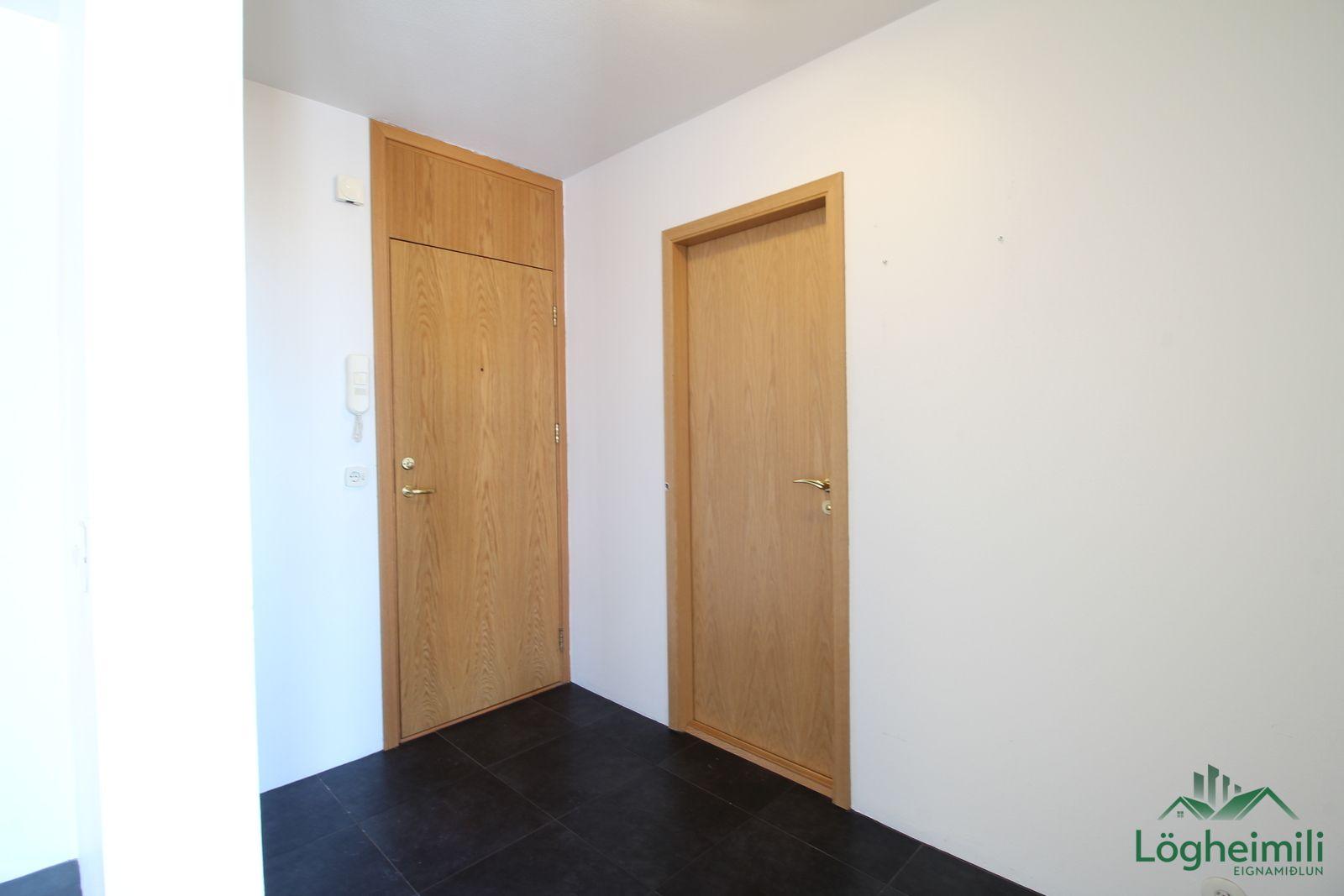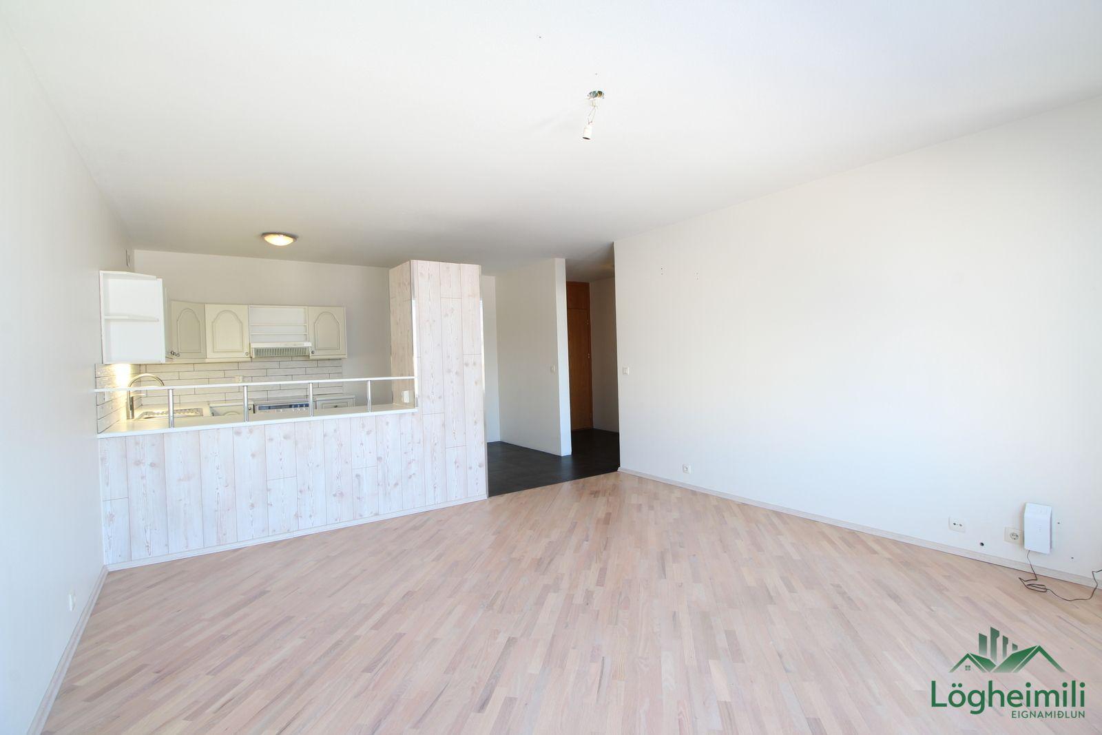 Nánari lýsing: Hol er með innangengt í aðrar vistarverur. Stofa er með útgengt á yfirbyggðar svalir. Í eldhúsi er hvít innrétting, flísar milli efri og neðri skápa, borðkrókur og opið inn í stofu. Í baðherbergi er skápur undir vask, sturtuklefi, tengi fyrir þvottavél, þrjár glerhillur og flísar upp veggi. Herbergi er með fataskáp. Parket er á gólfum, nema á baðherbergi, holi og eldhúsi þar sem eru flísar. Sérgeymsla og sameiginlegt þvottahús og hjólageymsla, er á jarðhæð.