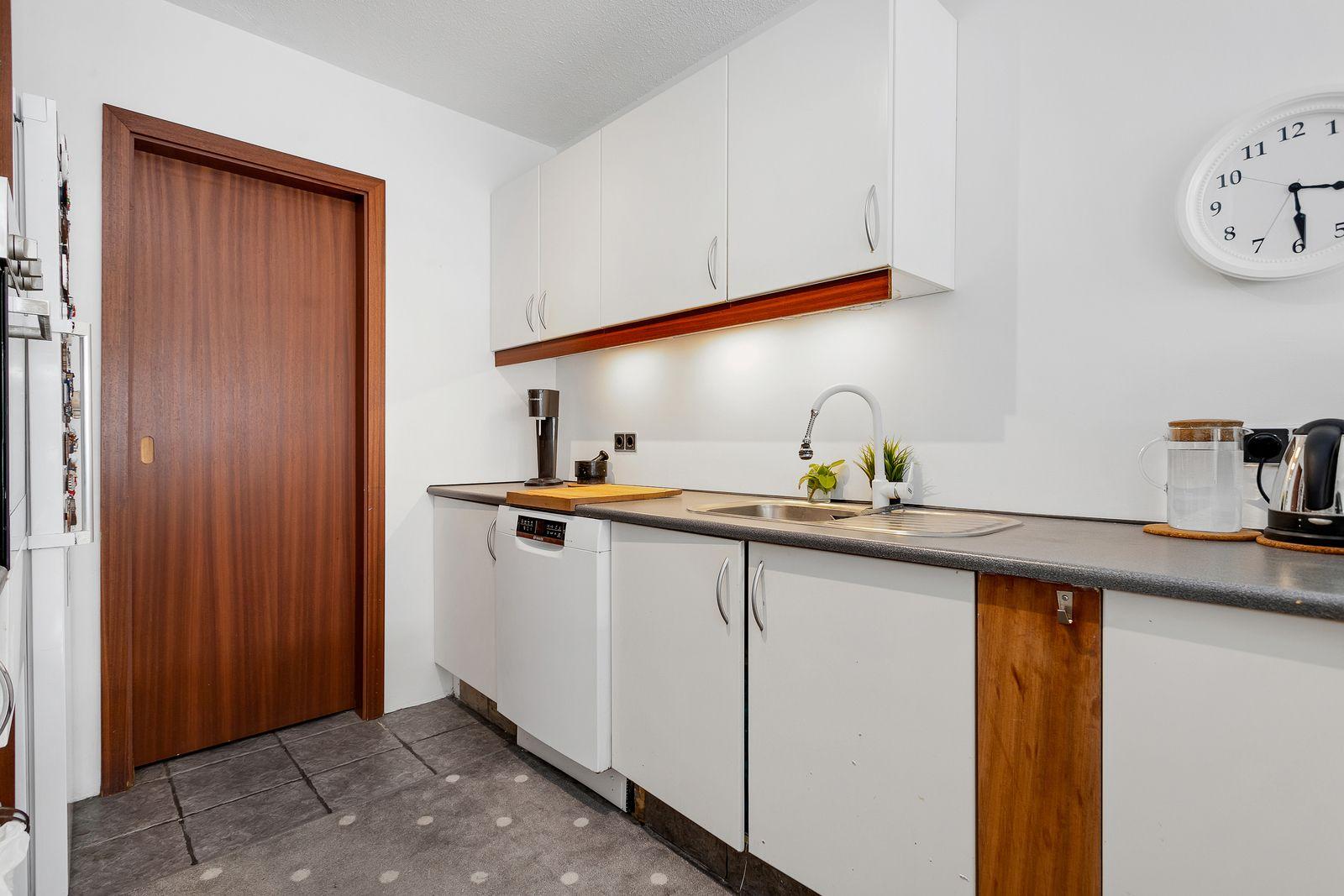 Eldhús með ljósri innréttingu, flísar á gólfi.