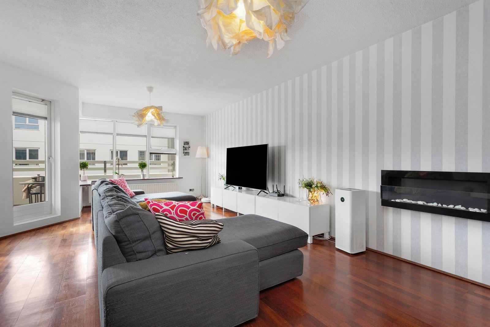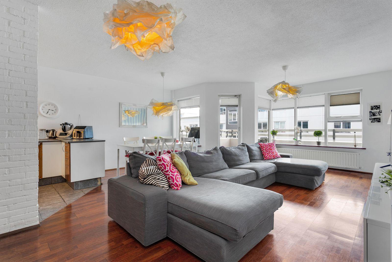 Stofa og borðstofa eru bjartar og rúmgóðar, parket á gólfi.