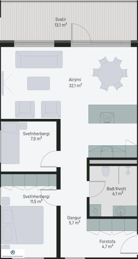 * Utangengt er úr stofunni á 13,3m2 timburklæddar suðursvalir. Frágang við svalir er þannig háttað að á tiltölulega einfaldan hátt er hægt að setja á þær svalalokun.