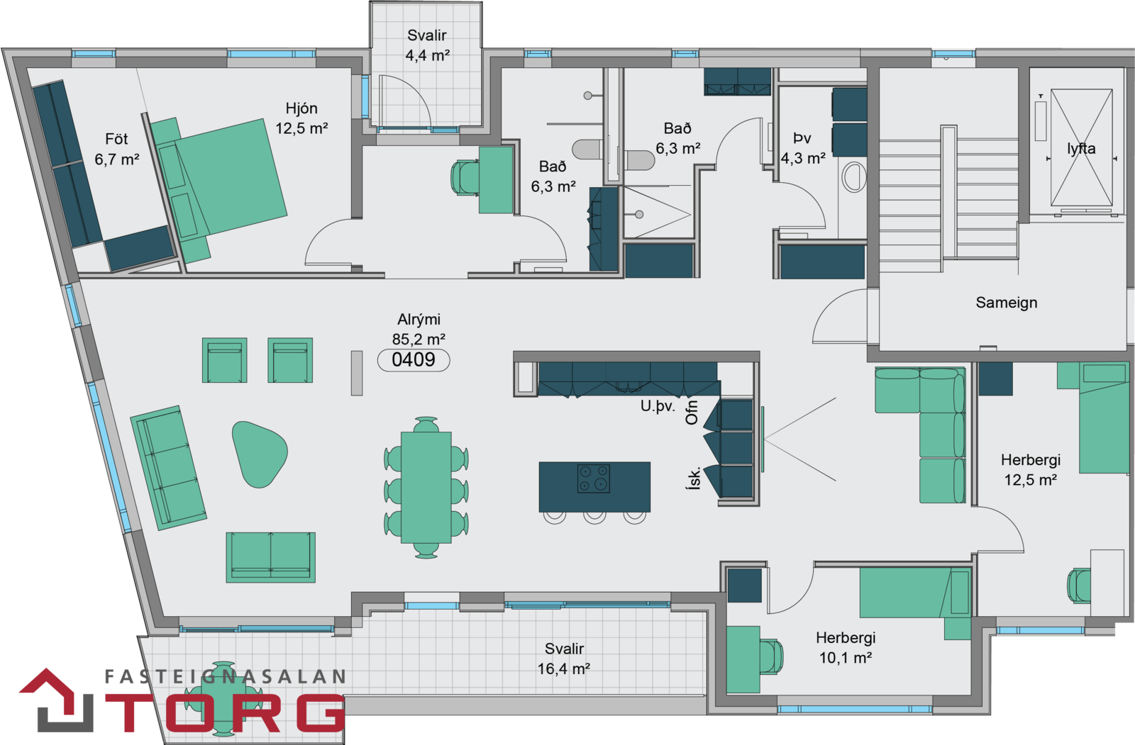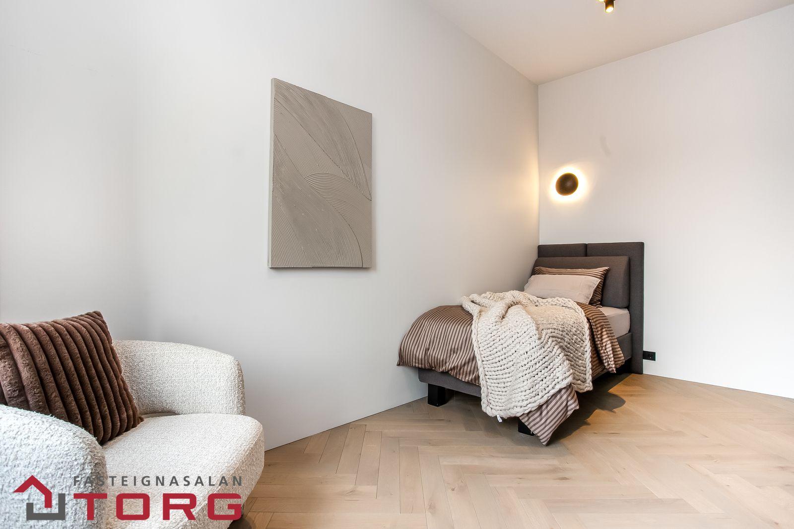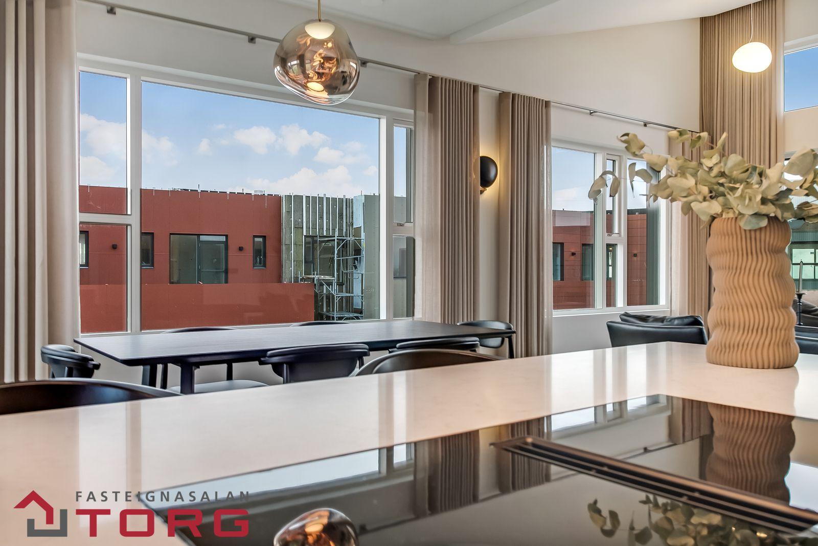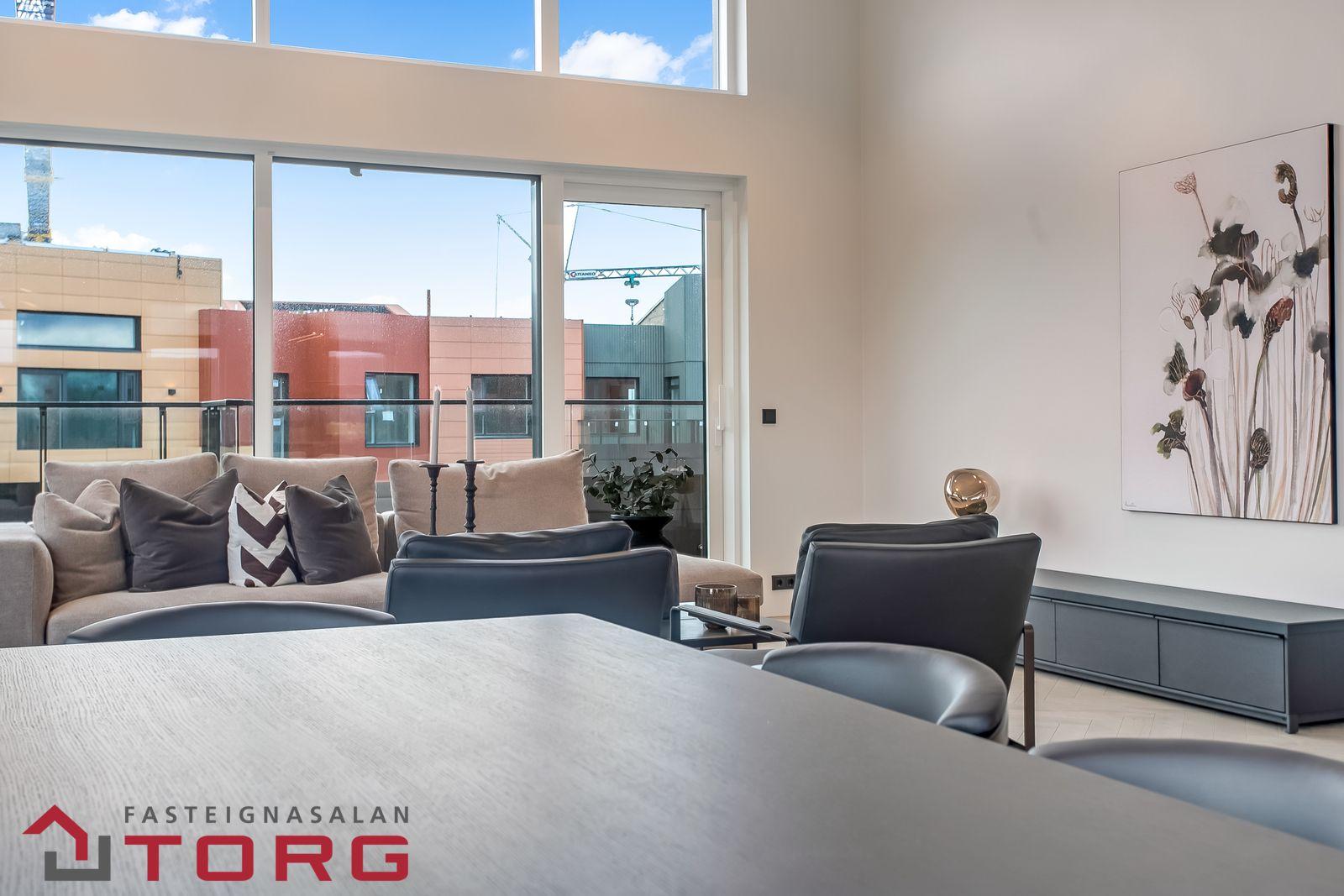 Fasteignasalan TORG kynnir: Loft-gæði / Hljóð-gæði / Birtu-gæði! Húsið í Svansvottunarferli! Um er að ræða góð 4ra herbergja íbúð á efstu hæð með tvennar svalir, bílskúr og tvö bílastæði í bílakjallara. Íbúð merkt:0409, og skilast fullbúin án gólfefna. Eignin er alls 235,4fm að stærð á 4. hæð í góðu lyftuhúsi. Íbúðin sjálf er skráð 177,7fm og skiptist í anddyri, alrými með eldhúsi og stofu með útgengi út á suður - þaksvalir um 16,4fm, og norðursvalir um 4,4fm, hjónasvíta með fataherbergi og baðherbergi inn af, 2 góð svefnherbergi, sjónvarpshol, rúmgott baðherbergi, sér þvottaherbergi, geymslu í sameign merkt: 0111, skráð 16,6fm. Bílksúr í sameign, merktur: 0110, skráður 41,1fm, ásamt tveimur bílstæðum í bílakjallara merkt: N04 og N05. Allar nánari upplýsingar, teikningar, og skilalýsingu er hægt að nálgast með að hafa samband við Guðný Ösp, fasteignasali í GSM: 665-8909 eða gudny@fstorg.is Sjá nánari upplýsingar á heimasíðu verkefnisins HÉR