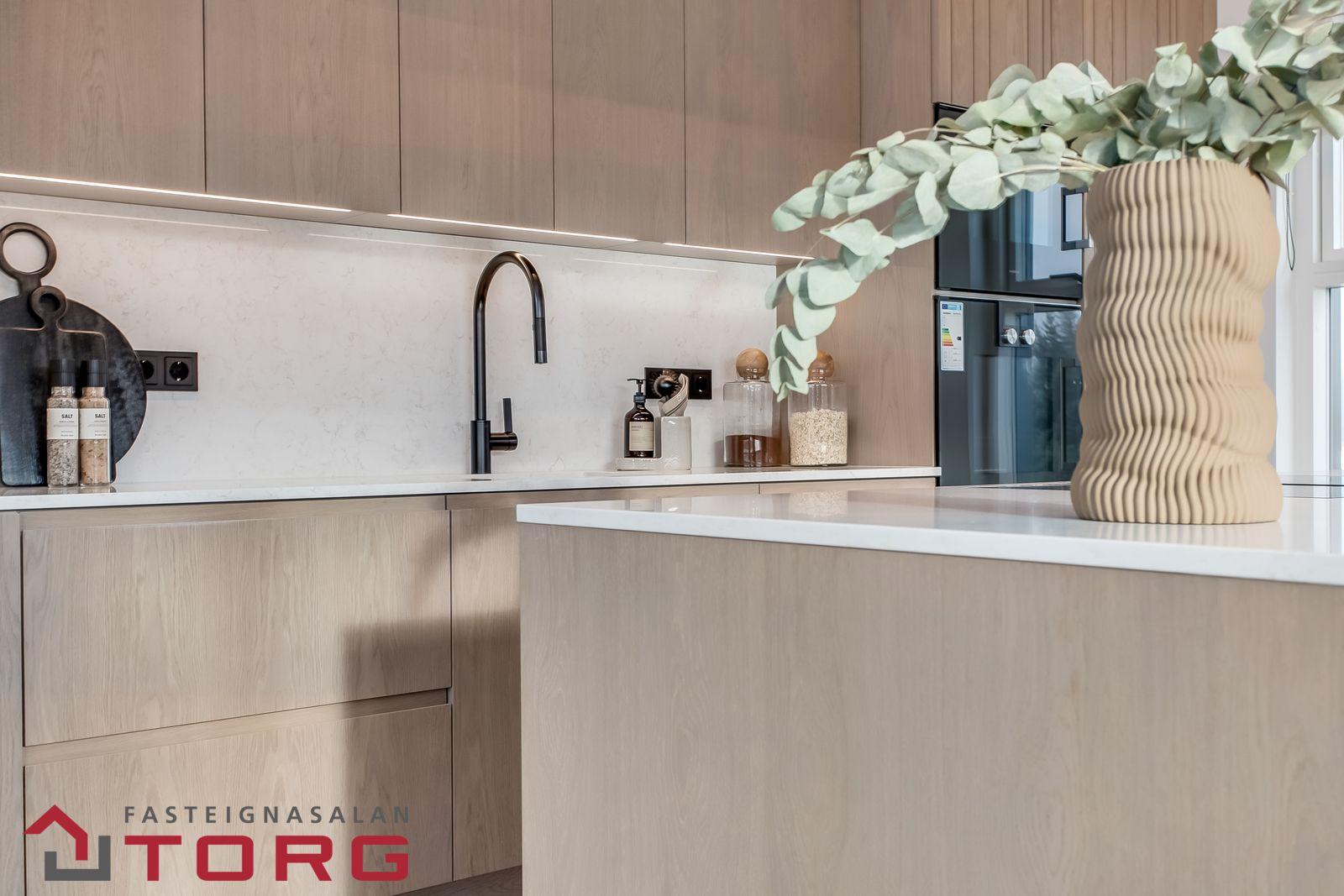 Kvarts steinn á borðplötum. Vönduð tæki eru í eldhúsi; innbyggður Siemens ísskápur, uppþvottavél. Gaggenau ofn og sambyggður ofn/örbylgjuofn (Combi ofn) í vinnuhæð, helluborð með innbyggðri viftu. Eldhús- og blöndunartæki að vandaðri gerð. Íbúðin skilast án gólfefna utan baðherbergja og þvottahús sem skilast flísalögð.