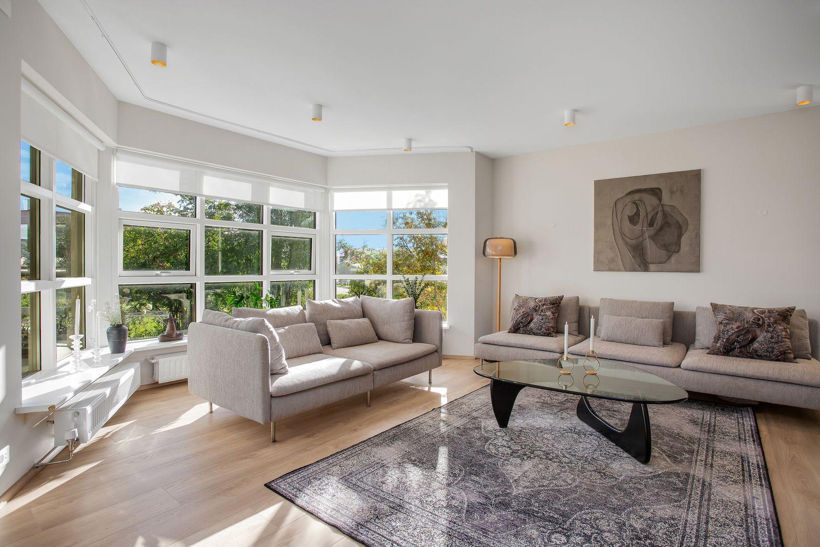 Nánari lýsing. Komið er inn í forstofu með flísum á gólfi og góðum fataskápum. Stór og björt stofa og borðstofa með nýlegu parketi á gólfi og gluggum á þrjá vegu. Gert ráð fyrir arin í stofu. Út frá stofu eru stórar skjólgóðar flísalagðar suðursvalir. Sérlega fallegt opið eldhús með fallegri IKEA innréttingu og dúk á gólfi. Þvottahús er við hlið eldhúss með flísum á gólfi og niðurfalli í gólfi.