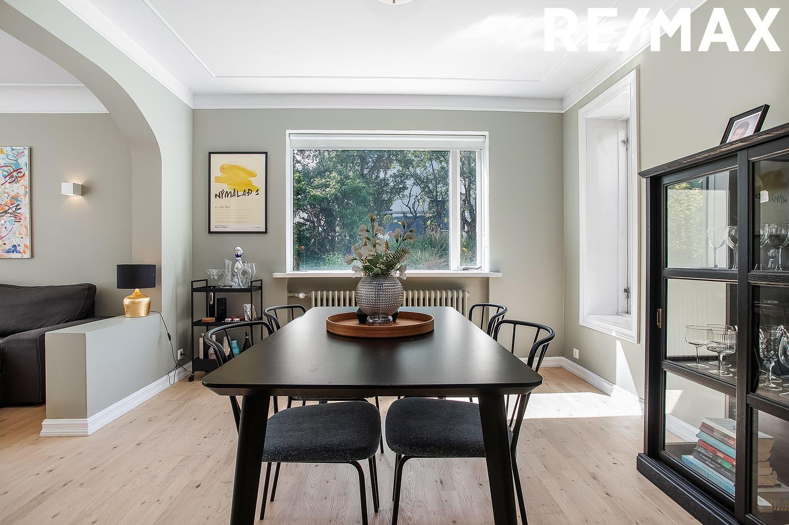 Borðstofa er rúmgóð með parketi á gólfi og þaðan er útgengt út í garð. Opið er á milli borðsstofu og stofu. Fallegir loftalistar og rósetta í kringum loftljós.