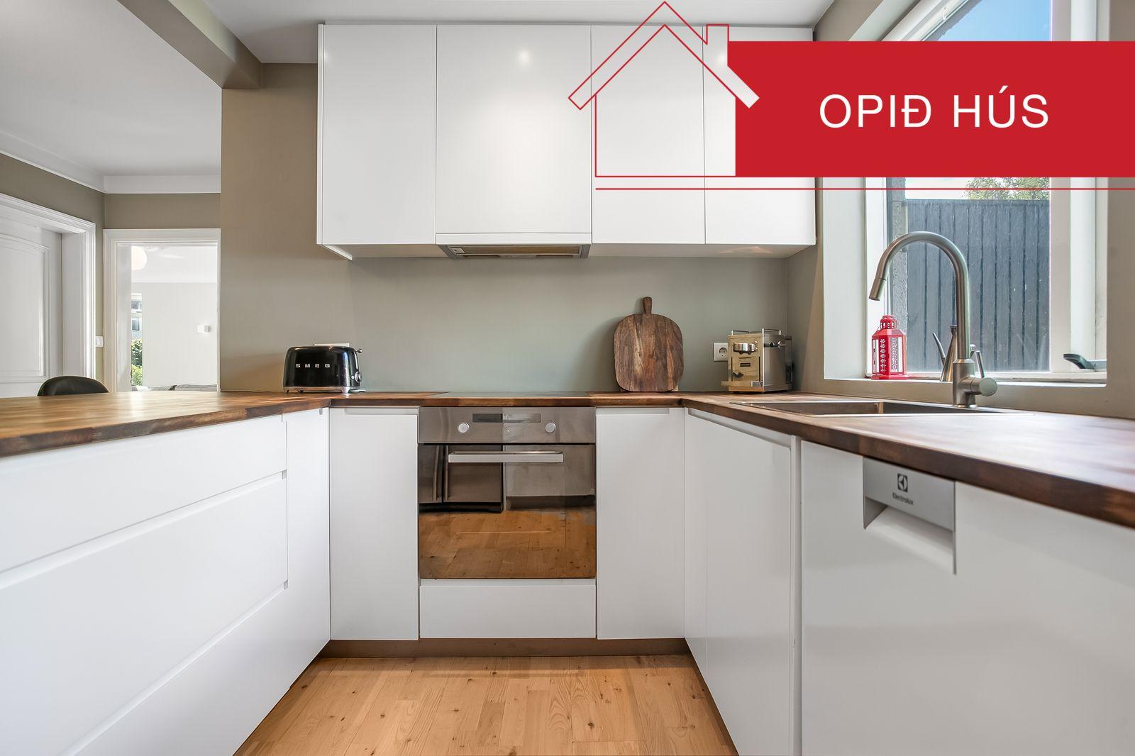 Eldhús hefur verið endurnýjað á afar smekklegan máta með hvítri eldhúsinnréttingu með viðar borðplötu. Tengi fyrir uppþvottavél og tvöfaldan ísskáp. Gott skápa- og vinnupláss. Góður gluggi er í eldhúsi sem gerir það einstaklega bjart og fallegt. Parket á gólfi. Innangent í þvottahús er úr eldhúsi.