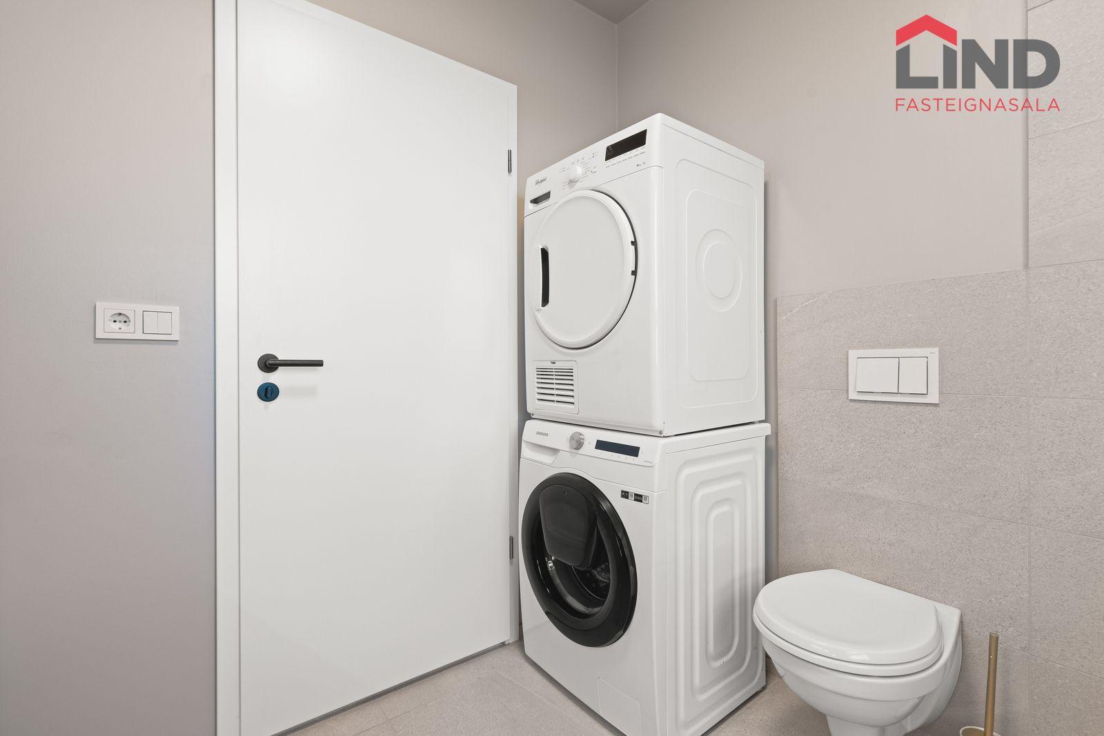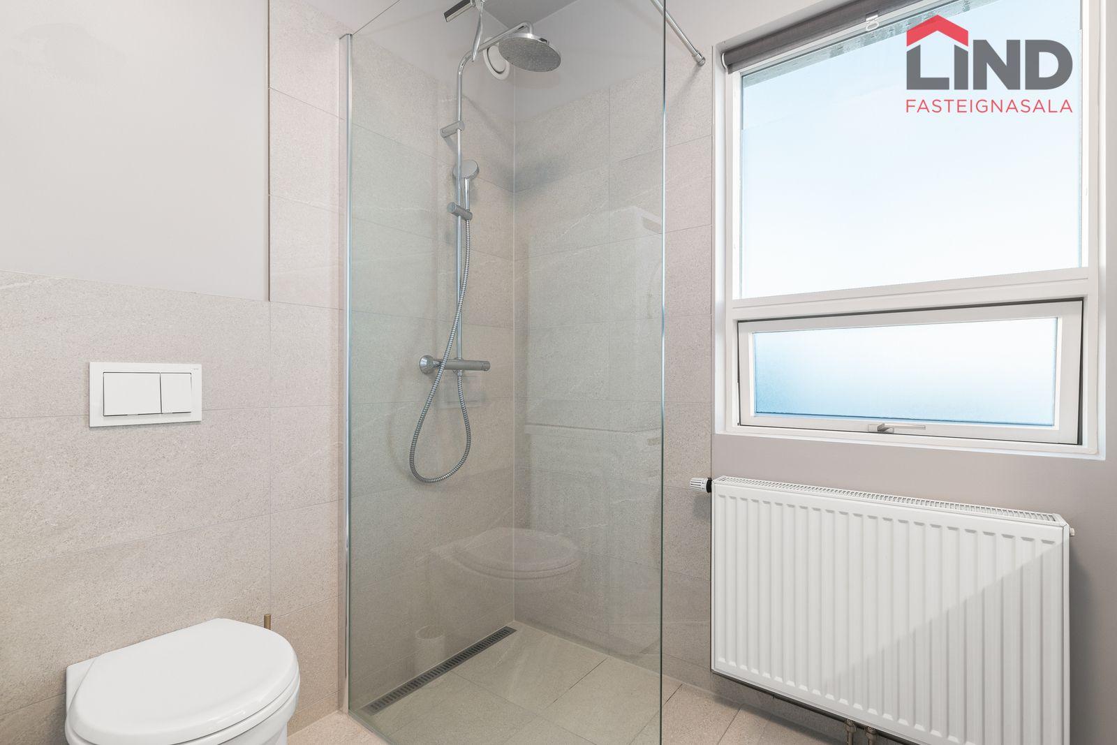 Baðherbergi: með flísum á hluta veggja, Walk-in sturta með glerþili, innrétting frá Voké-III, tengi fyrir þvottavél og barkalausan þurrkara.