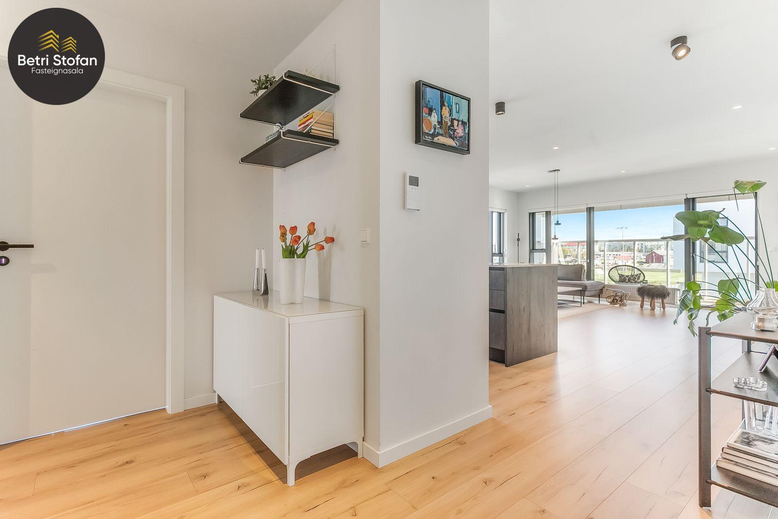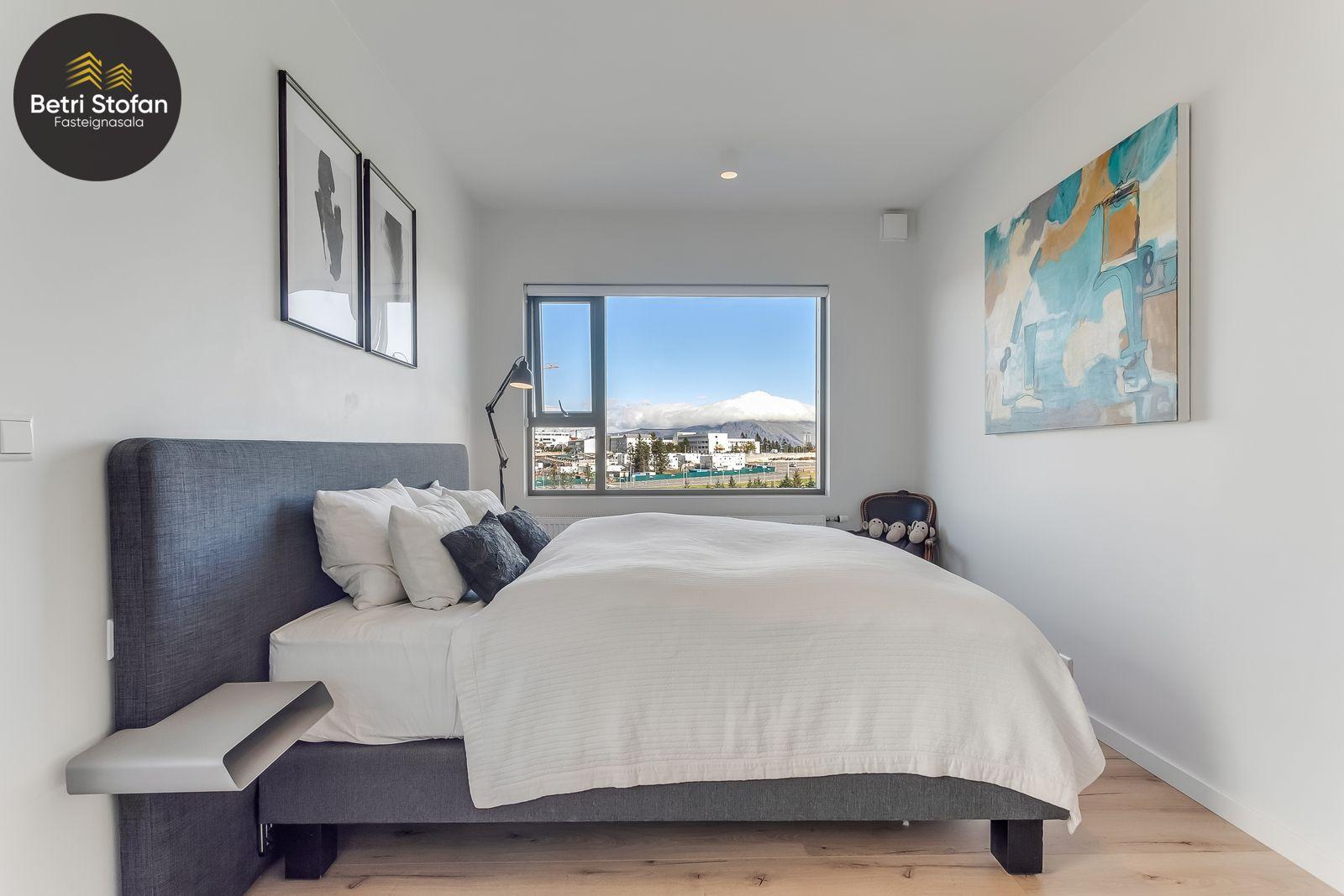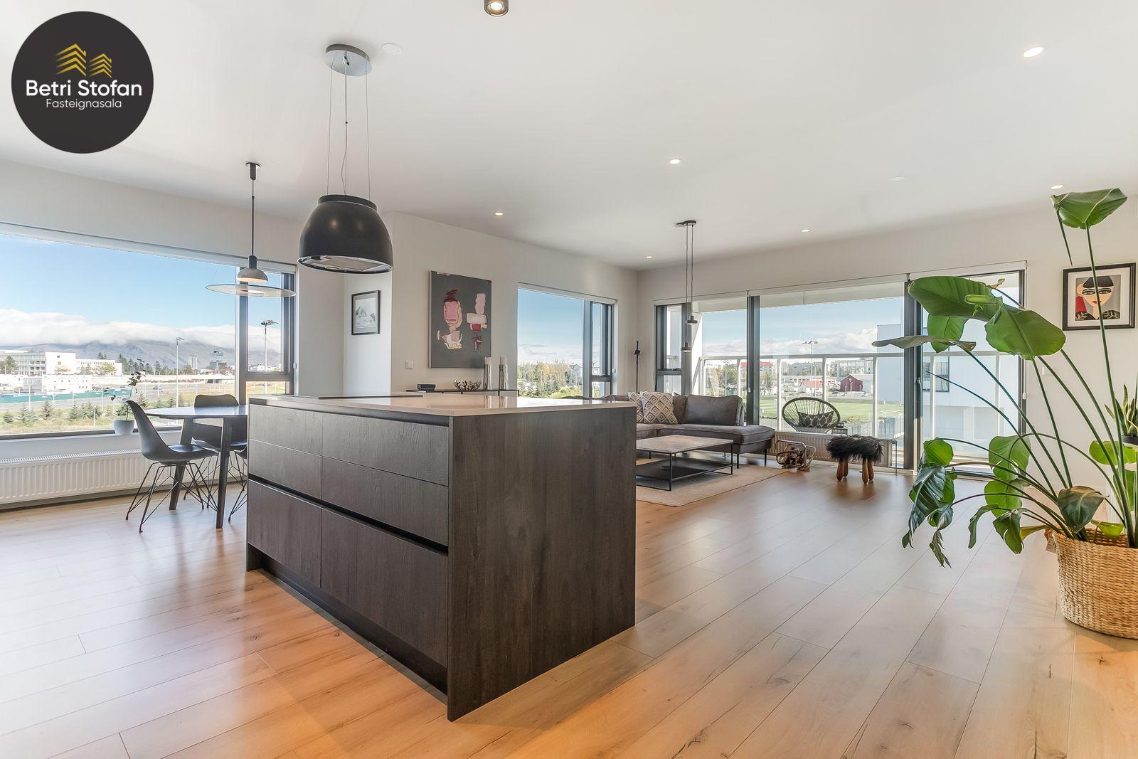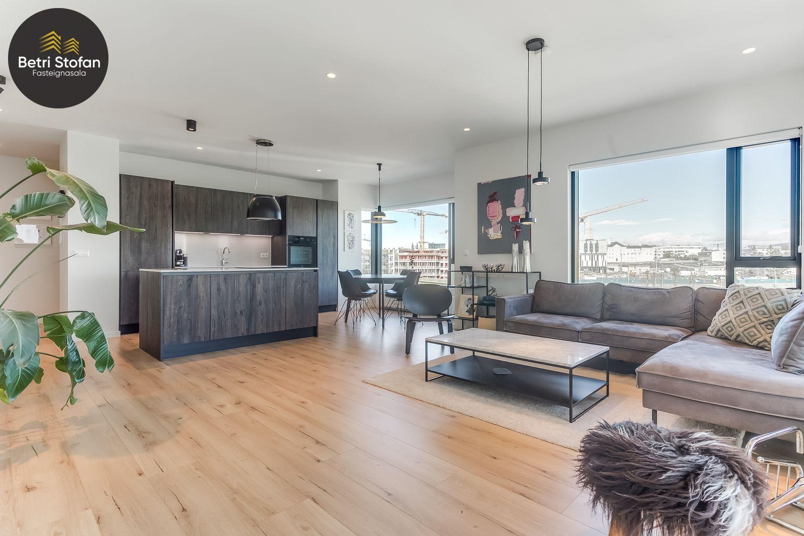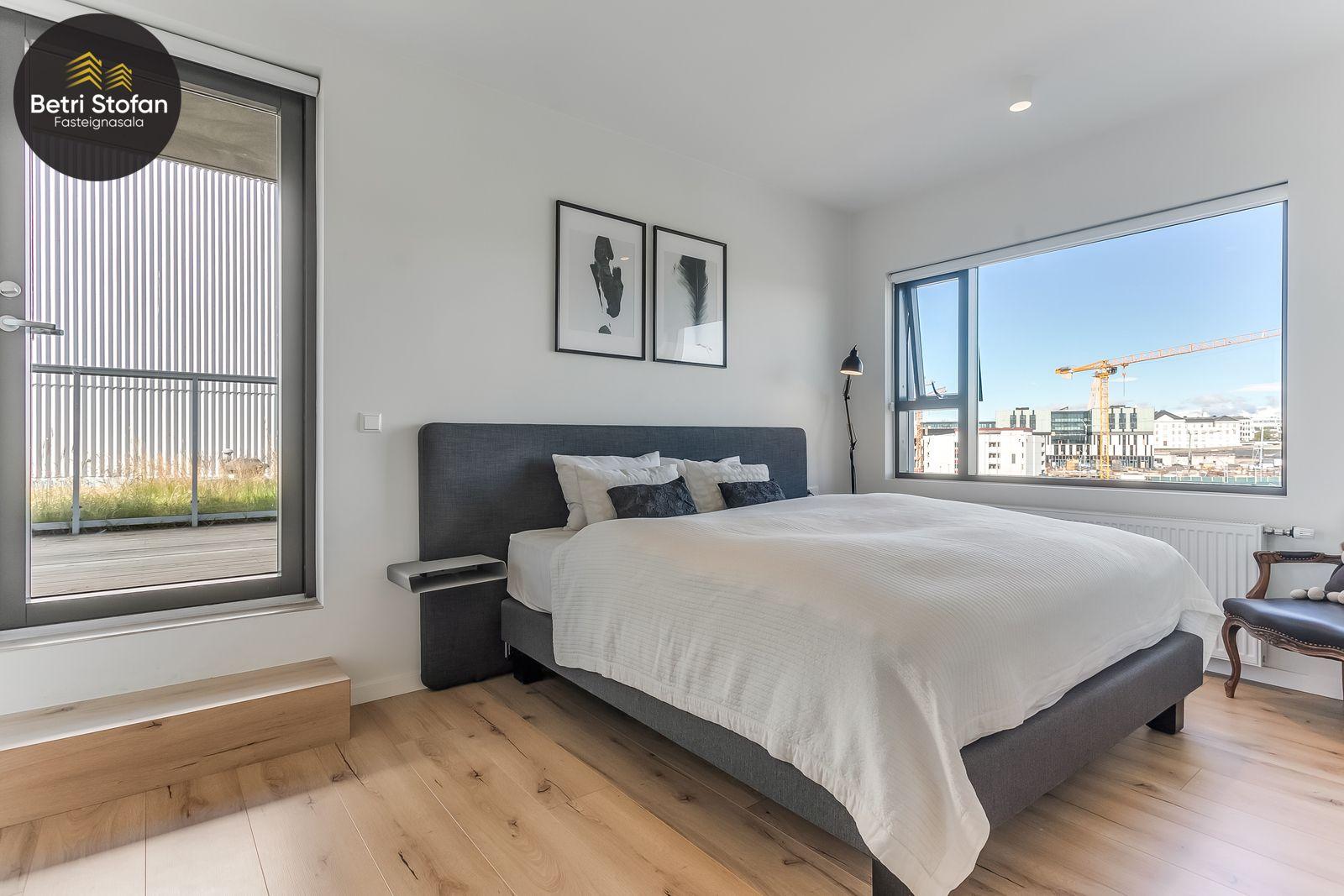 Nánari lýsing: Komið er inn í forstofu með fataskápum. Stofan er sérstaklega björt með gólfsíðum gluggum á tvo vegu. Mikið útsýni er úr stofu. Svalir eru útaf stofu til austurs. Eldhúsið er samliggjandi við stofuna. Mjög falleg innrétting frá Parka er í eldhúsi með stórum vinnuborðum. Ljós kvarts steinn er á vinnuborðum. Innbyggð heimilistæki sem fylgja íbúðinni. HAF STUDIO sá um efnisval. Hjónaherbergið er mjög rúmgott með fataherbergi innaf. 40 fm þaksvalir eru útaf herbergi til suðvesturs, gert er ráð fyrir rafmagnspotti. Glæsilegt útsýni. Tvö önnur svefnherbergi, bæði rúmgóð með skápum. Baðherbergið er flísalagt og með gólfhita. Falleg innrétting með kvarts steini. Baðkar með sturtuaðstöðu. Þvottahúsið er innaf baðherbergi með flísum á gólfum. Á allri íbúðinni er vandað parket fyrir utan votrými þar sem eru flísar. Skápar og hurðar eru frá Parka.
