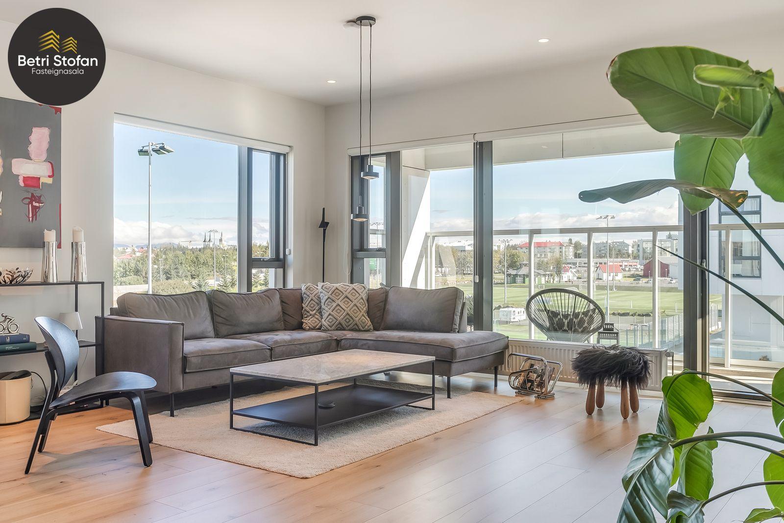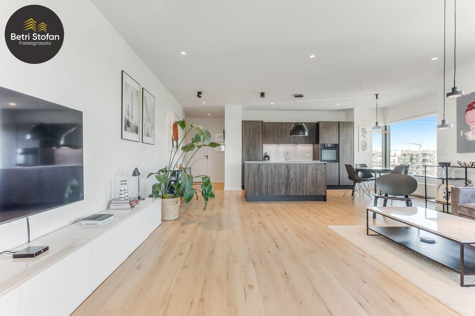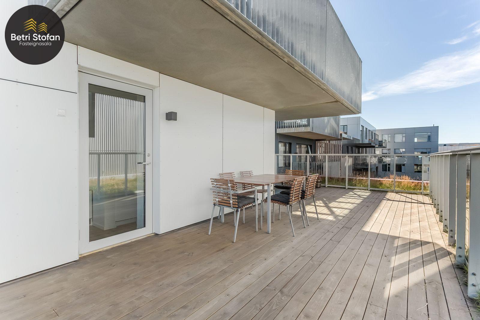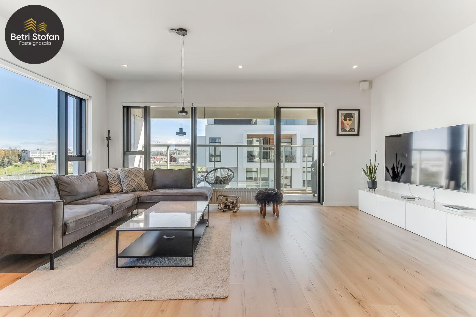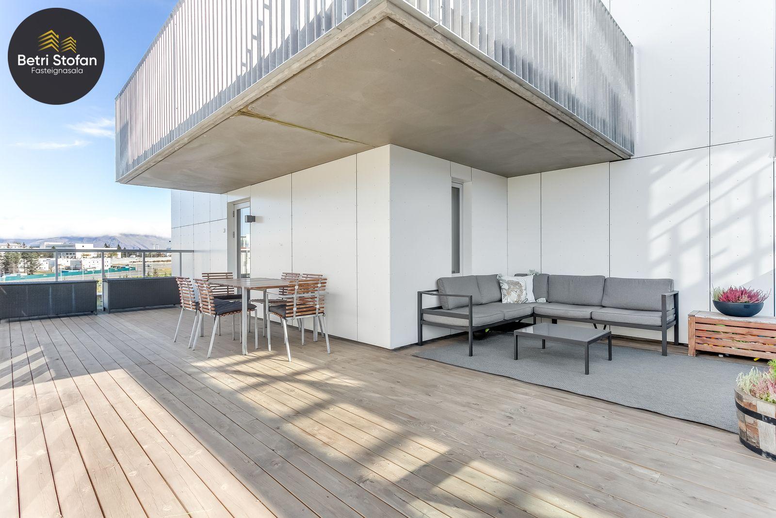 Nánari lýsing: Komið er inn í forstofu með fataskápum. Stofan er sérstaklega björt með gólfsíðum gluggum á tvo vegu. Mikið útsýni er úr stofu. Svalir eru útaf stofu til austurs. Eldhúsið er samliggjandi við stofuna. Mjög falleg innrétting frá Parka er í eldhúsi með stórum vinnuborðum. Ljós kvarts steinn er á vinnuborðum. Innbyggð heimilistæki sem fylgja íbúðinni. HAF STUDIO sá um efnisval. Hjónaherbergið er mjög rúmgott með fataherbergi innaf. 40 fm þaksvalir eru útaf herbergi til suðvesturs, gert er ráð fyrir rafmagnspotti. Glæsilegt útsýni. Tvö önnur svefnherbergi, bæði rúmgóð með skápum. Baðherbergið er flísalagt og með gólfhita. Falleg innrétting með kvarts steini. Baðkar með sturtuaðstöðu. Þvottahúsið er innaf baðherbergi með flísum á gólfum. Á allri íbúðinni er vandað parket fyrir utan votrými þar sem eru flísar. Skápar og hurðar eru frá Parka.