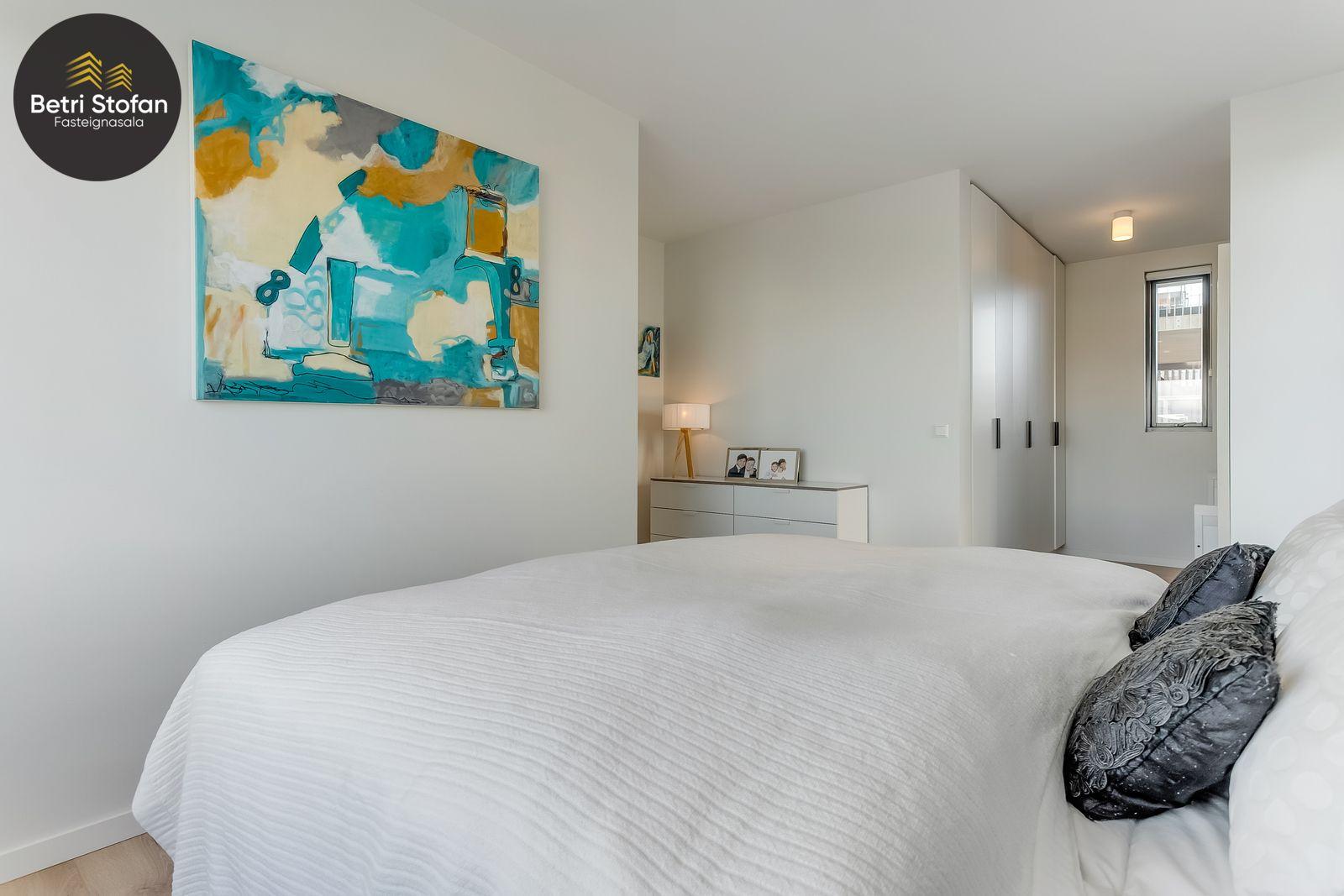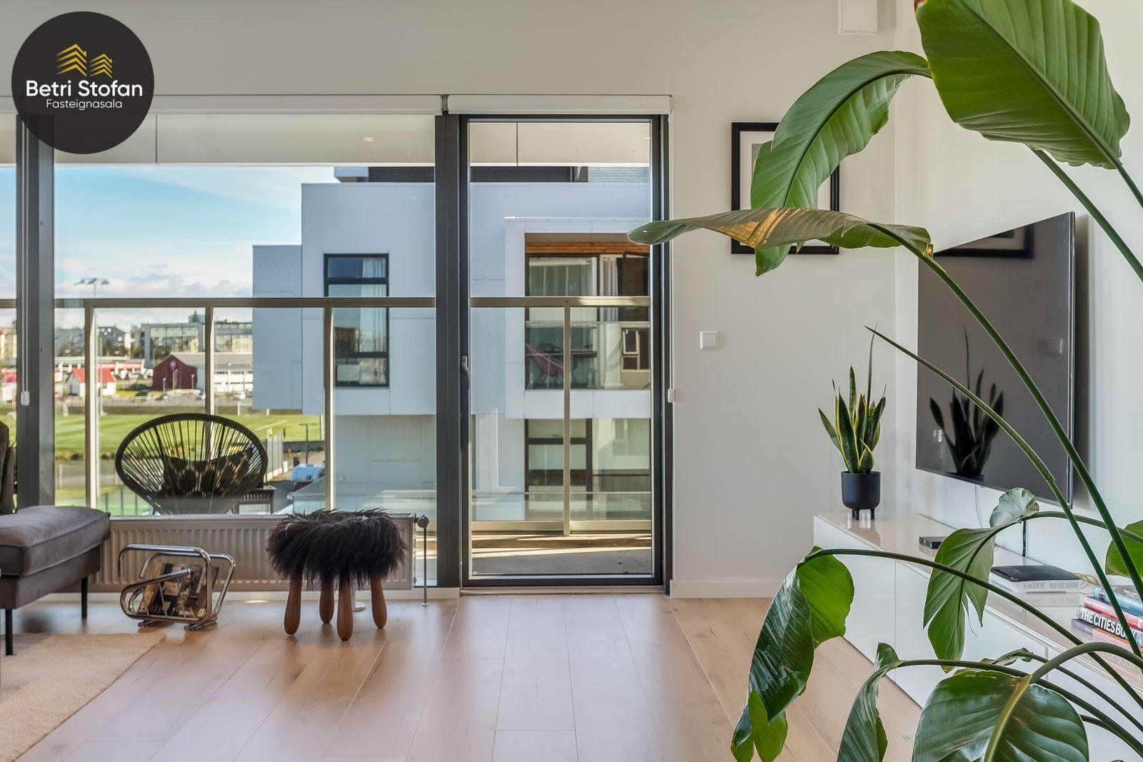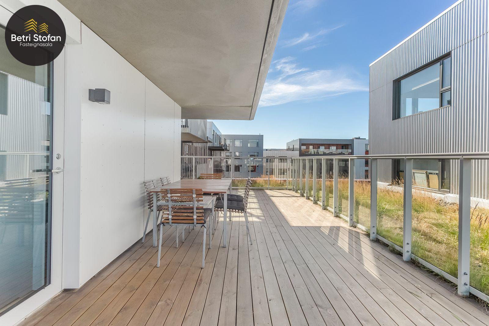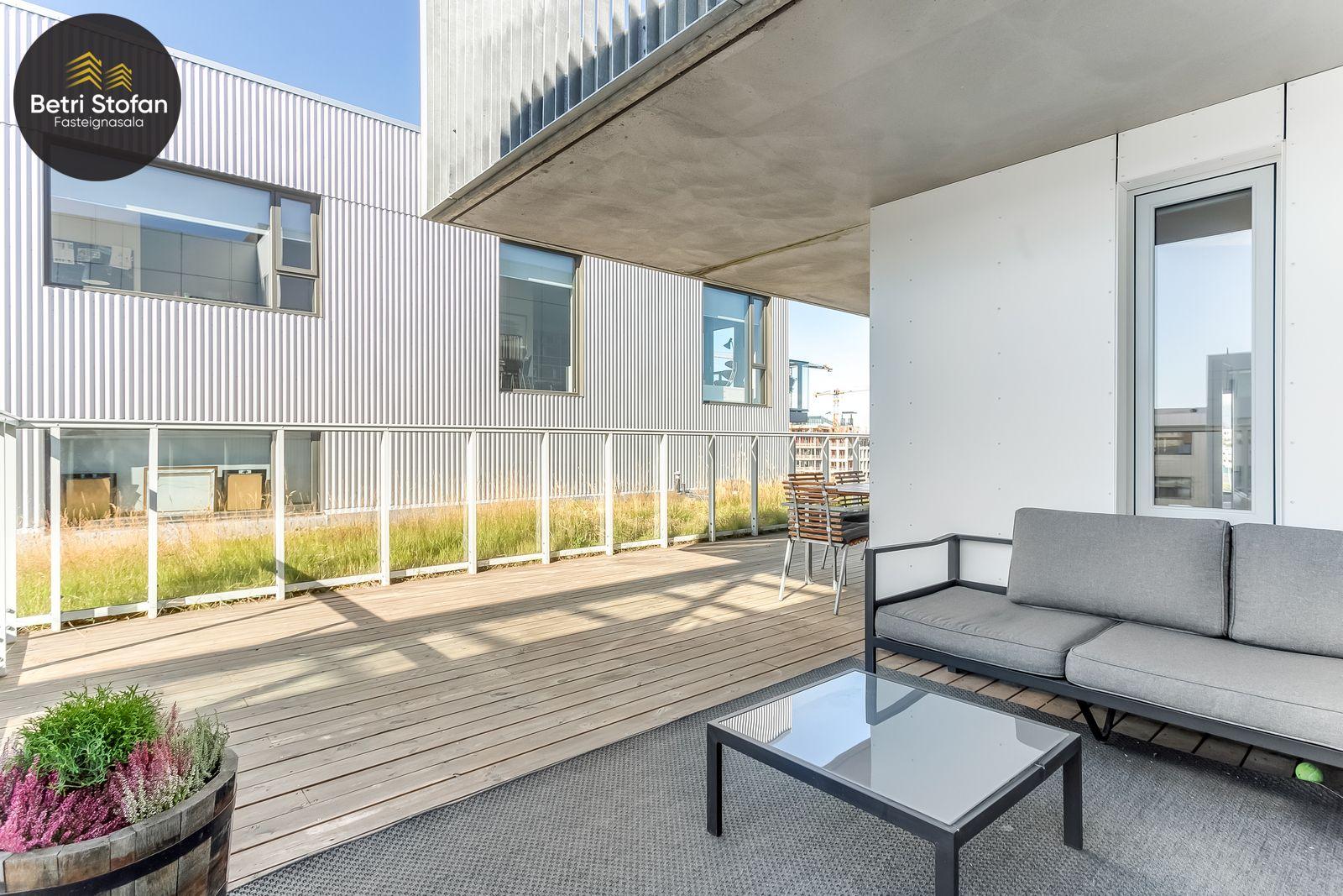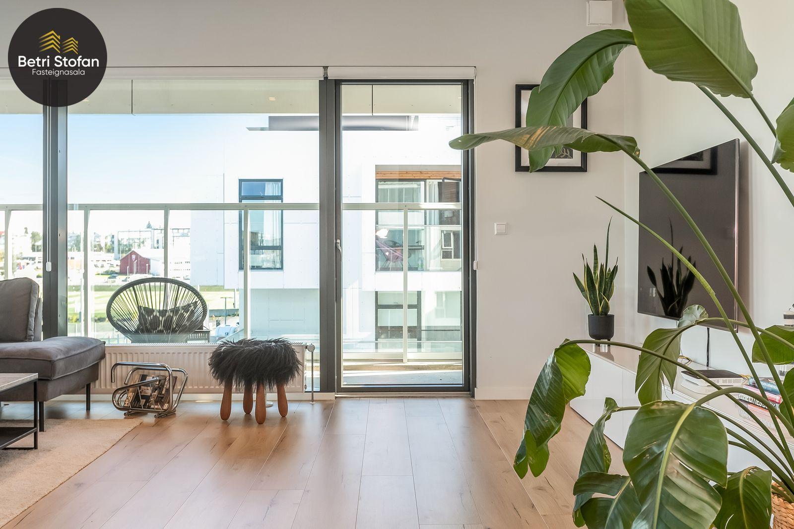 Nánari lýsing: Komið er inn í forstofu með fataskápum. Stofan er sérstaklega björt með gólfsíðum gluggum á tvo vegu. Mikið útsýni er úr stofu. Svalir eru útaf stofu til austurs. Eldhúsið er samliggjandi við stofuna. Mjög falleg innrétting frá Parka er í eldhúsi með stórum vinnuborðum. Ljós kvarts steinn er á vinnuborðum. Innbyggð heimilistæki sem fylgja íbúðinni. HAF STUDIO sá um efnisval. Hjónaherbergið er mjög rúmgott með fataherbergi innaf. 40 fm þaksvalir eru útaf herbergi til suðvesturs, gert er ráð fyrir rafmagnspotti. Glæsilegt útsýni. Tvö önnur svefnherbergi, bæði rúmgóð með skápum. Baðherbergið er flísalagt og með gólfhita. Falleg innrétting með kvarts steini. Baðkar með sturtuaðstöðu. Þvottahúsið er innaf baðherbergi með flísum á gólfum. Á allri íbúðinni er vandað parket fyrir utan votrými þar sem eru flísar. Skápar og hurðar eru frá Parka.