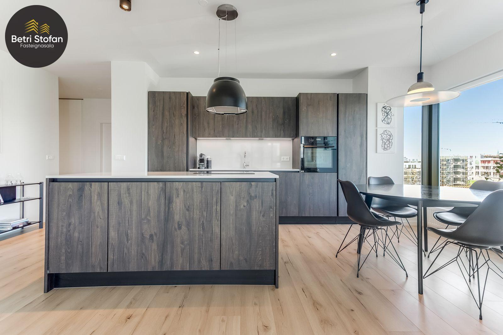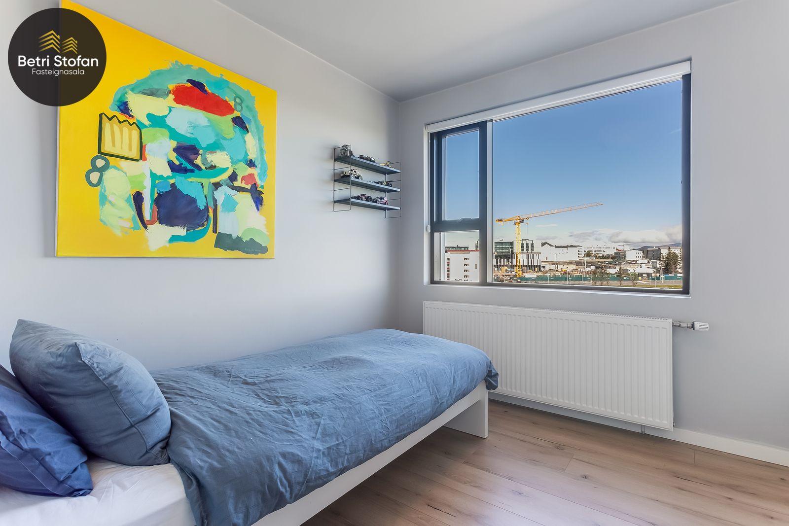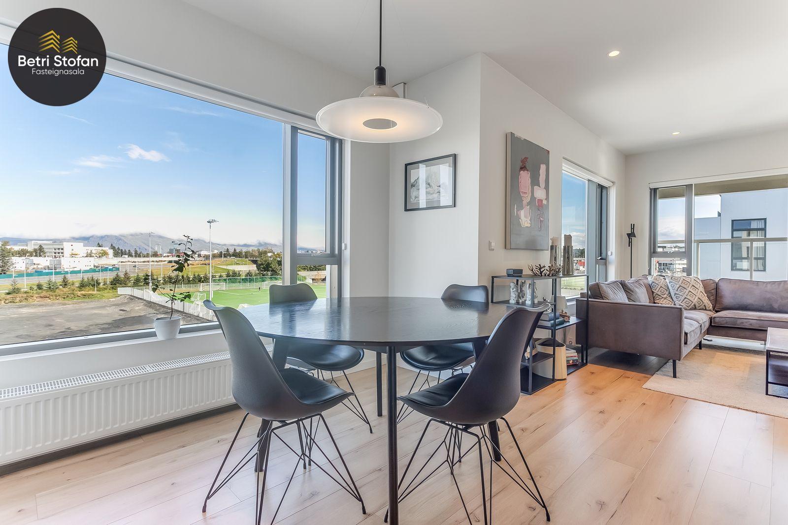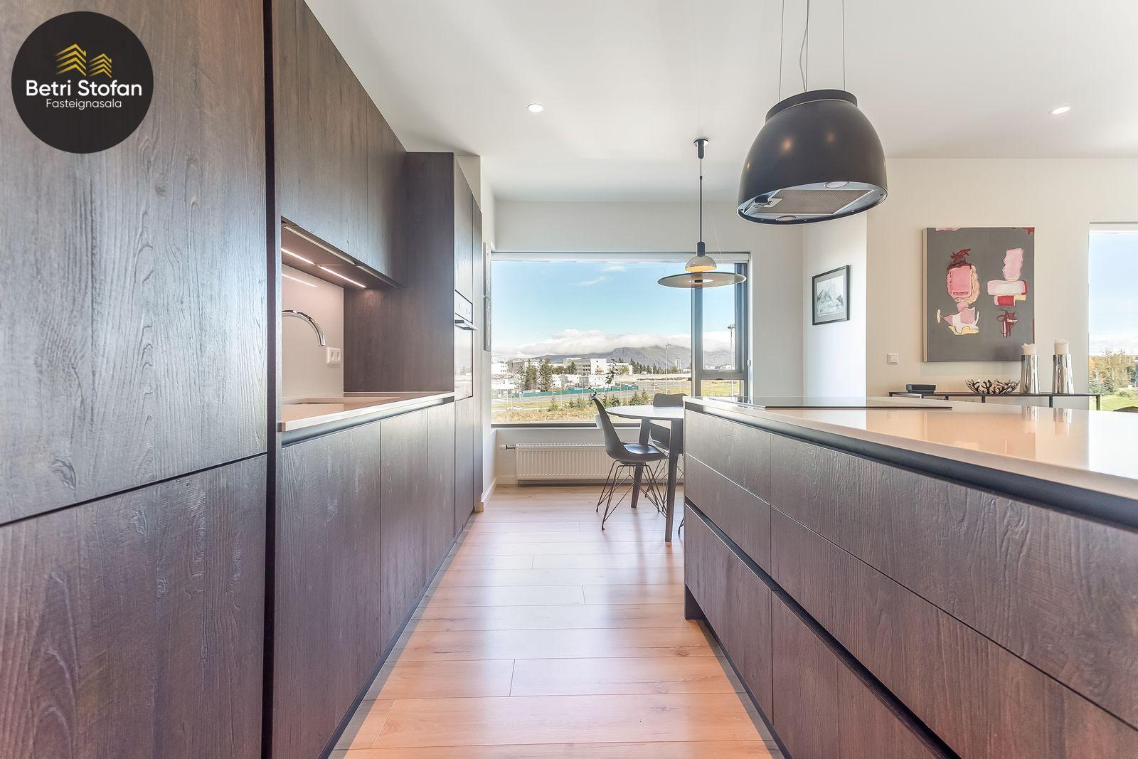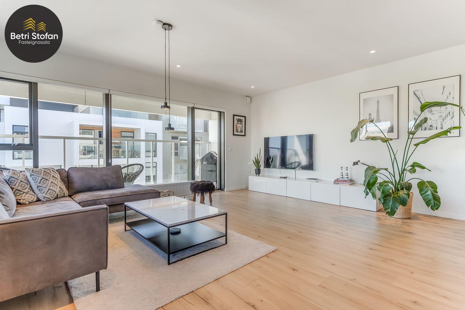 Nánari lýsing: Komið er inn í forstofu með fataskápum. Stofan er sérstaklega björt með gólfsíðum gluggum á tvo vegu. Mikið útsýni er úr stofu. Svalir eru útaf stofu til austurs. Eldhúsið er samliggjandi við stofuna. Mjög falleg innrétting frá Parka er í eldhúsi með stórum vinnuborðum. Ljós kvarts steinn er á vinnuborðum. Innbyggð heimilistæki sem fylgja íbúðinni. HAF STUDIO sá um efnisval. Hjónaherbergið er mjög rúmgott með fataherbergi innaf. 40 fm þaksvalir eru útaf herbergi til suðvesturs, gert er ráð fyrir rafmagnspotti. Glæsilegt útsýni. Tvö önnur svefnherbergi, bæði rúmgóð með skápum. Baðherbergið er flísalagt og með gólfhita. Falleg innrétting með kvarts steini. Baðkar með sturtuaðstöðu. Þvottahúsið er innaf baðherbergi með flísum á gólfum. Á allri íbúðinni er vandað parket fyrir utan votrými þar sem eru flísar. Skápar og hurðar eru frá Parka.