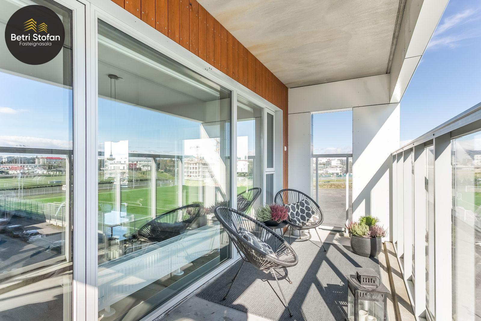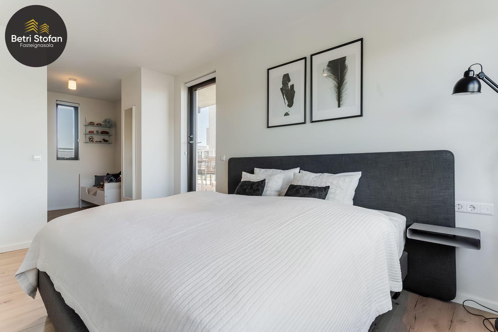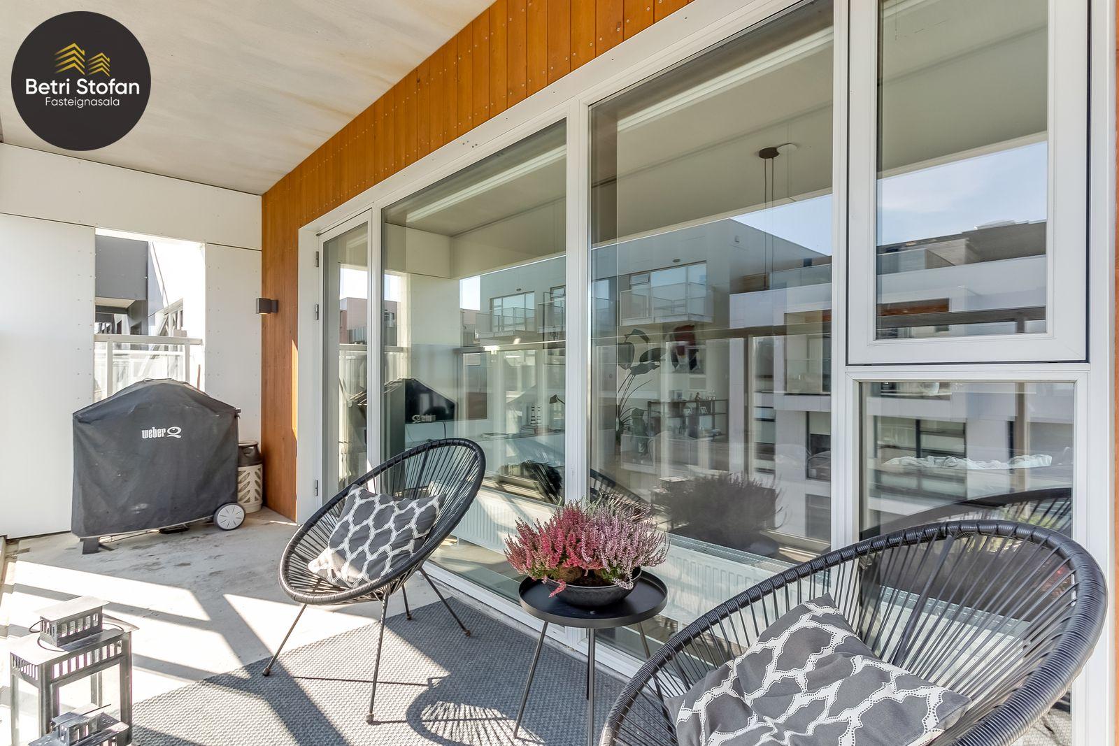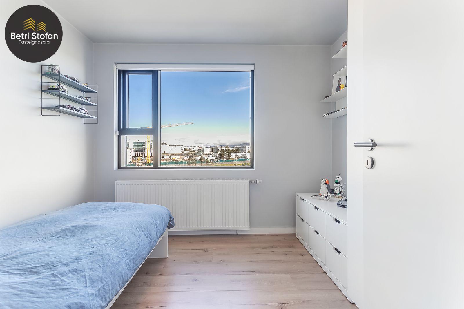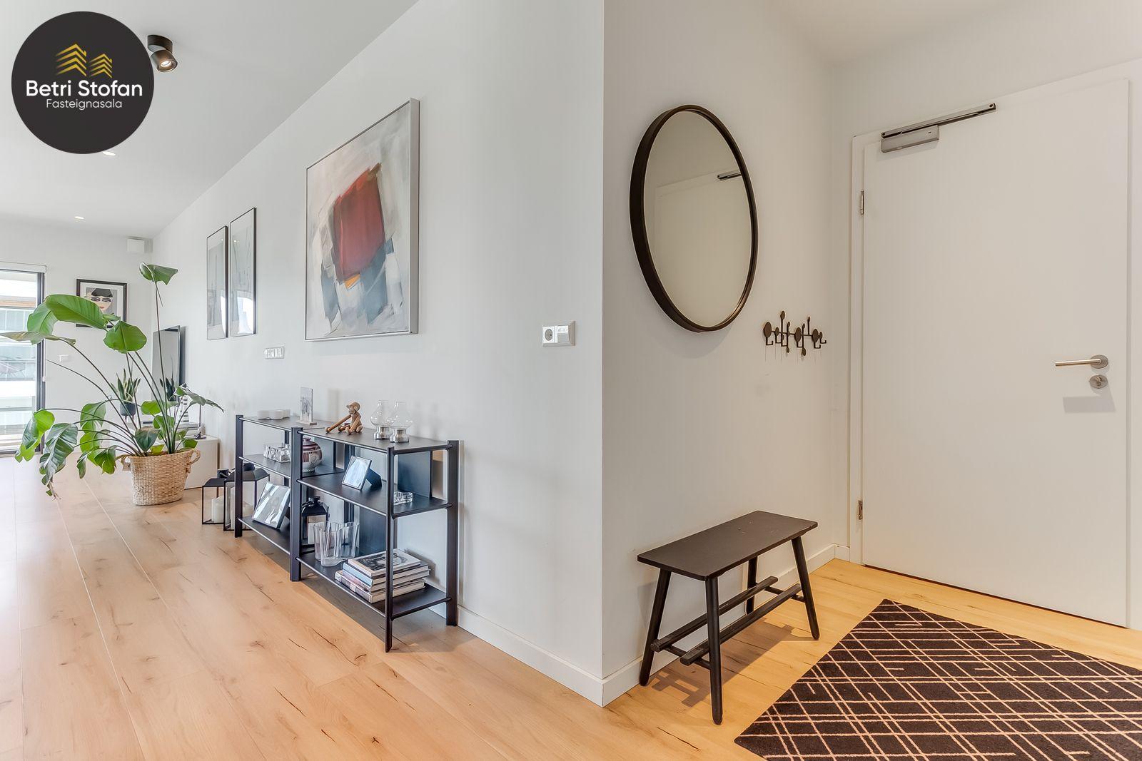Nánari lýsing: Komið er inn í forstofu með fataskápum. Stofan er sérstaklega björt með gólfsíðum gluggum á tvo vegu. Mikið útsýni er úr stofu. Svalir eru útaf stofu til austurs. Eldhúsið er samliggjandi við stofuna. Mjög falleg innrétting frá Parka er í eldhúsi með stórum vinnuborðum. Ljós kvarts steinn er á vinnuborðum. Innbyggð heimilistæki sem fylgja íbúðinni. HAF STUDIO sá um efnisval. Hjónaherbergið er mjög rúmgott með fataherbergi innaf. 40 fm þaksvalir eru útaf herbergi til suðvesturs, gert er ráð fyrir rafmagnspotti. Glæsilegt útsýni. Tvö önnur svefnherbergi, bæði rúmgóð með skápum. Baðherbergið er flísalagt og með gólfhita. Falleg innrétting með kvarts steini. Baðkar með sturtuaðstöðu. Þvottahúsið er innaf baðherbergi með flísum á gólfum. Á allri íbúðinni er vandað parket fyrir utan votrými þar sem eru flísar. Skápar og hurðar eru frá Parka.