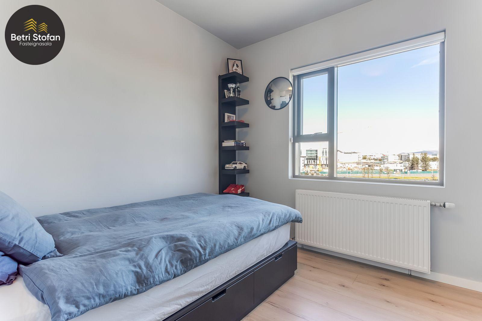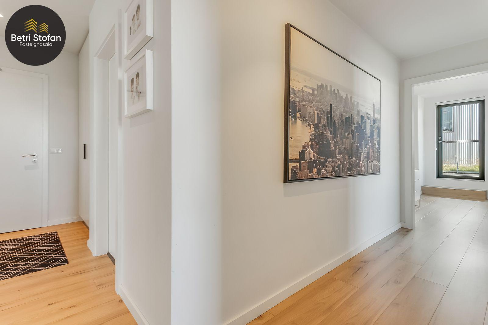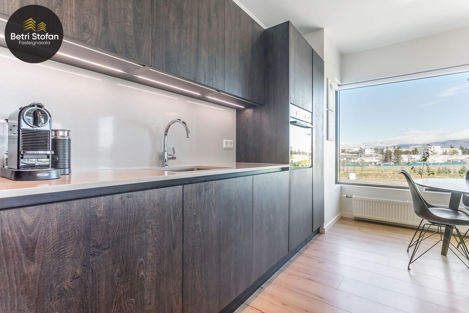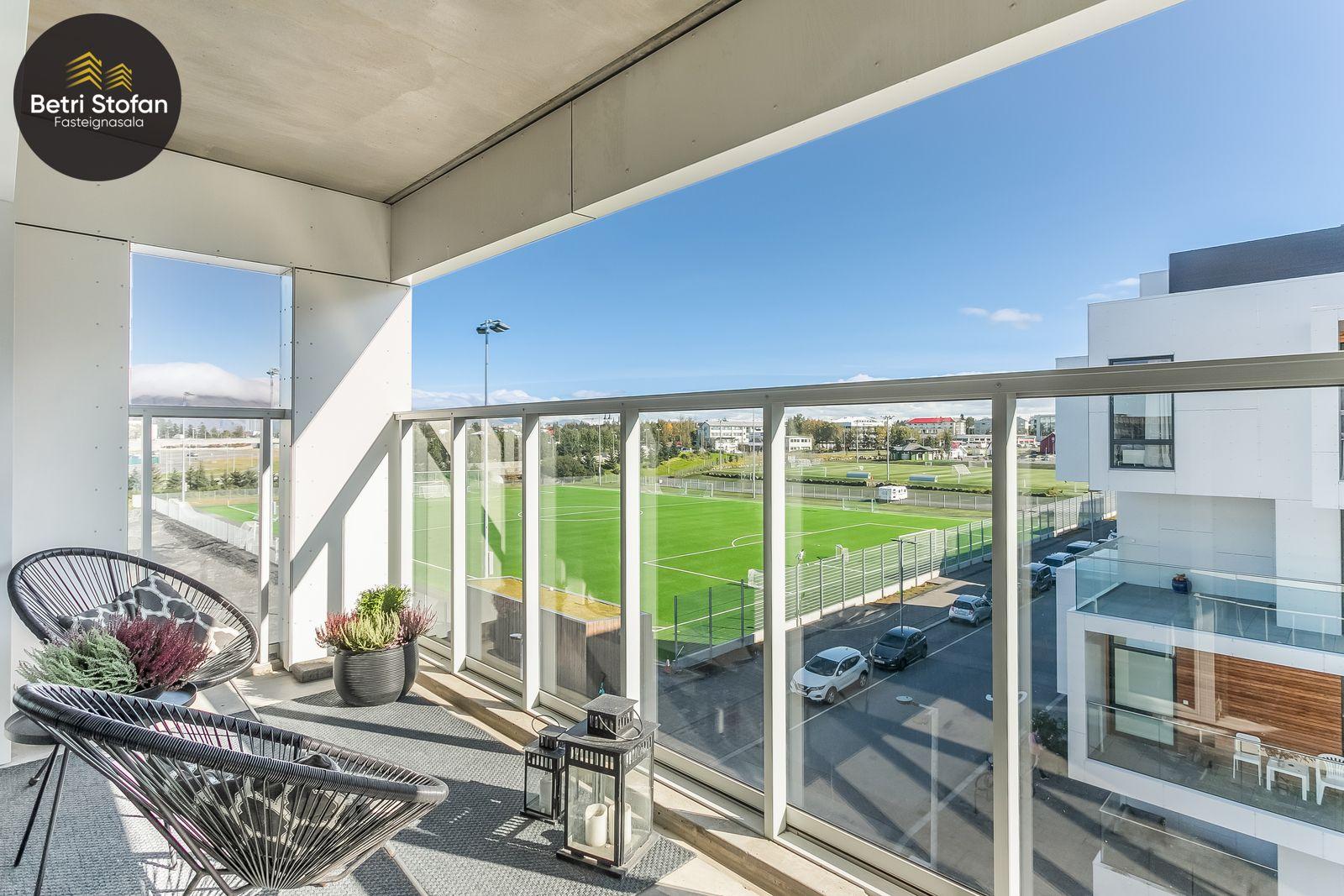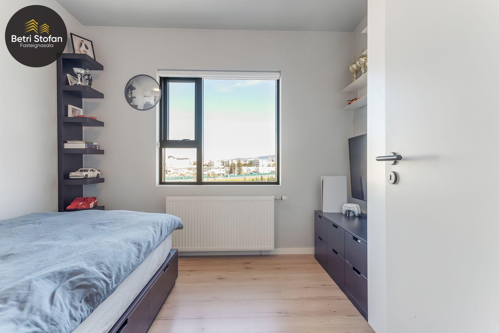 Nánari lýsing: Komið er inn í forstofu með fataskápum. Stofan er sérstaklega björt með gólfsíðum gluggum á tvo vegu. Mikið útsýni er úr stofu. Svalir eru útaf stofu til austurs. Eldhúsið er samliggjandi við stofuna. Mjög falleg innrétting frá Parka er í eldhúsi með stórum vinnuborðum. Ljós kvarts steinn er á vinnuborðum. Innbyggð heimilistæki sem fylgja íbúðinni. HAF STUDIO sá um efnisval. Hjónaherbergið er mjög rúmgott með fataherbergi innaf. 40 fm þaksvalir eru útaf herbergi til suðvesturs, gert er ráð fyrir rafmagnspotti. Glæsilegt útsýni. Tvö önnur svefnherbergi, bæði rúmgóð með skápum. Baðherbergið er flísalagt og með gólfhita. Falleg innrétting með kvarts steini. Baðkar með sturtuaðstöðu. Þvottahúsið er innaf baðherbergi með flísum á gólfum. Á allri íbúðinni er vandað parket fyrir utan votrými þar sem eru flísar. Skápar og hurðar eru frá Parka.