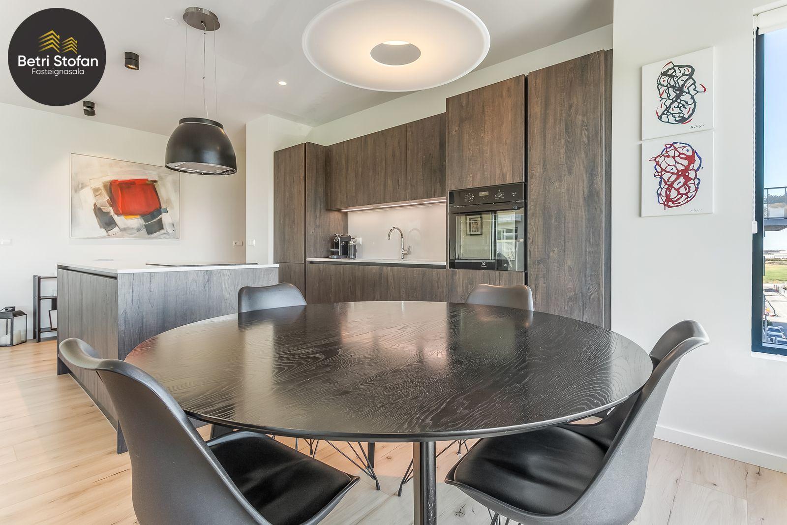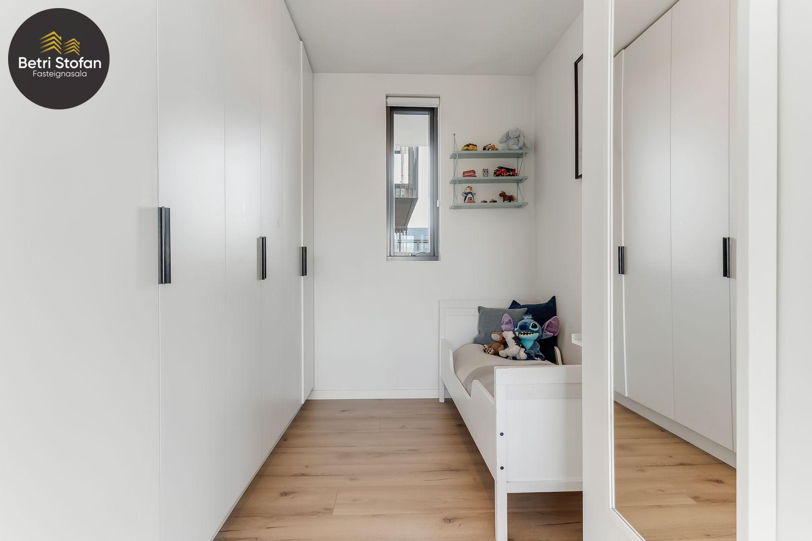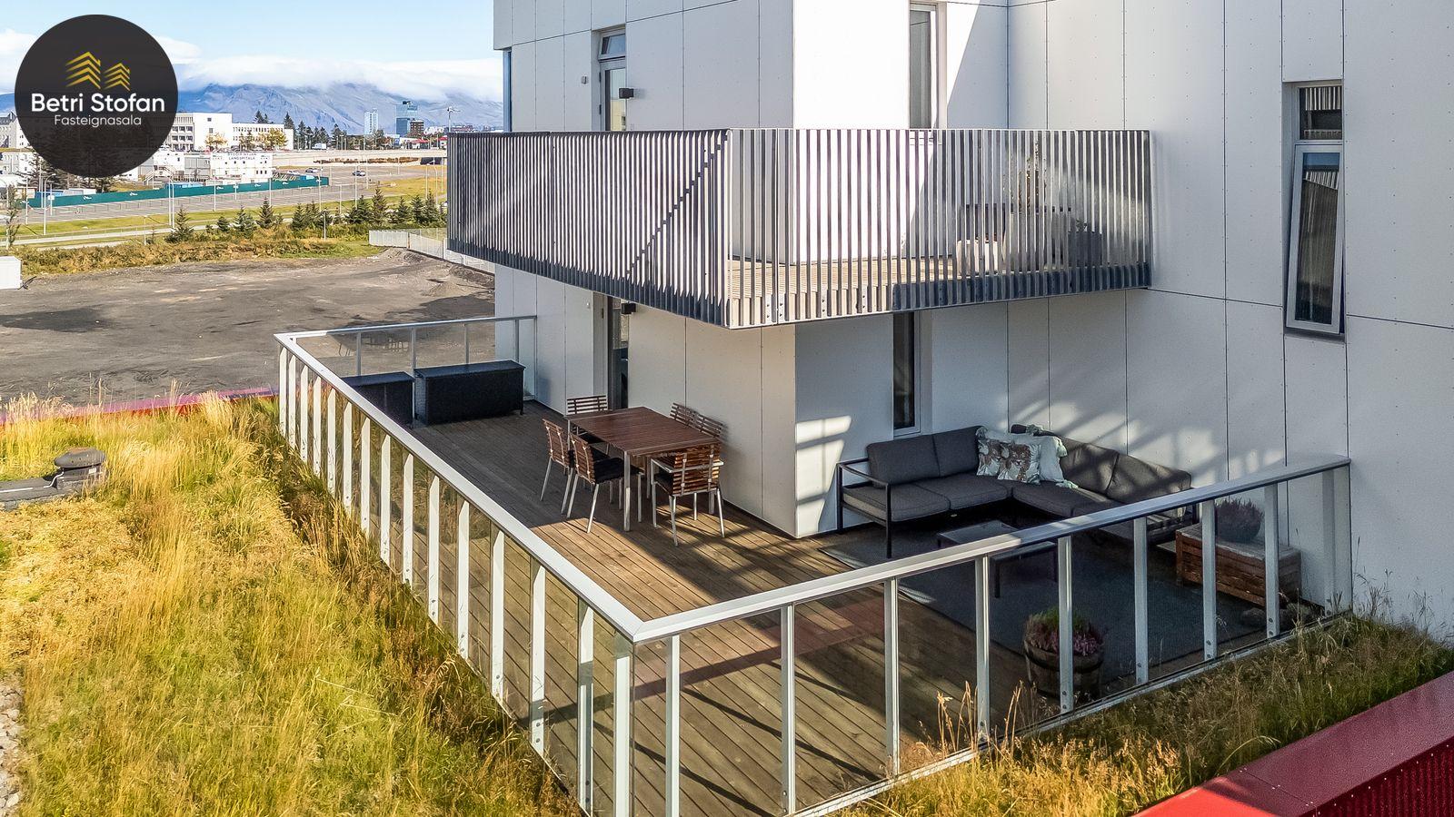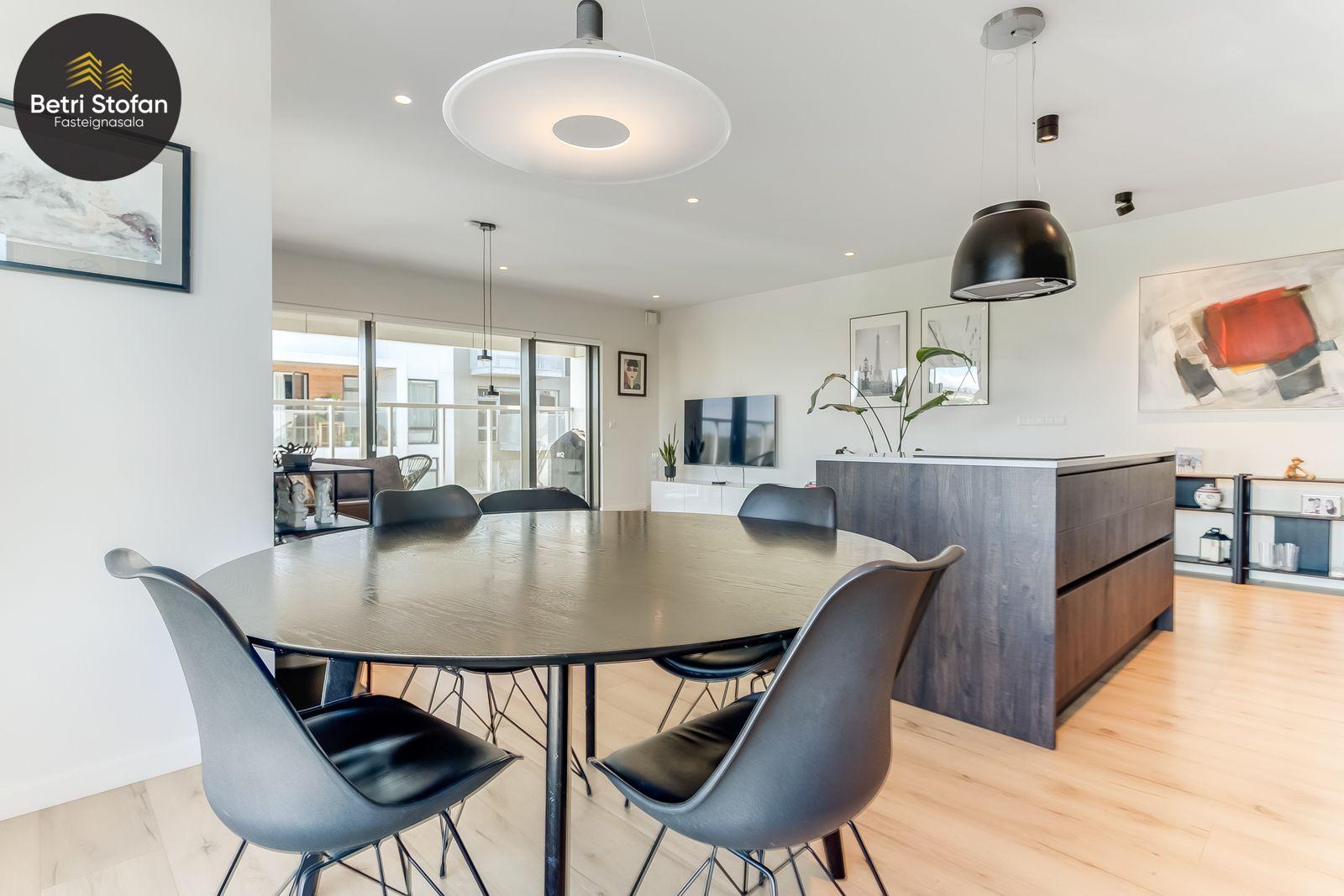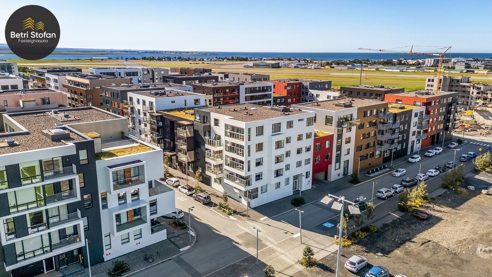 Nánari lýsing: Komið er inn í forstofu með fataskápum. Stofan er sérstaklega björt með gólfsíðum gluggum á tvo vegu. Mikið útsýni er úr stofu. Svalir eru útaf stofu til austurs. Eldhúsið er samliggjandi við stofuna. Mjög falleg innrétting frá Parka er í eldhúsi með stórum vinnuborðum. Ljós kvarts steinn er á vinnuborðum. Innbyggð heimilistæki sem fylgja íbúðinni. HAF STUDIO sá um efnisval. Hjónaherbergið er mjög rúmgott með fataherbergi innaf. 40 fm þaksvalir eru útaf herbergi til suðvesturs, gert er ráð fyrir rafmagnspotti. Glæsilegt útsýni. Tvö önnur svefnherbergi, bæði rúmgóð með skápum. Baðherbergið er flísalagt og með gólfhita. Falleg innrétting með kvarts steini. Baðkar með sturtuaðstöðu. Þvottahúsið er innaf baðherbergi með flísum á gólfum. Á allri íbúðinni er vandað parket fyrir utan votrými þar sem eru flísar. Skápar og hurðar eru frá Parka.