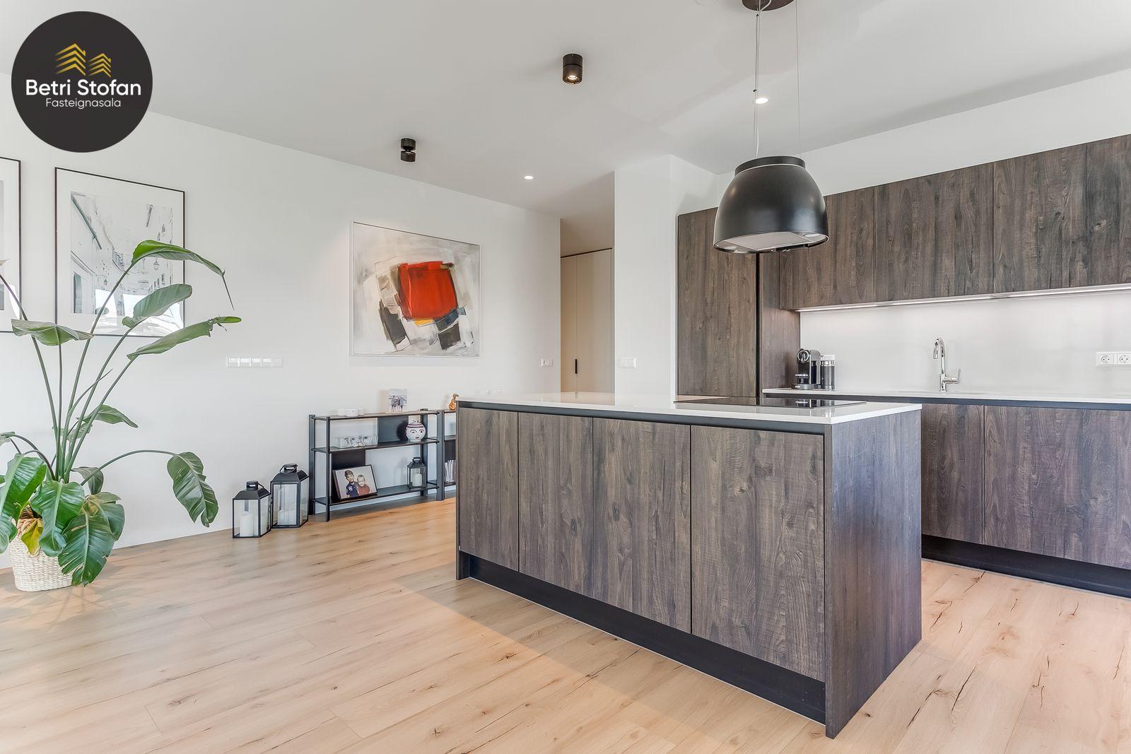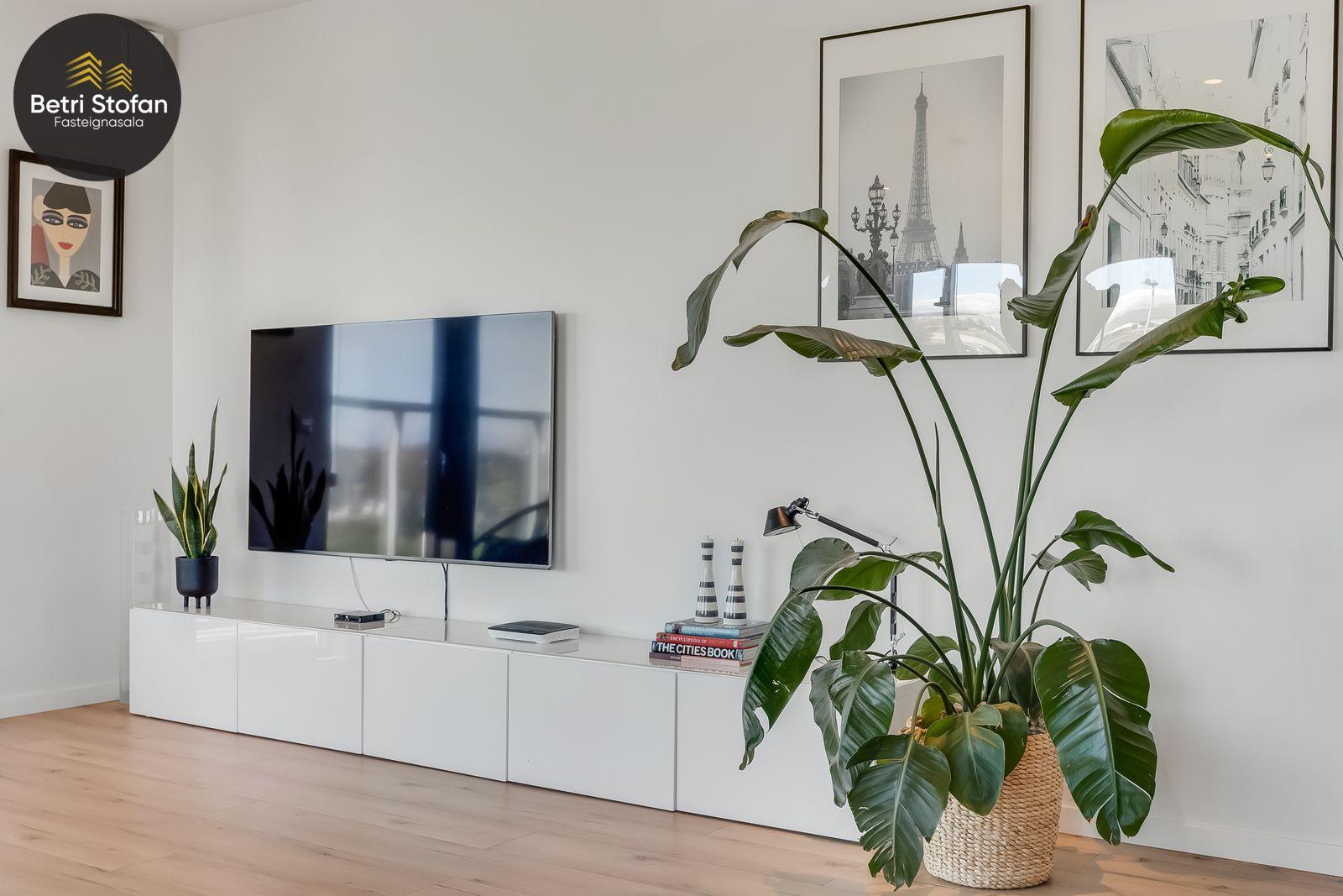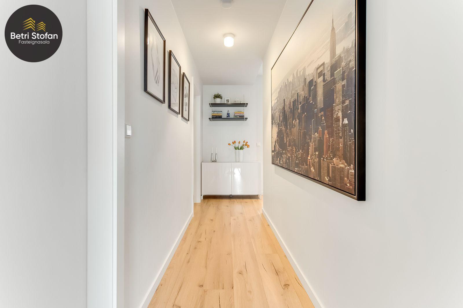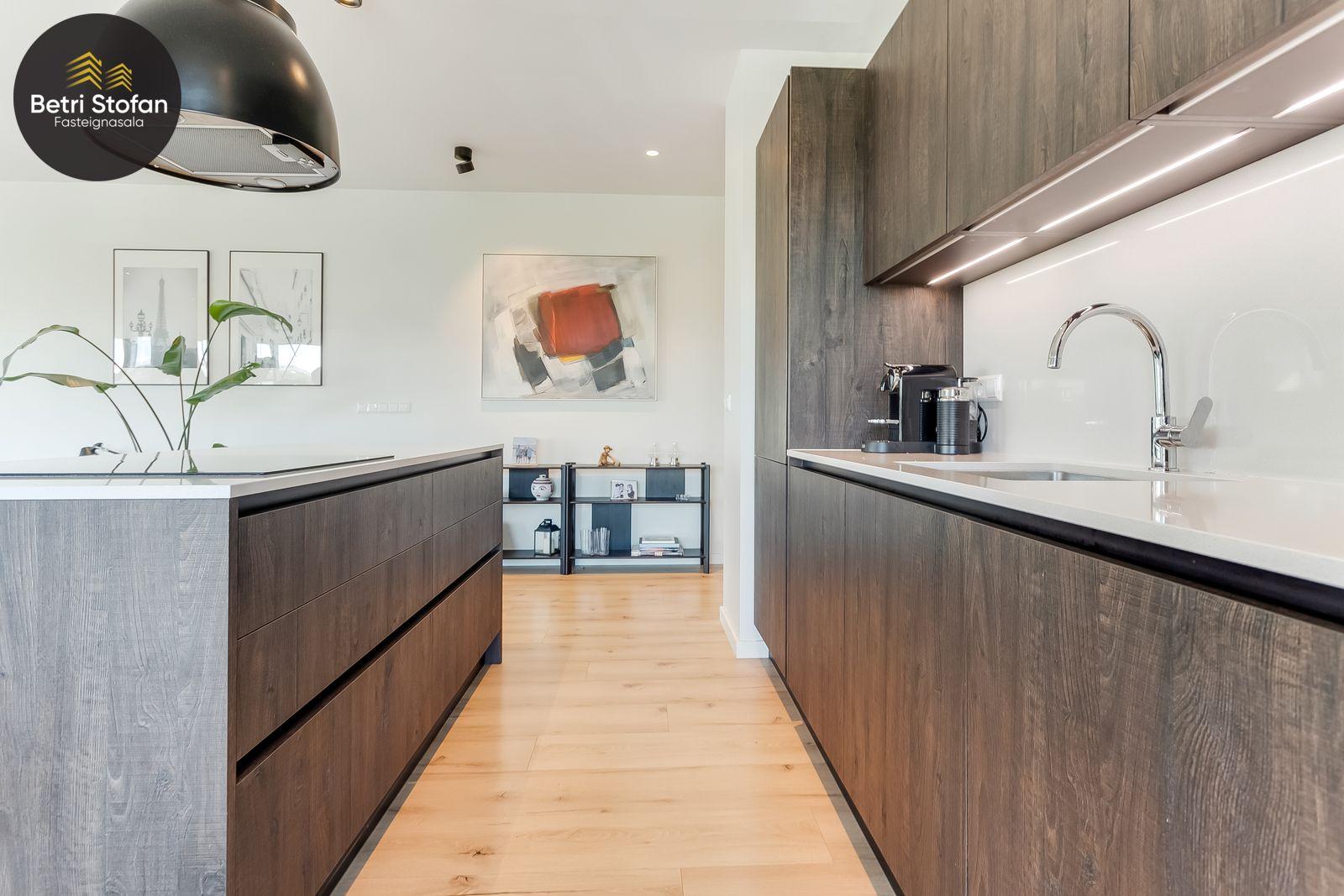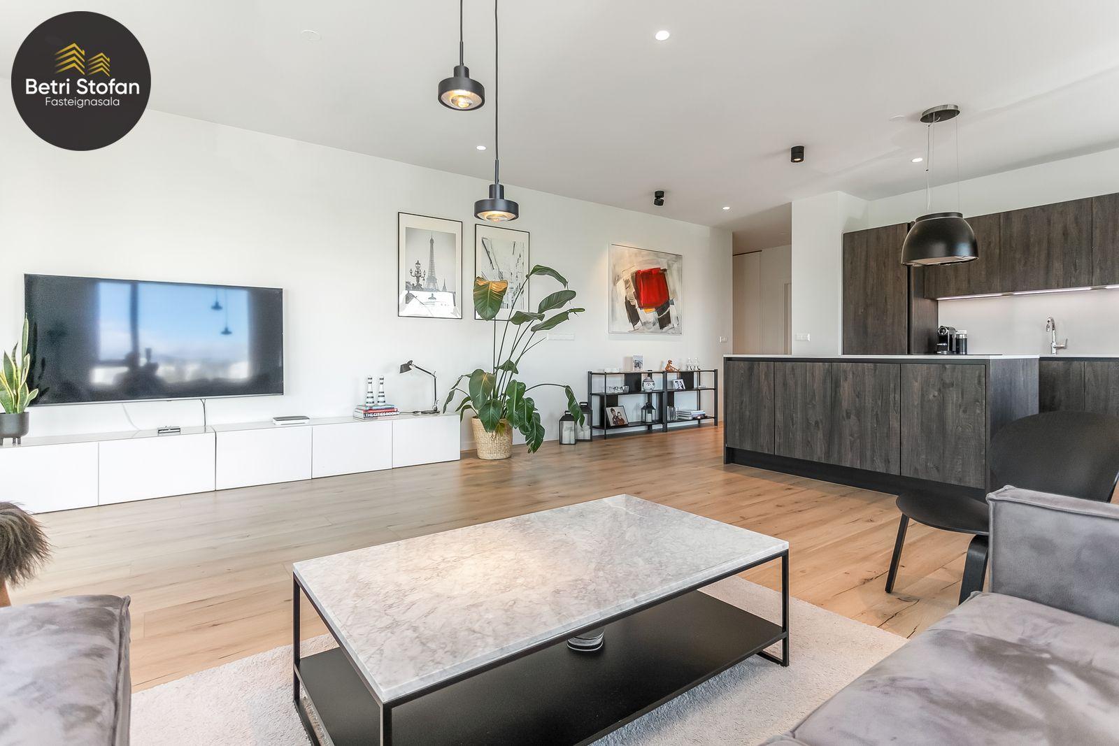 Nánari lýsing: Komið er inn í forstofu með fataskápum. Stofan er sérstaklega björt með gólfsíðum gluggum á tvo vegu. Mikið útsýni er úr stofu. Svalir eru útaf stofu til austurs. Eldhúsið er samliggjandi við stofuna. Mjög falleg innrétting frá Parka er í eldhúsi með stórum vinnuborðum. Ljós kvarts steinn er á vinnuborðum. Innbyggð heimilistæki sem fylgja íbúðinni. HAF STUDIO sá um efnisval. Hjónaherbergið er mjög rúmgott með fataherbergi innaf. 40 fm þaksvalir eru útaf herbergi til suðvesturs, gert er ráð fyrir rafmagnspotti. Glæsilegt útsýni. Tvö önnur svefnherbergi, bæði rúmgóð með skápum. Baðherbergið er flísalagt og með gólfhita. Falleg innrétting með kvarts steini. Baðkar með sturtuaðstöðu. Þvottahúsið er innaf baðherbergi með flísum á gólfum. Á allri íbúðinni er vandað parket fyrir utan votrými þar sem eru flísar. Skápar og hurðar eru frá Parka.