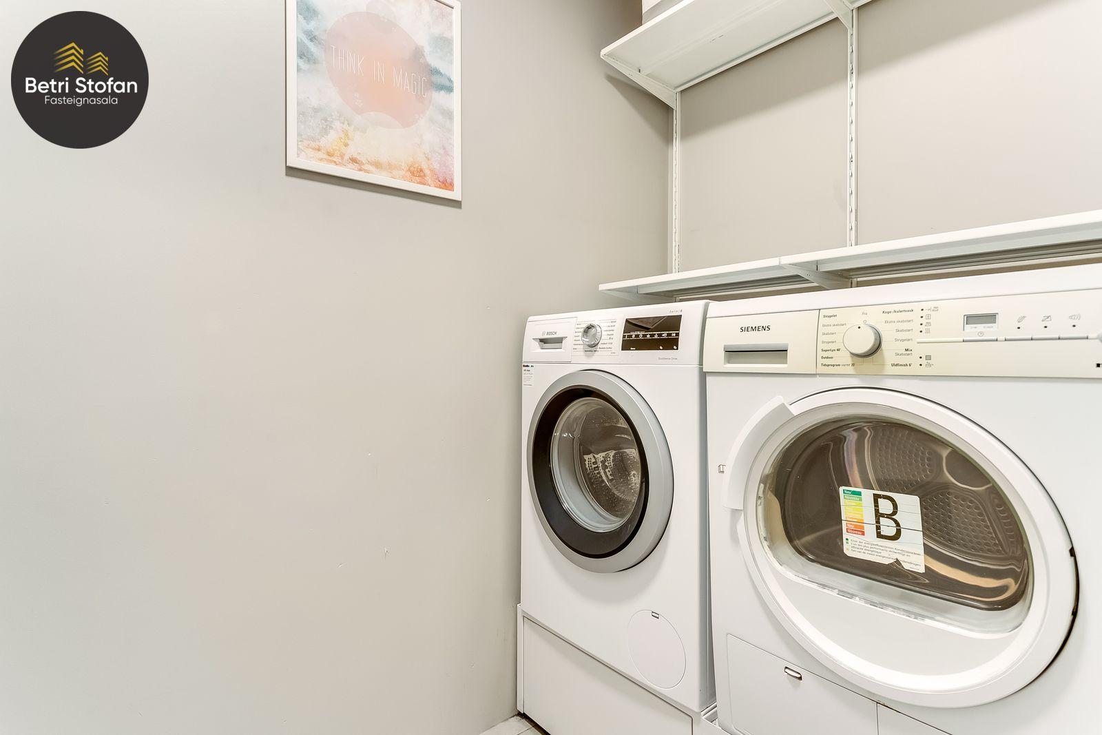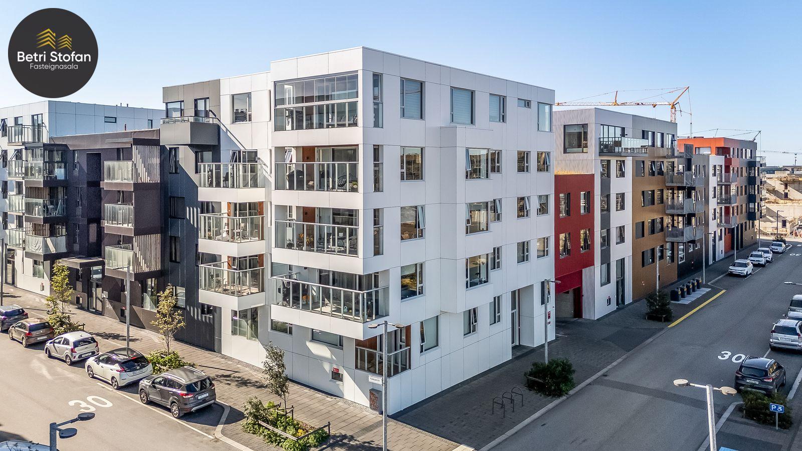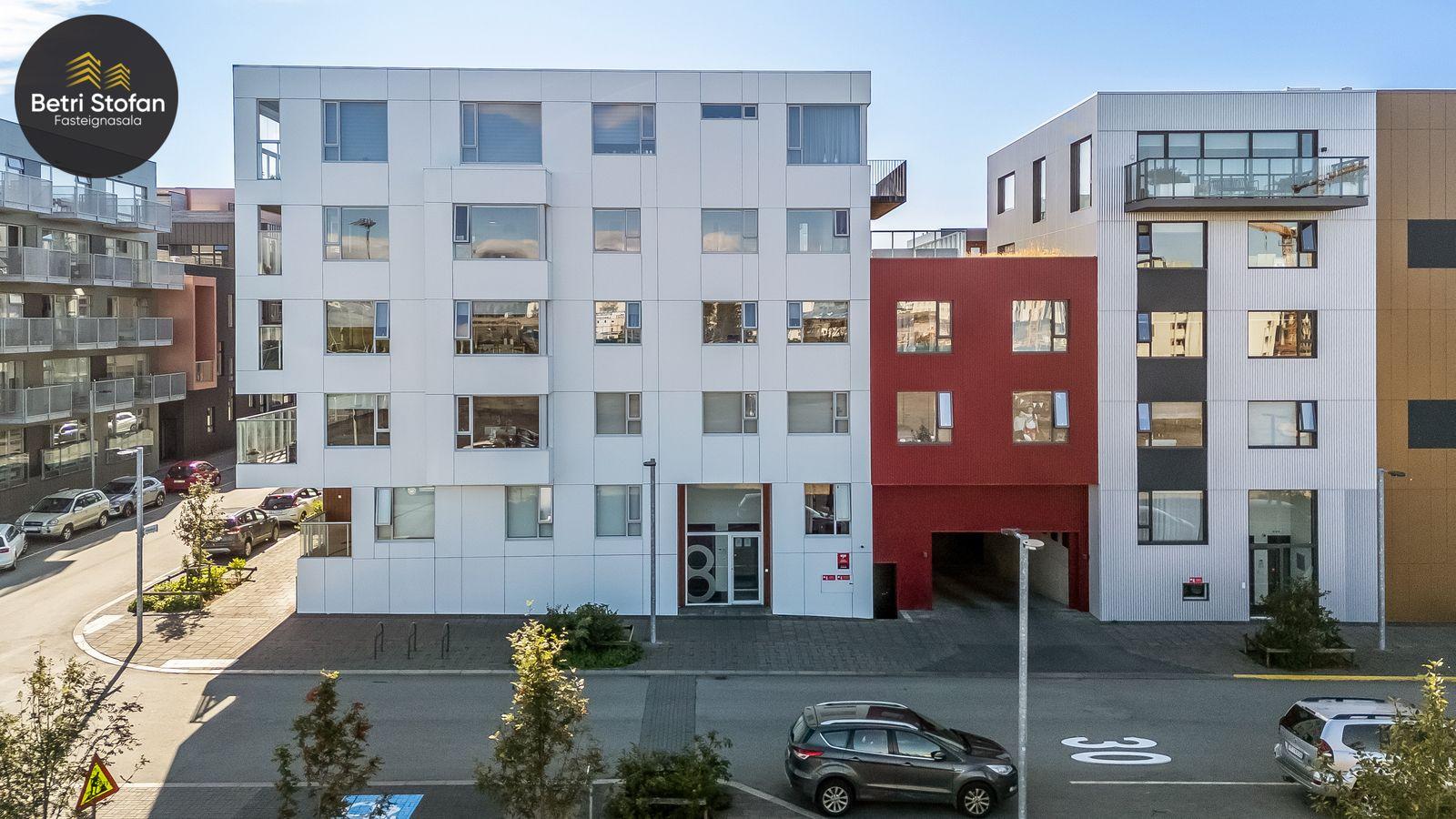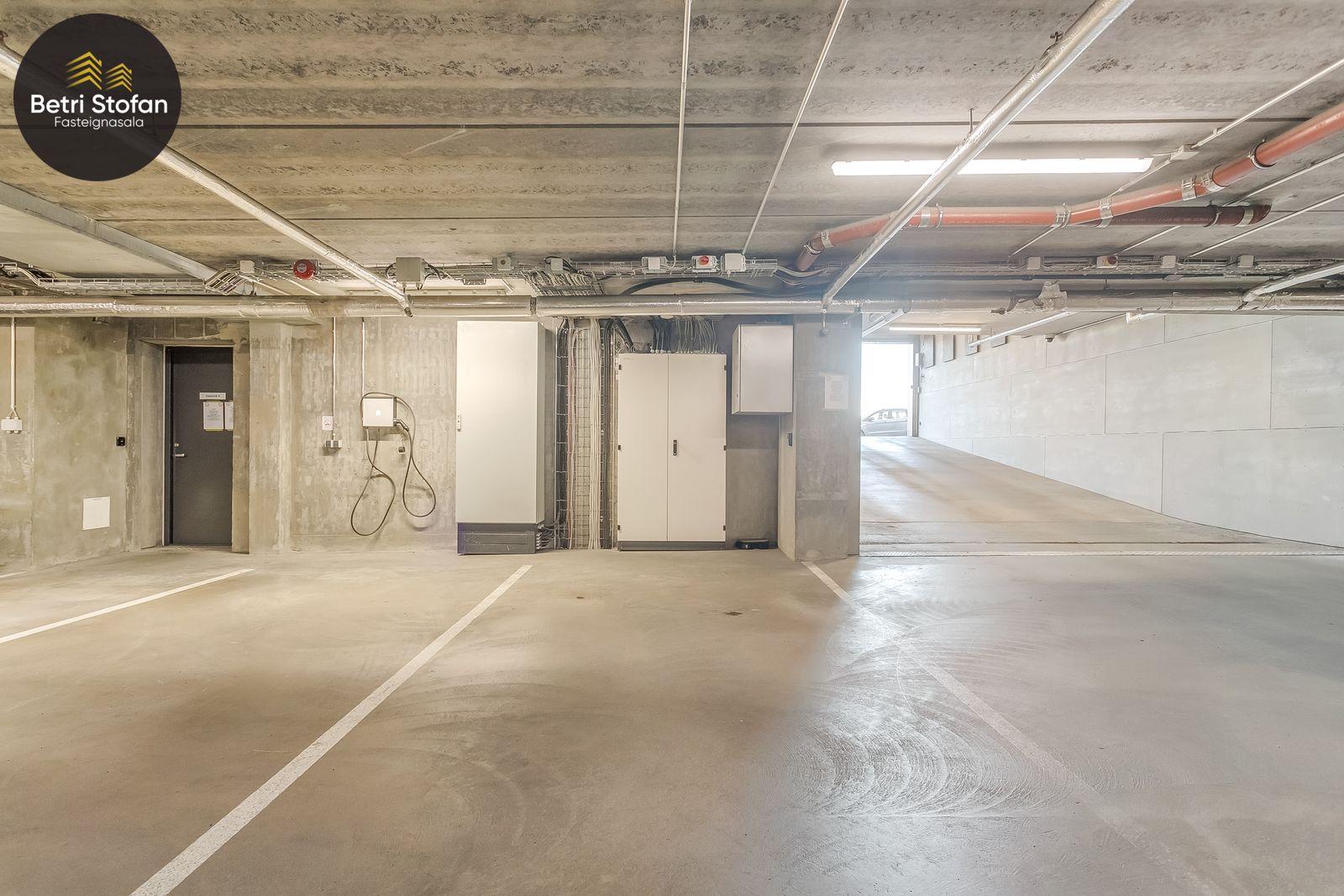 Íbúðinni fylgir stæði í bílakjallara (nálægt inngangi í lyftu) og 15,3 fm sérgeymsla með mikilli lofthæð í sameign.