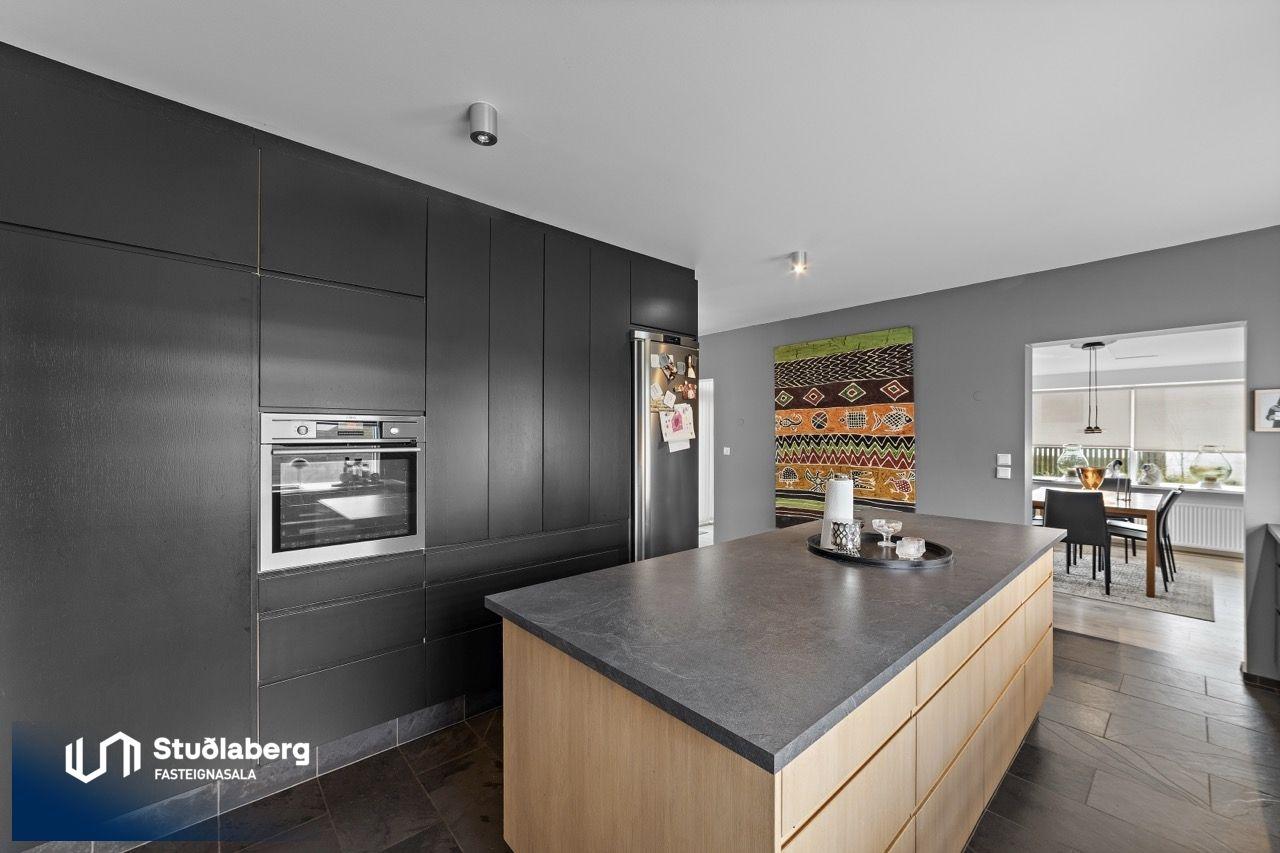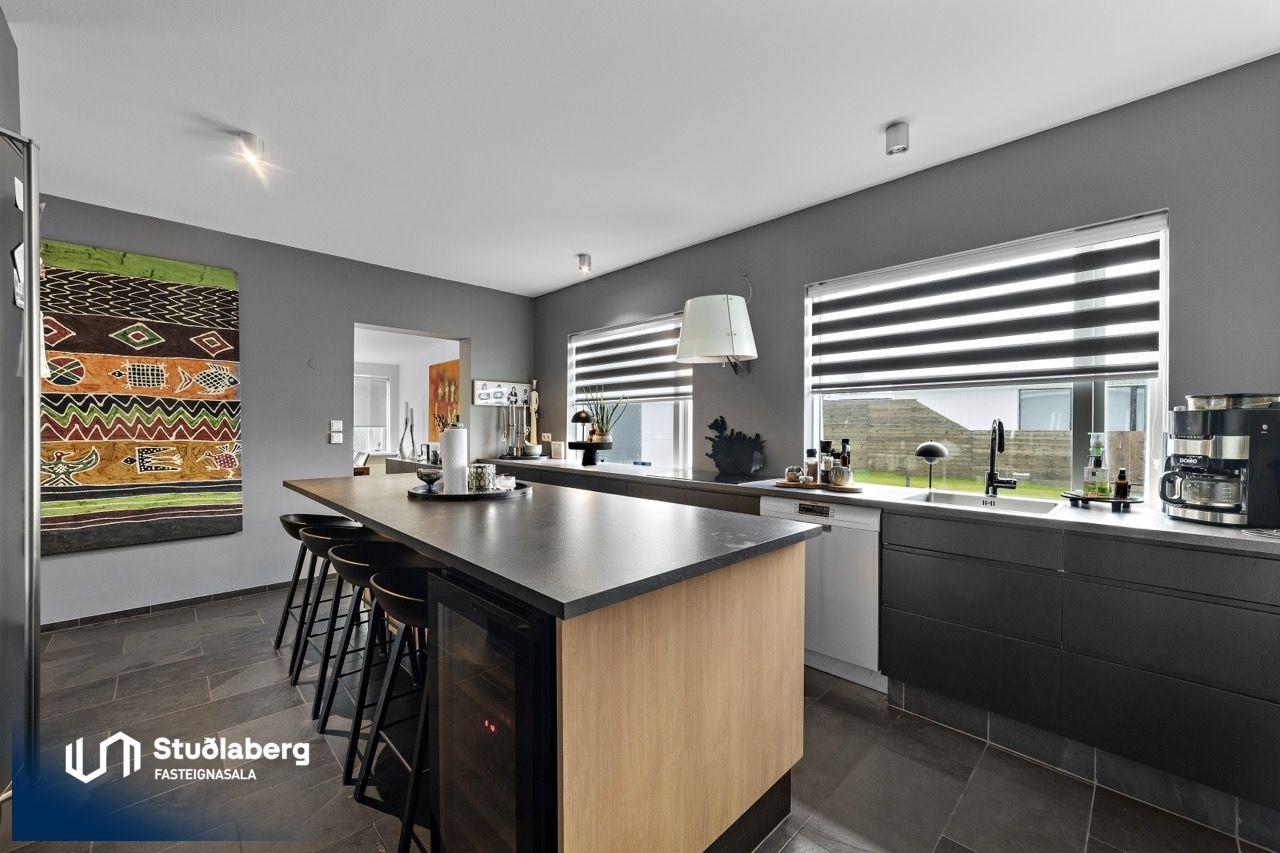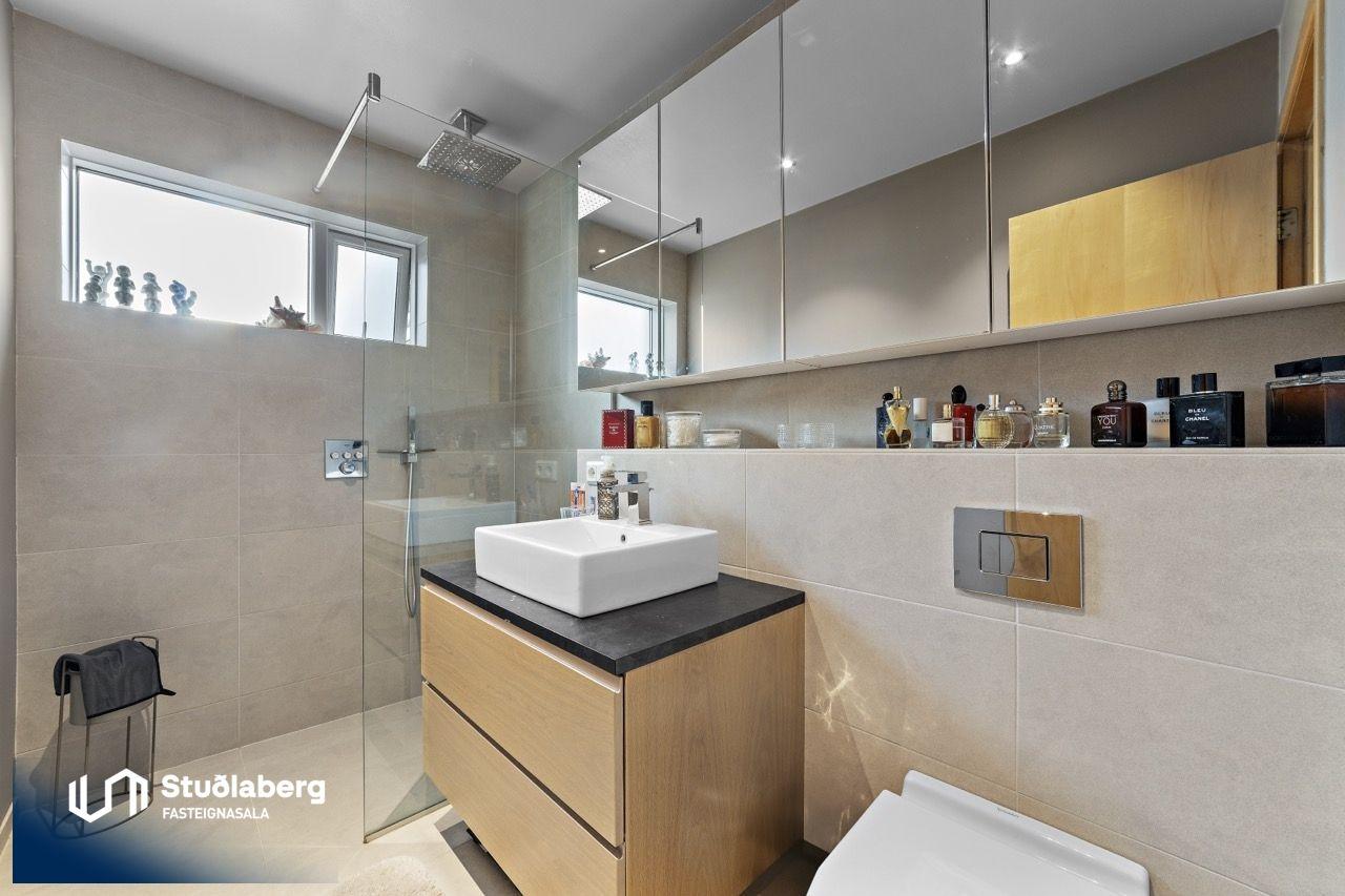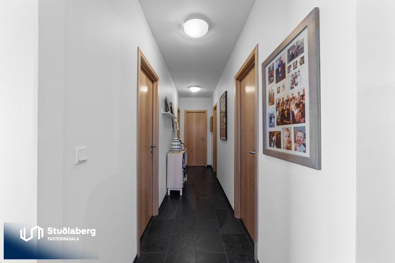 Forstofan hefur flísar á gólfum, þar er fataskápur. Þvottarhús hefur epoxy á gólfi og frábæra innréttingu þar sem gert er ráð fyrir þvottavél og þurrkara í vinnuhæð. Eldhús hefur flísar á gólfi, þar er glæsileg innrétting með stórri eldhúseyju. Stofan hefur parket á gólfi, þar er hurð út á sólpall sem snýr í suð-vestur. Baðherbergi hefur verið endurnýjað með flísumá gólfi og veggjum, þar er "walk in" sturta og upphengt salerni. Herbergin eru fjögur og hafa þau öll parket á gólfum.
