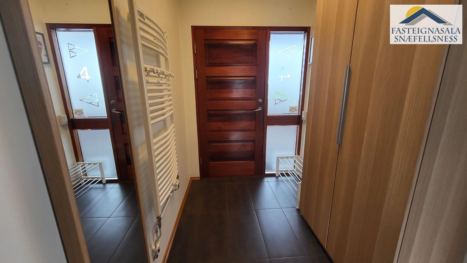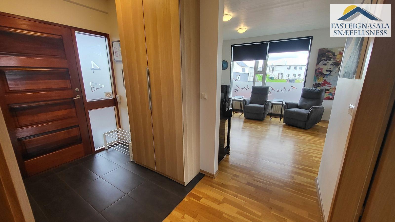 Neðri hæð skiptist í forstofu, samliggjandi hol, stofu og eldhús, baðherbergi, fjögur svefnherbergi og þvottahús. Gangur er rúmgóður og í enda hans er ágæt vinnuaðstaða. Útihurð er á þvottahúsi. Í hjónaherbergi er afstúkað fatarými.