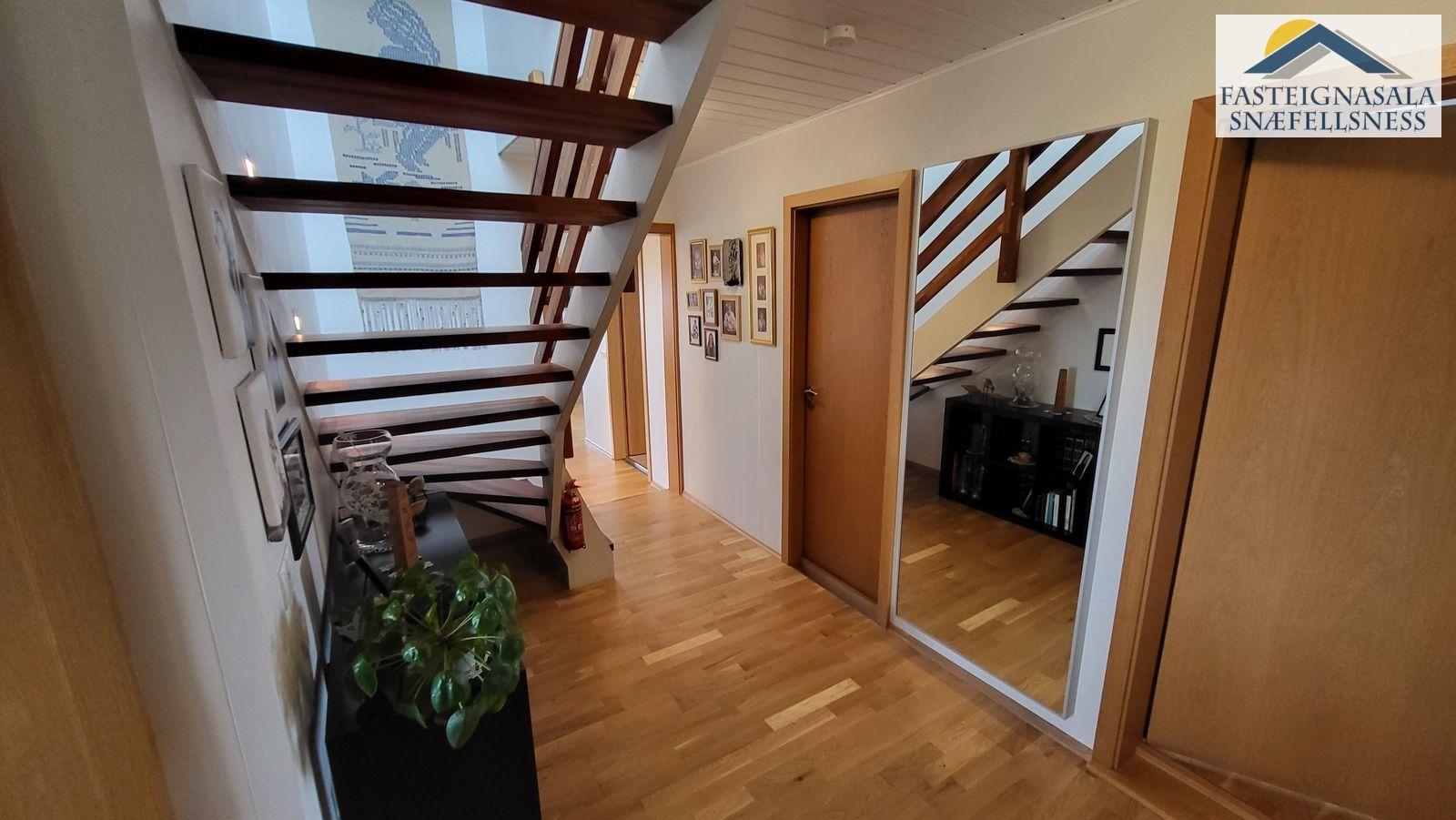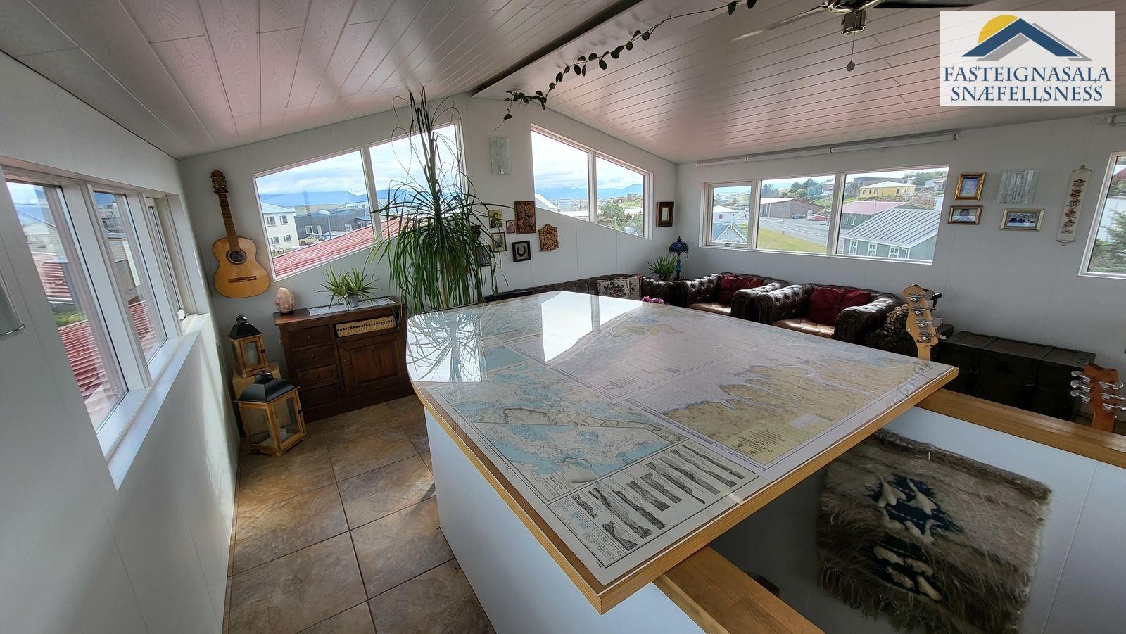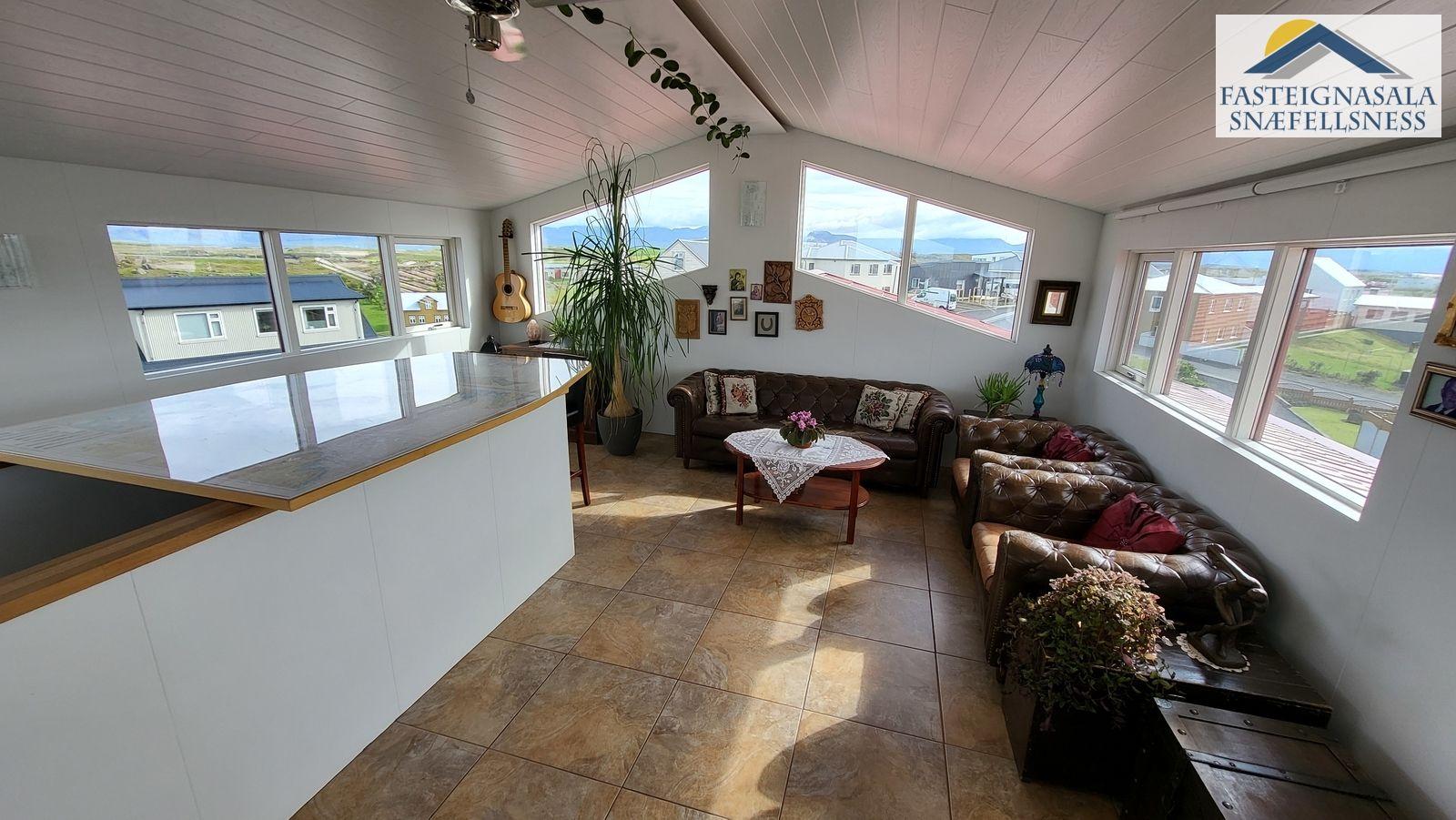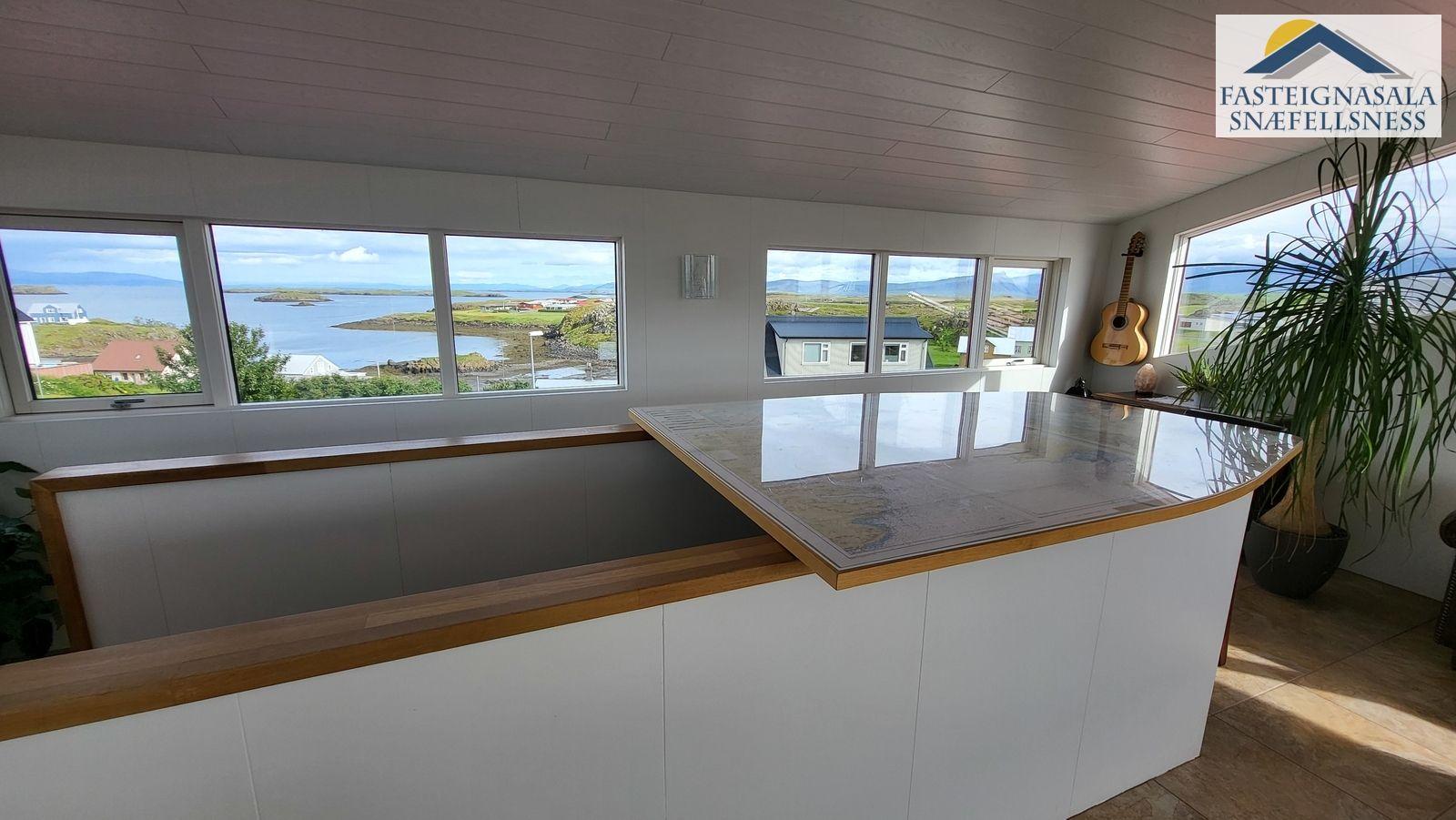 Úr holi er gengið upp á efri hæð sem er ein stofa með gluggum á öllum hliðum. Þaðan er mjög gott útsýni til allra átta. Flísar eru á gólfum á efri hæð og stigi er úr harðviði.