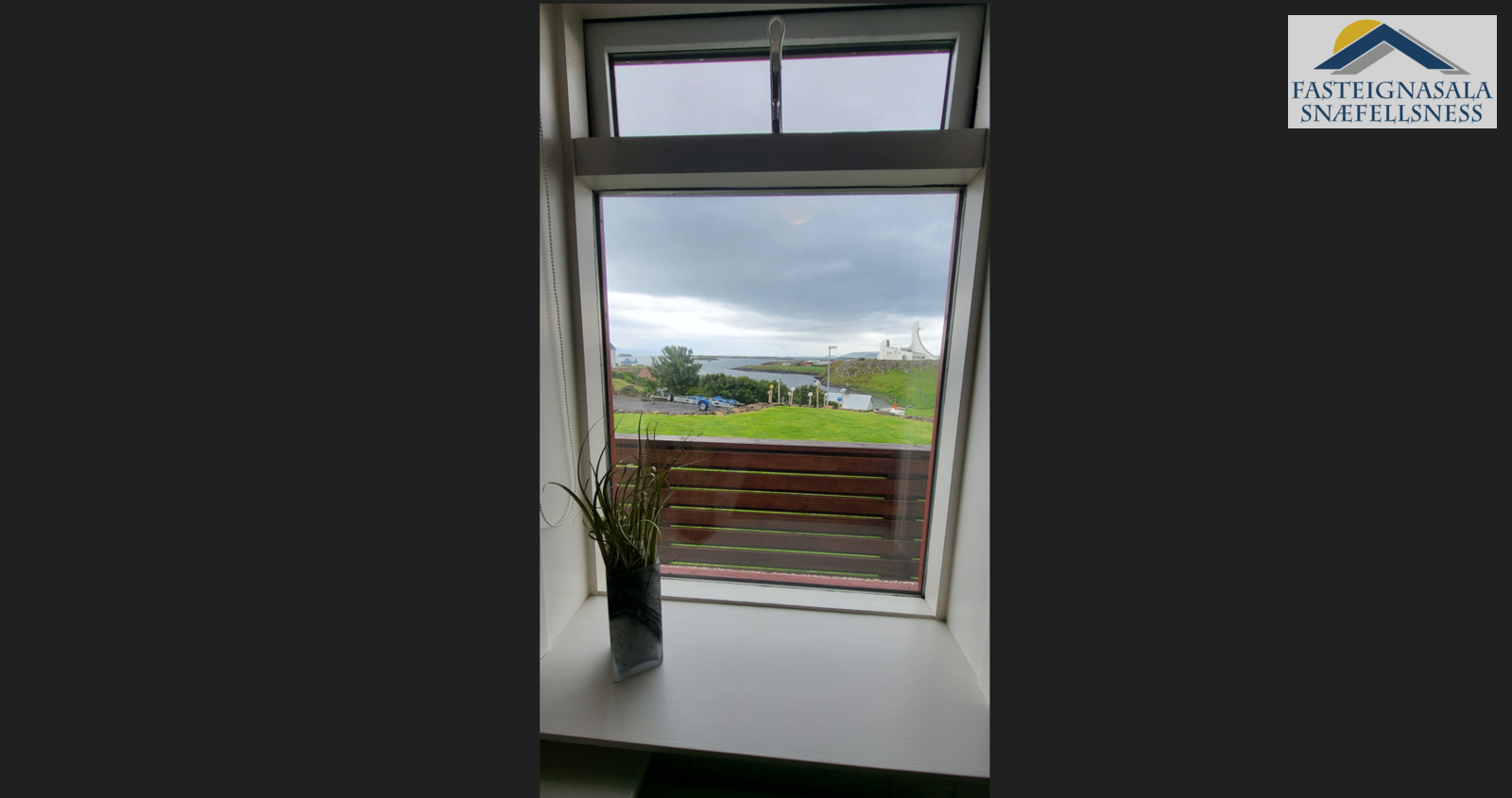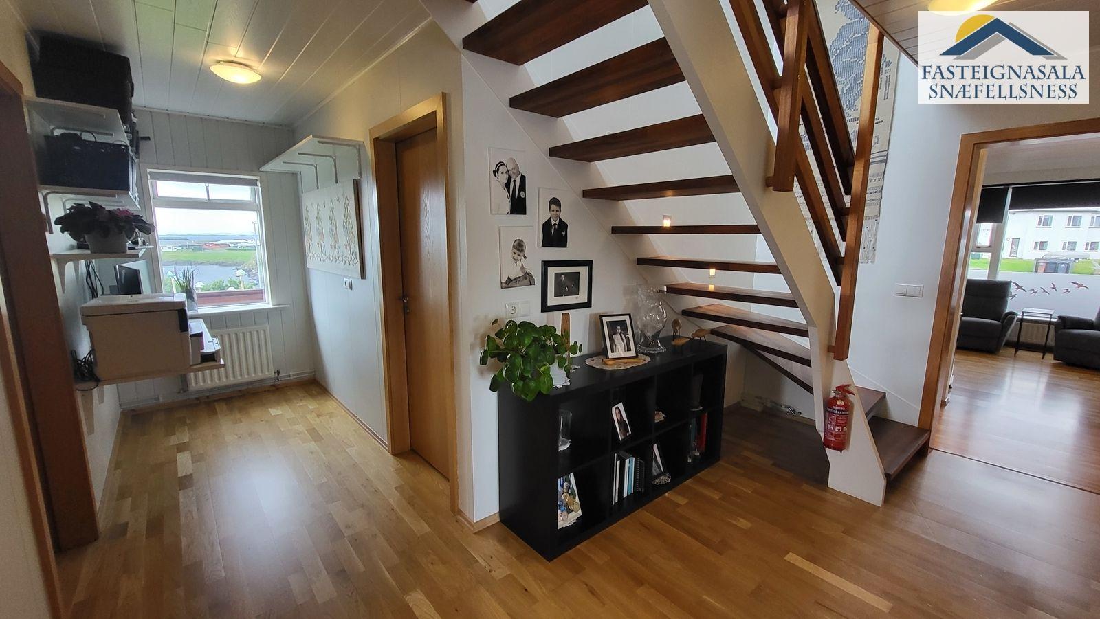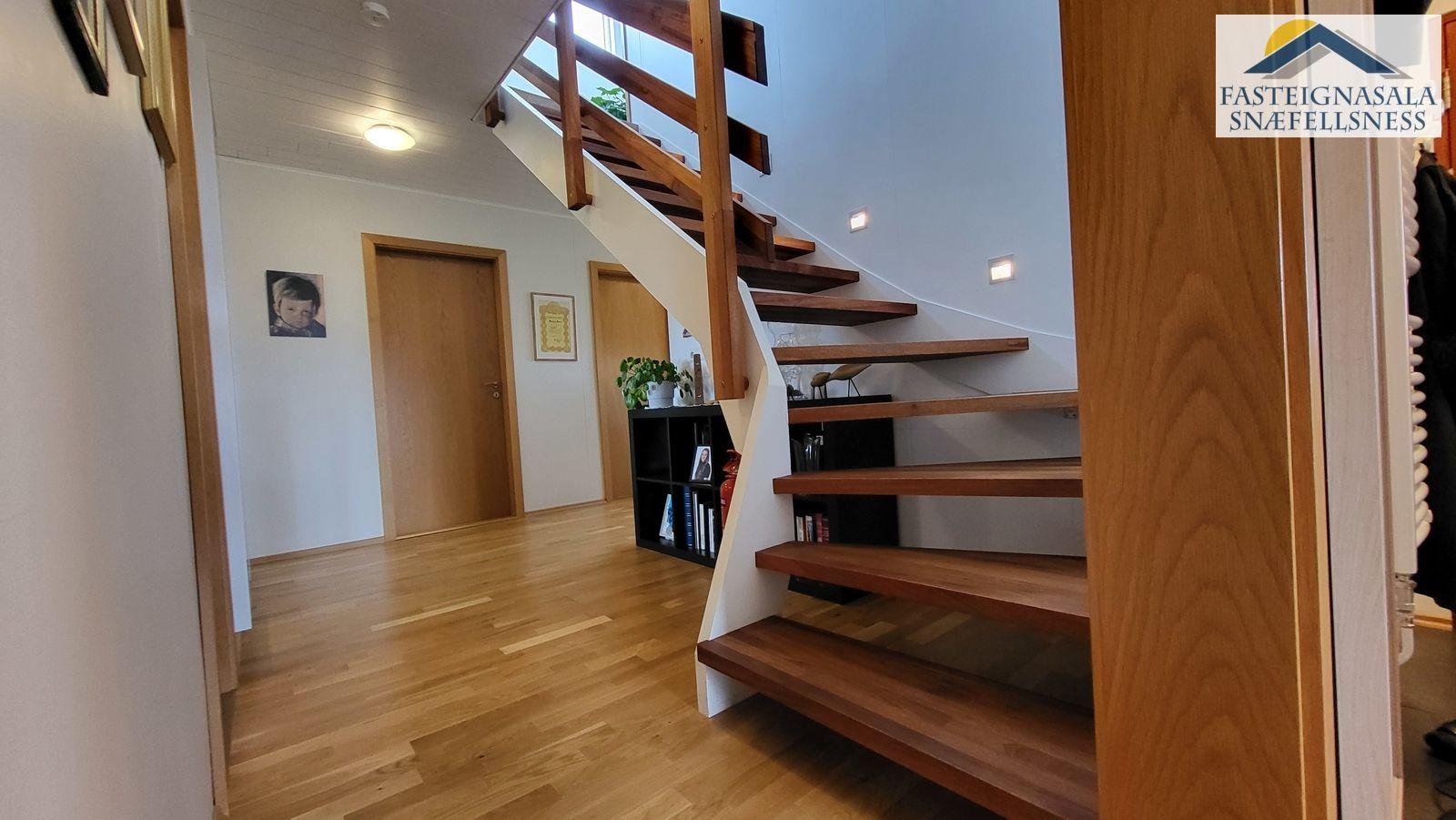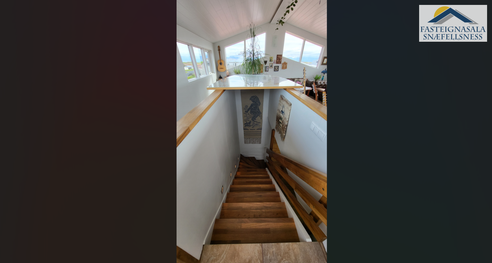 Úr holi er gengið upp á efri hæð sem er ein stofa með gluggum á öllum hliðum. Þaðan er mjög gott útsýni til allra átta. Flísar eru á gólfum á efri hæð og stigi er úr harðviði.
