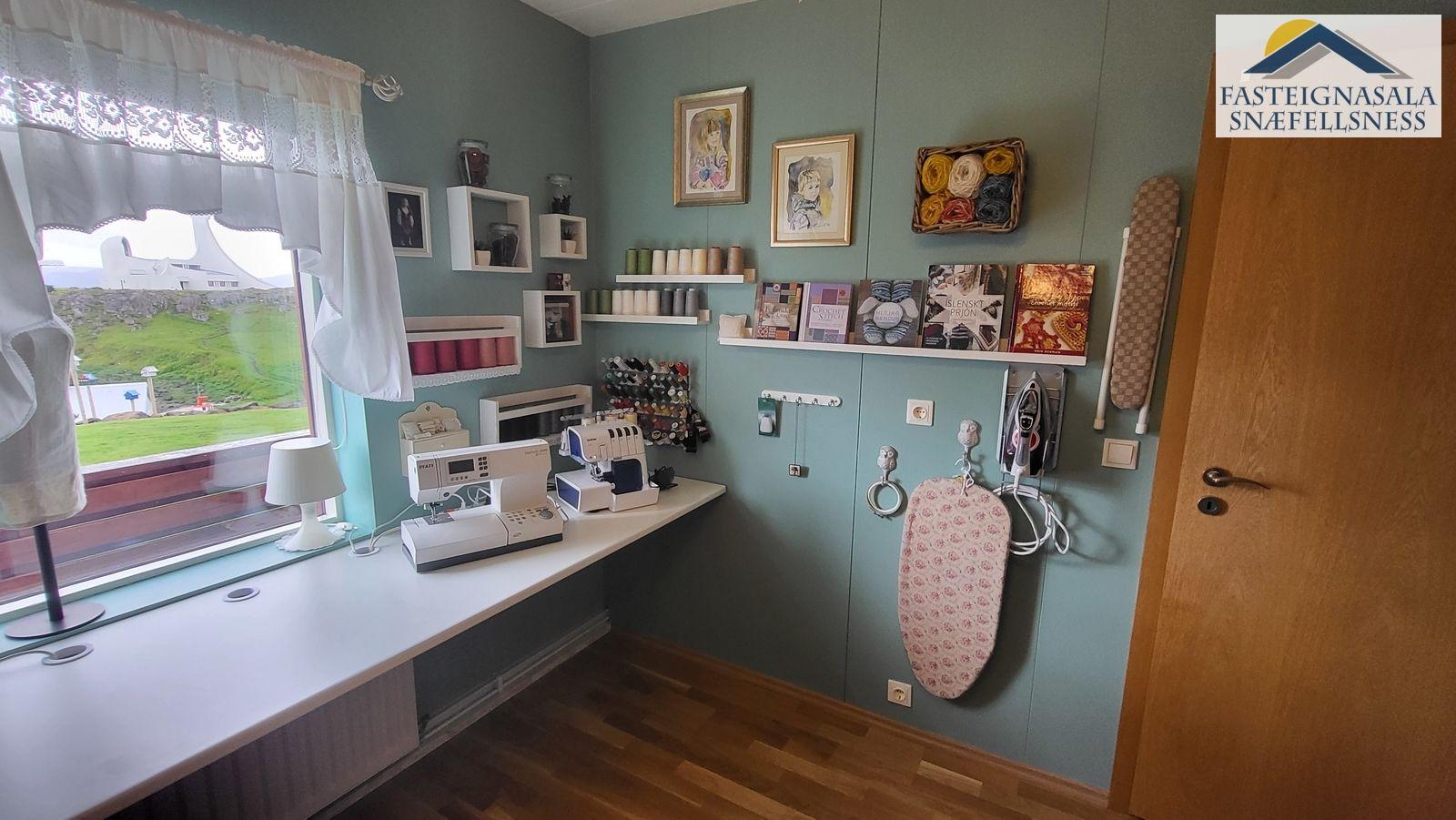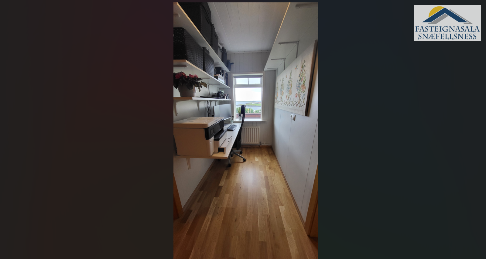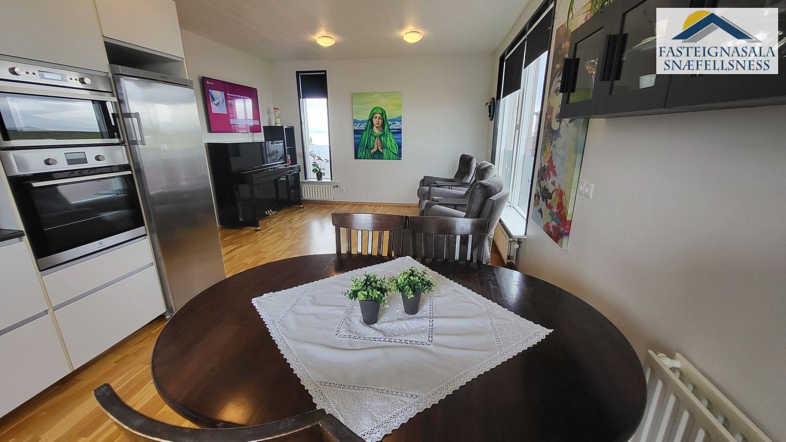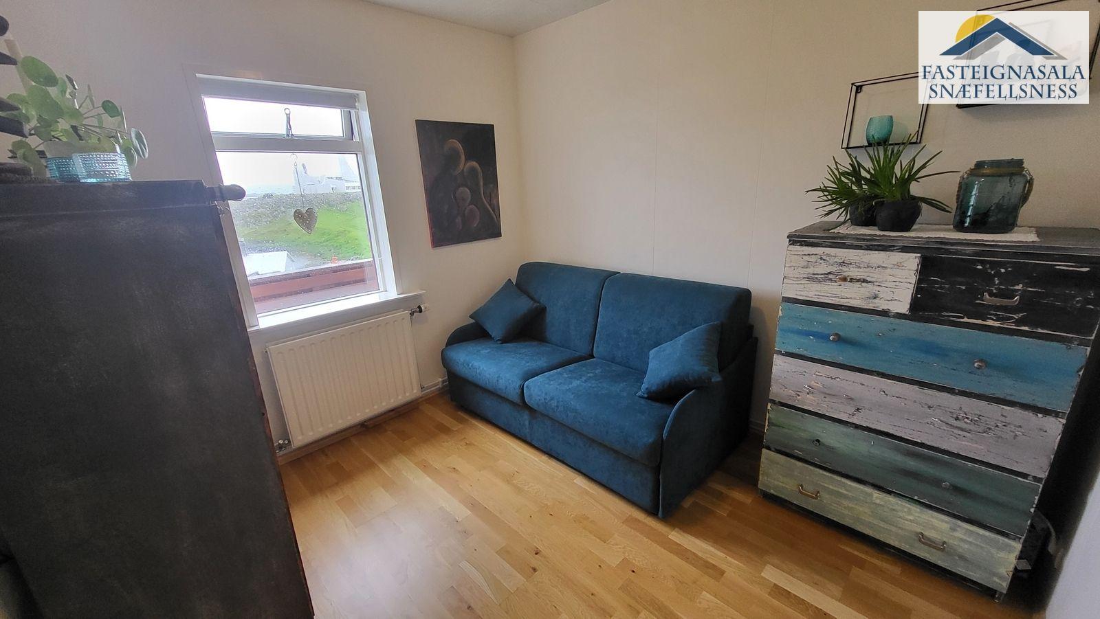 Úr holi er gengið upp á efri hæð sem er ein stofa með gluggum á öllum hliðum. Þaðan er mjög gott útsýni til allra átta. Flísar eru á gólfum á efri hæð og stigi er úr harðviði.