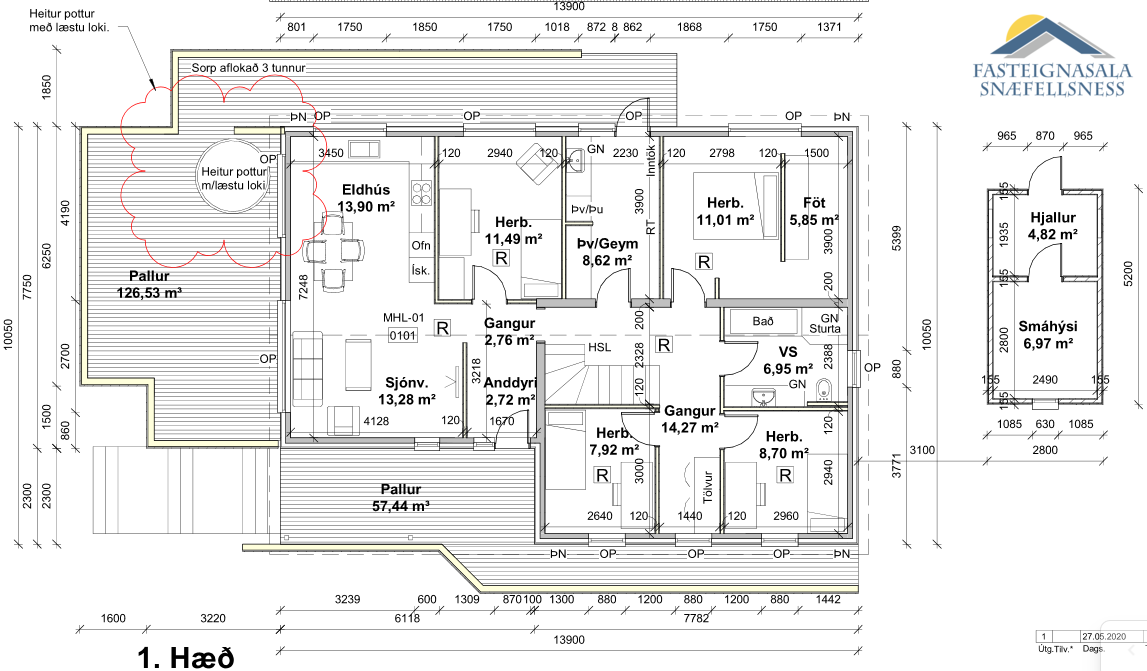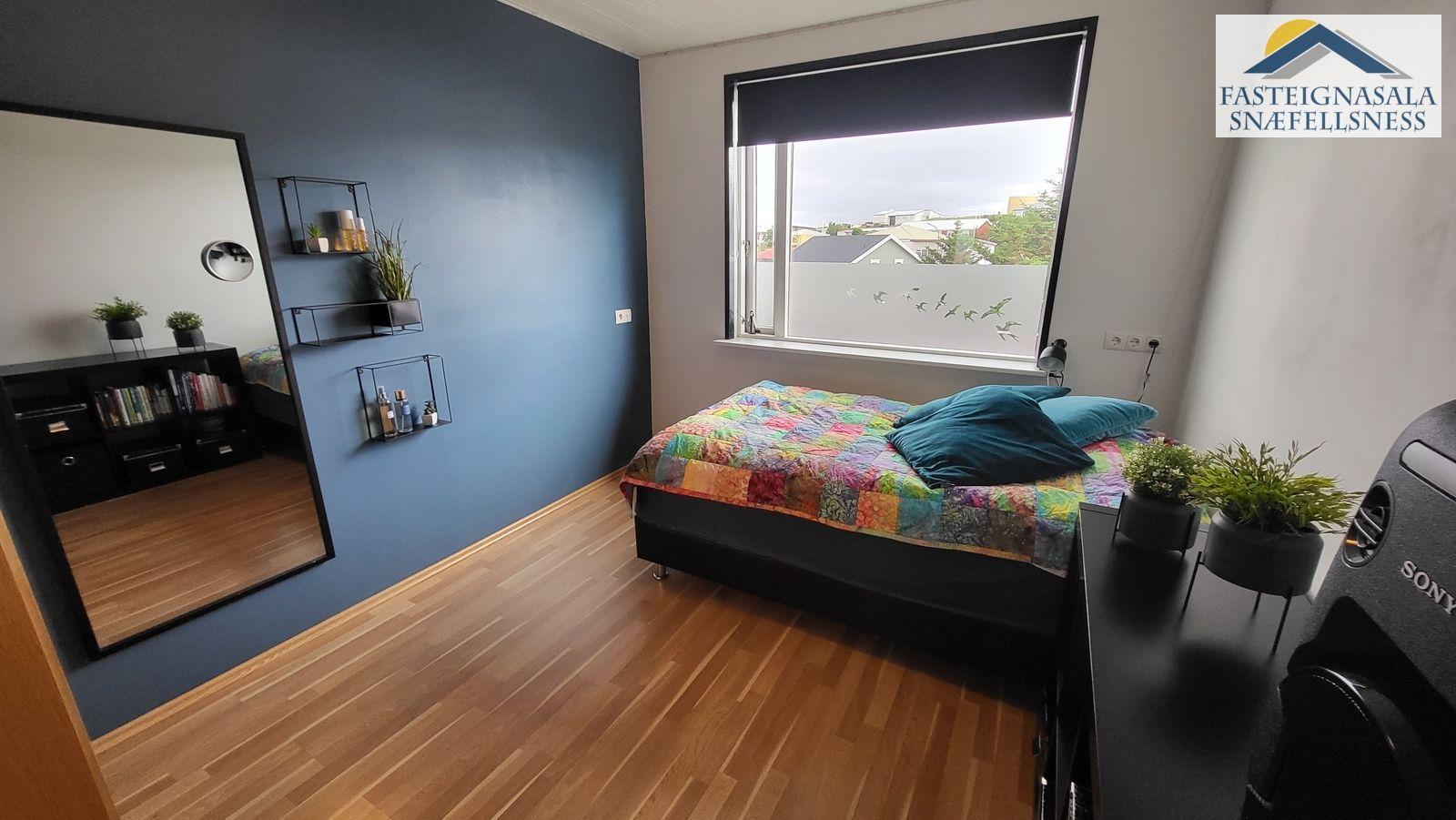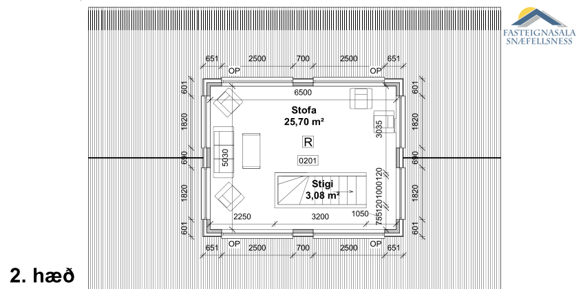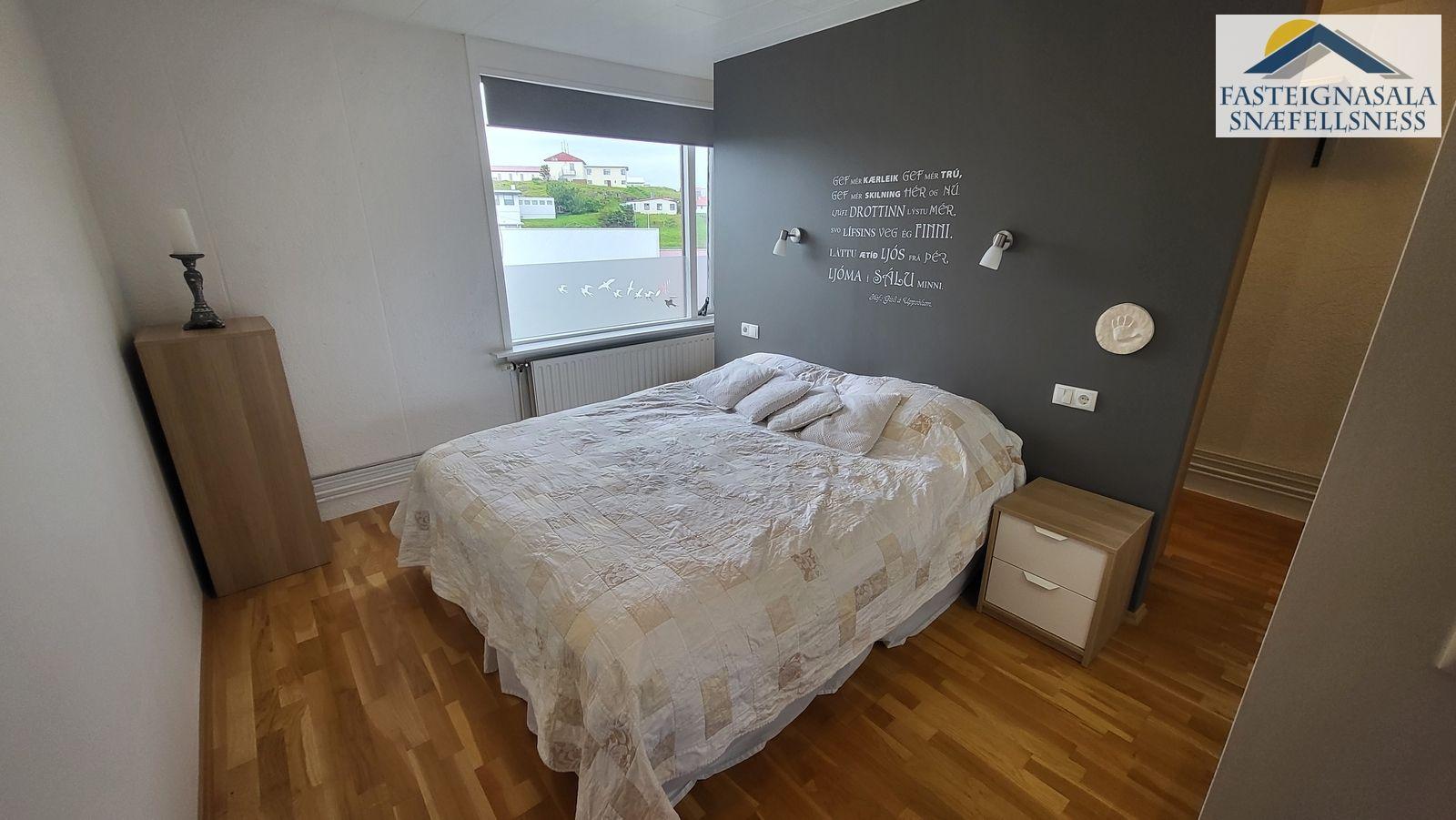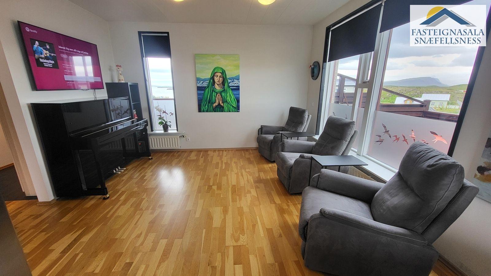 Úr holi er gengið upp á efri hæð sem er ein stofa með gluggum á öllum hliðum. Þaðan er mjög gott útsýni til allra átta. Flísar eru á gólfum á efri hæð og stigi er úr harðviði.