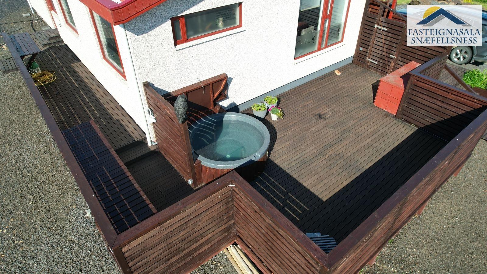 Góður sólpallur er við húsið og þar er heitur pottur. Þá er við húsið geymsluskúr á steyptri plötu sem endurbyggður var árið 2020. Skiptist hann í þurrkhjall og geymslu sem er upphituð og einangruð.