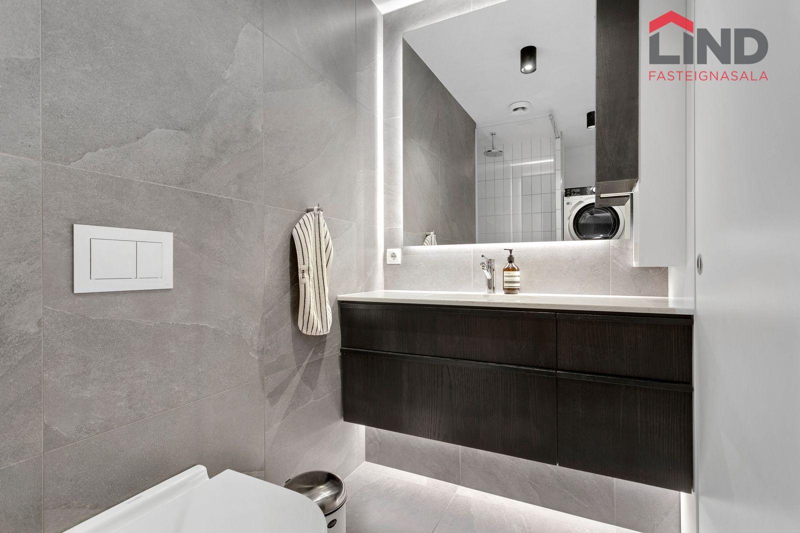 Baðherbergi: Með dökkri innréttingu og speglaskáp með fallegri lýsingu. Tengi fyrir þvottavél og þurrkara.