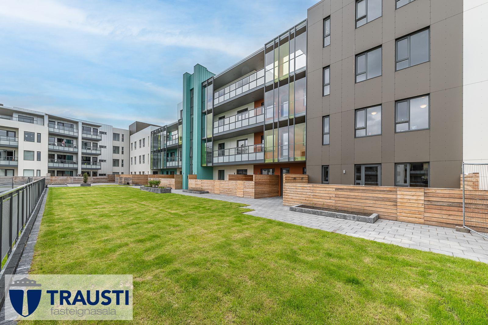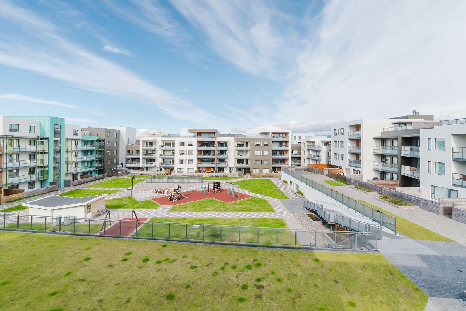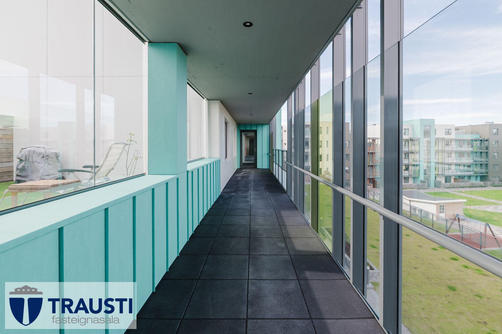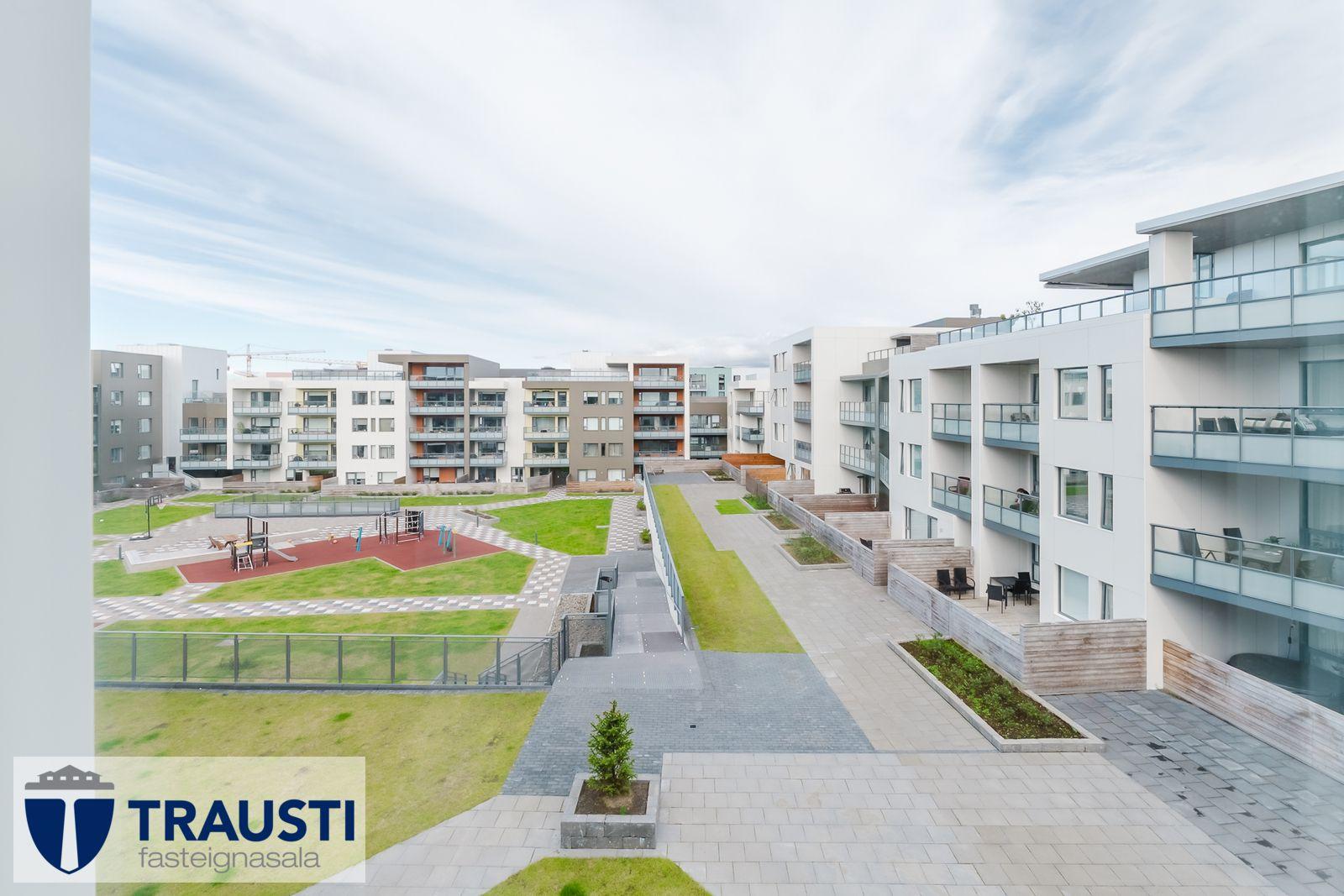 Nánari lýsing eignar: Þegar komið er upp á fjórðu hæð er sérinngangur inn í íbúðina eftir löngum gangi með útsýni yfir garðinn en þessi íbúð er ein með aðgang að ganginum. Forstofa með flísum á gólfi og yfirhafnaskáp. Úr forstofu er gengið út á 37,4 fm þaksvalir þar sem hægt er að koma fyrir heitum potti. Stofa og opið eldhús, hvít innrétting með eyju. Gengið er út á suður svalir frá stofu/eldhúsi Rúmgóð þrjú svefnherbergi, með fataskáp. Baðherbergi með sturtu, ljósri innréttingu, handlaug og upphengdu salerni og handklæðaofn. Sér þvottahús með flísum á gólfi. Geymsla í kjallara, innan bílskúrs 11,6 fm Bílskúr með stálvaski, 48,7 fm Bílastæði í lokuðu bílastæðahúsi, fyrir fram skúr nr. B21 Stór og fallegur garður er í miðju bygginganna með leiktækjum fyrir börn.