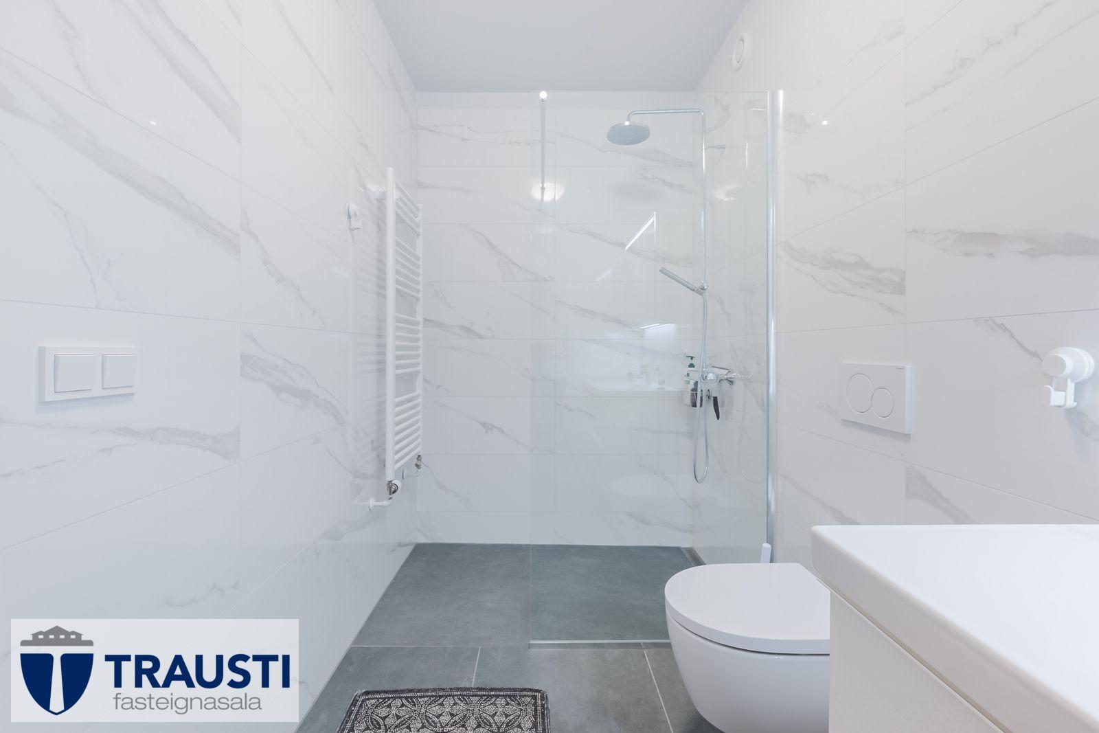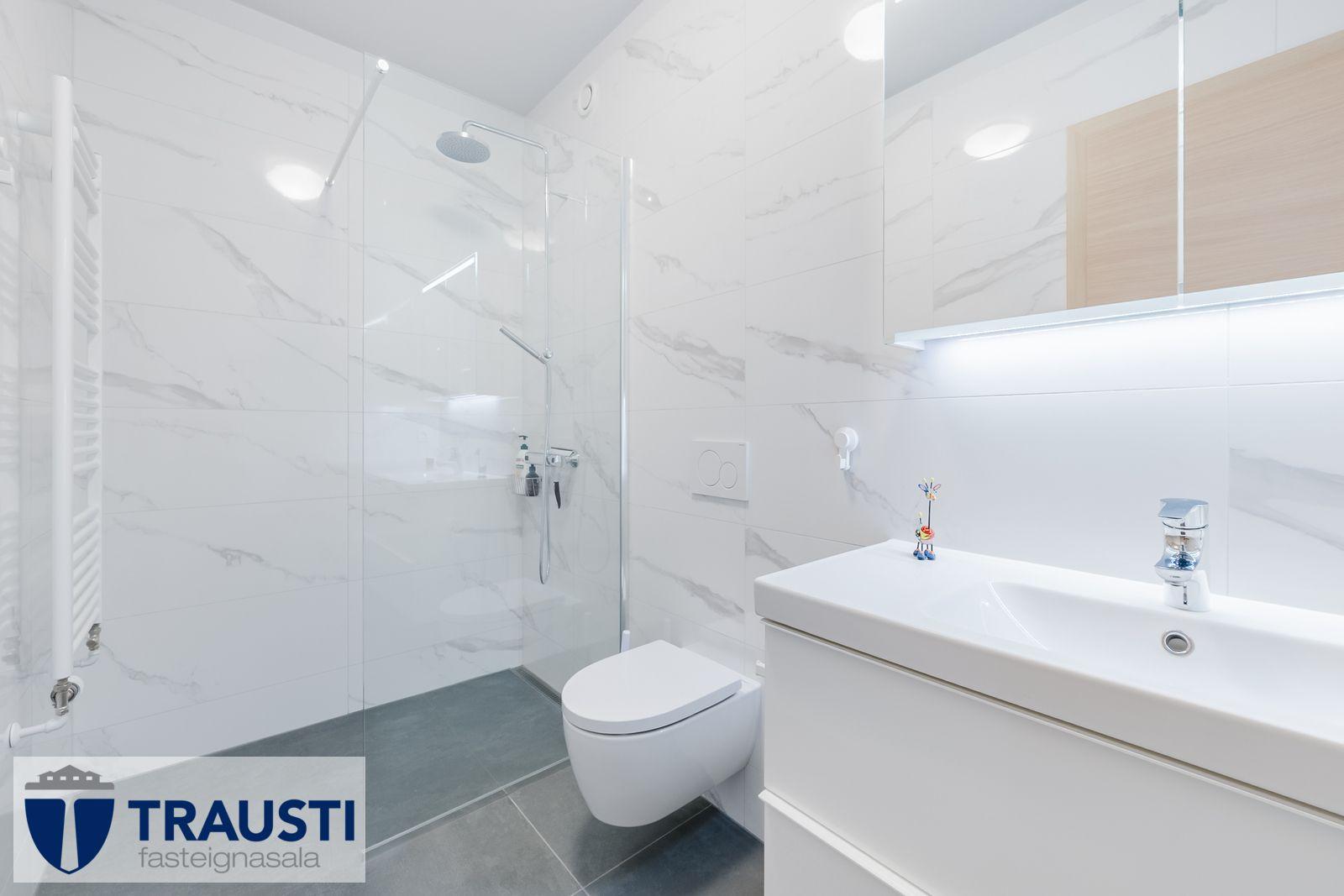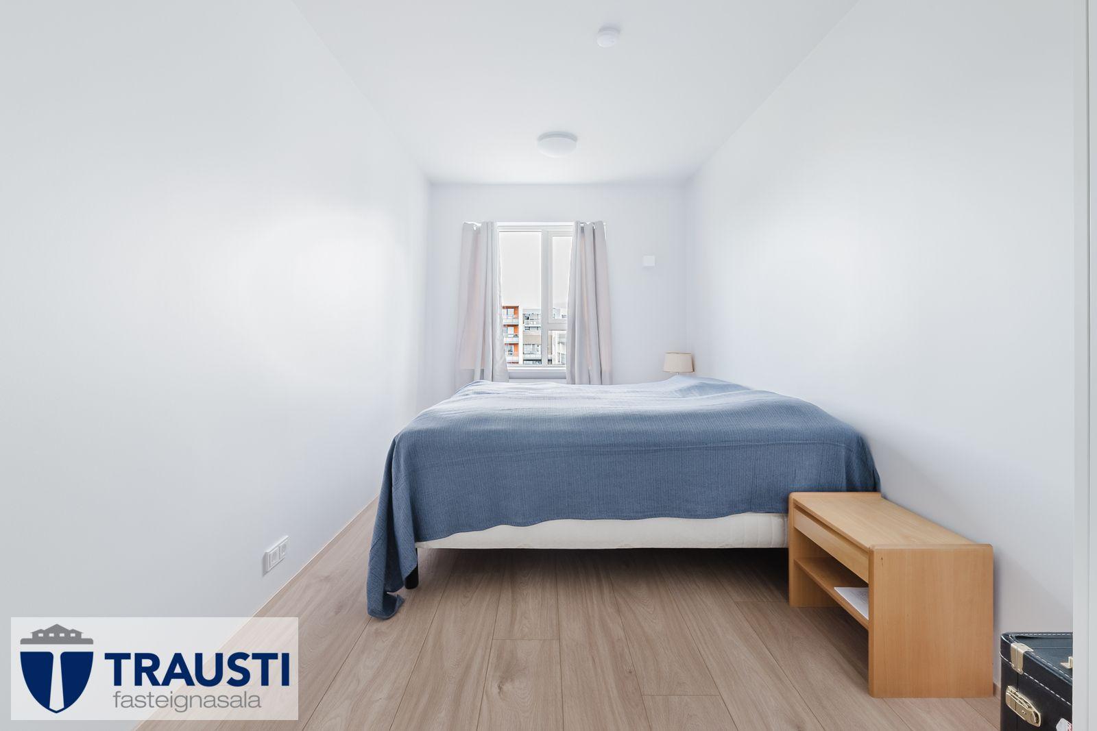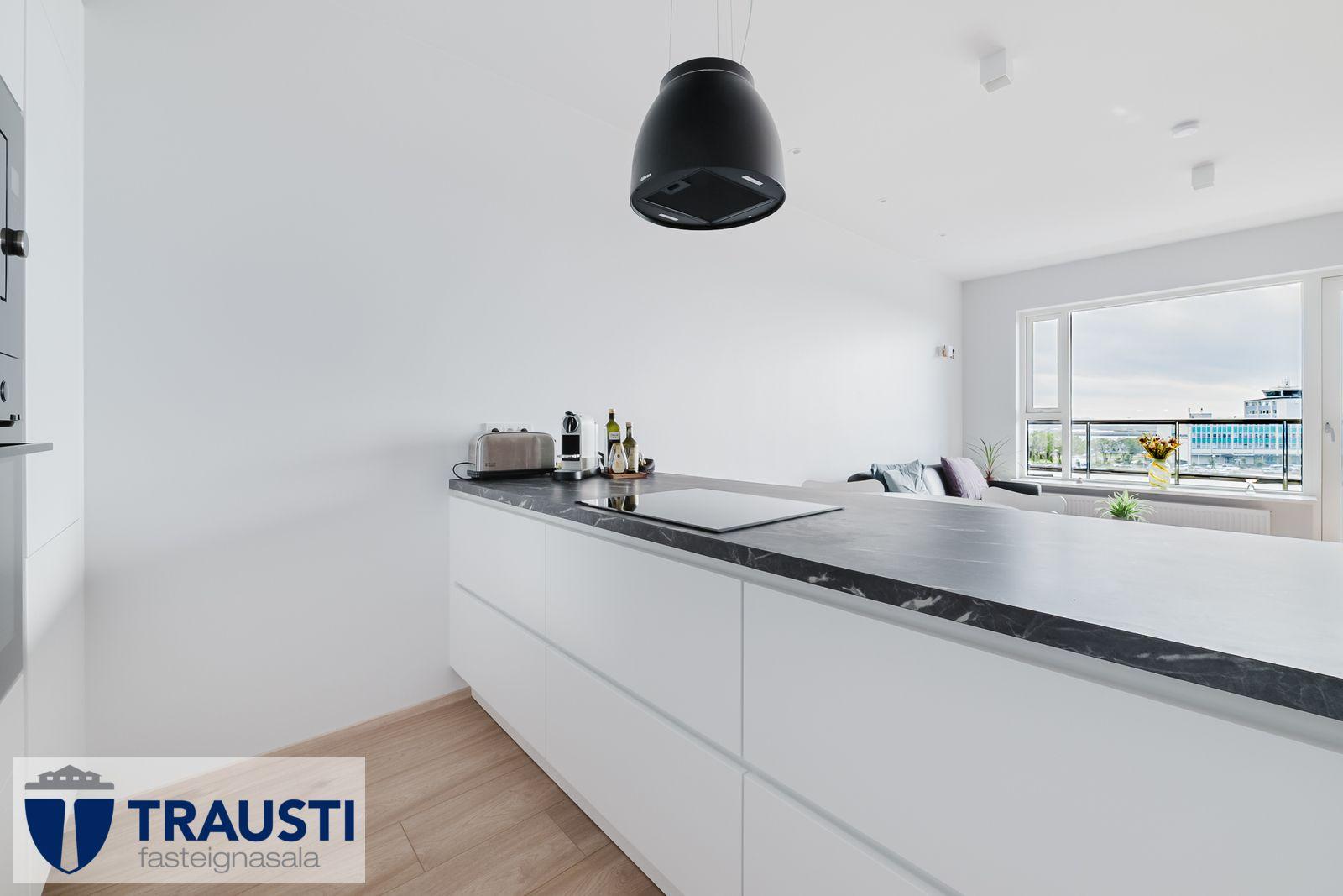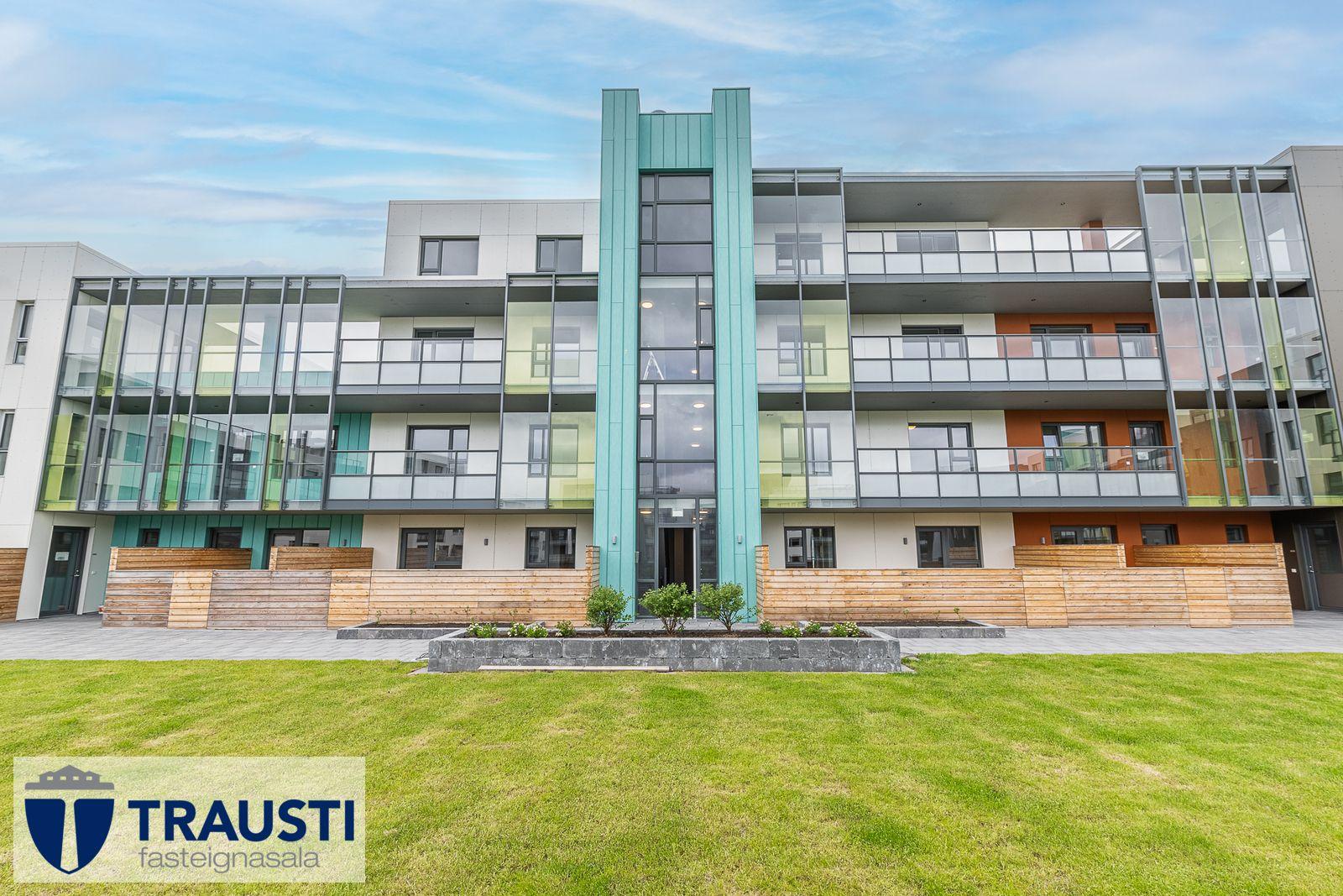 Nánari lýsing eignar: Þegar komið er upp á fjórðu hæð er sérinngangur inn í íbúðina eftir löngum gangi með útsýni yfir garðinn en þessi íbúð er ein með aðgang að ganginum. Forstofa með flísum á gólfi og yfirhafnaskáp. Úr forstofu er gengið út á 37,4 fm þaksvalir þar sem hægt er að koma fyrir heitum potti. Stofa og opið eldhús, hvít innrétting með eyju. Gengið er út á suður svalir frá stofu/eldhúsi Rúmgóð þrjú svefnherbergi, með fataskáp. Baðherbergi með sturtu, ljósri innréttingu, handlaug og upphengdu salerni og handklæðaofn. Sér þvottahús með flísum á gólfi. Geymsla í kjallara, innan bílskúrs 11,6 fm Bílskúr með stálvaski, 48,7 fm Bílastæði í lokuðu bílastæðahúsi, fyrir fram skúr nr. B21 Stór og fallegur garður er í miðju bygginganna með leiktækjum fyrir börn.