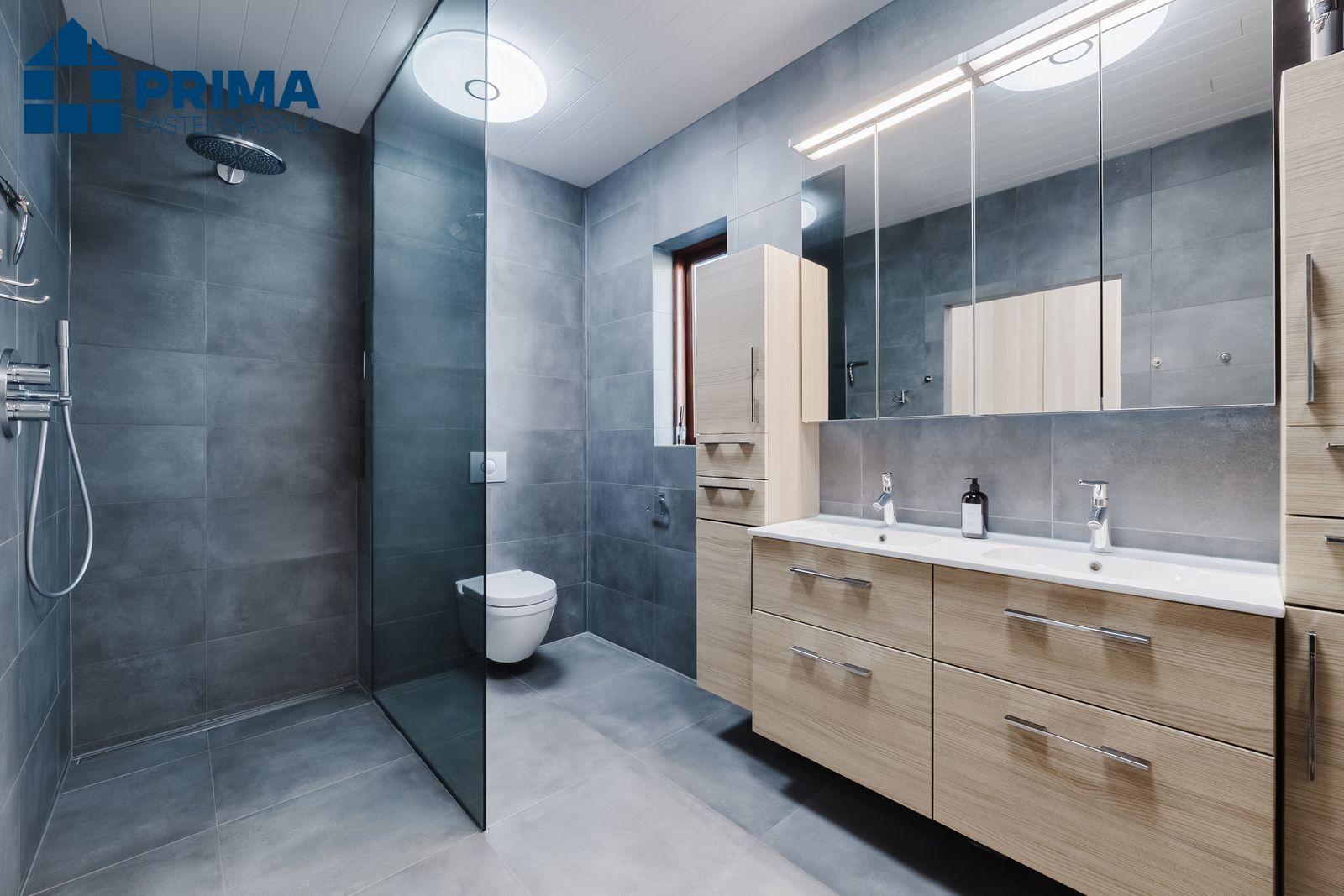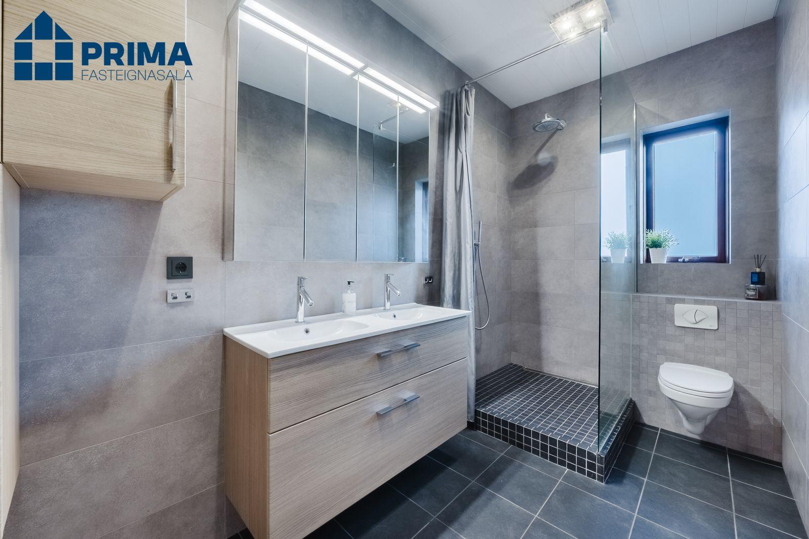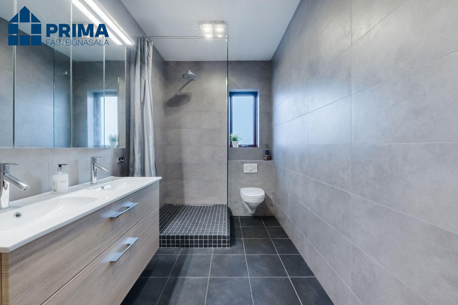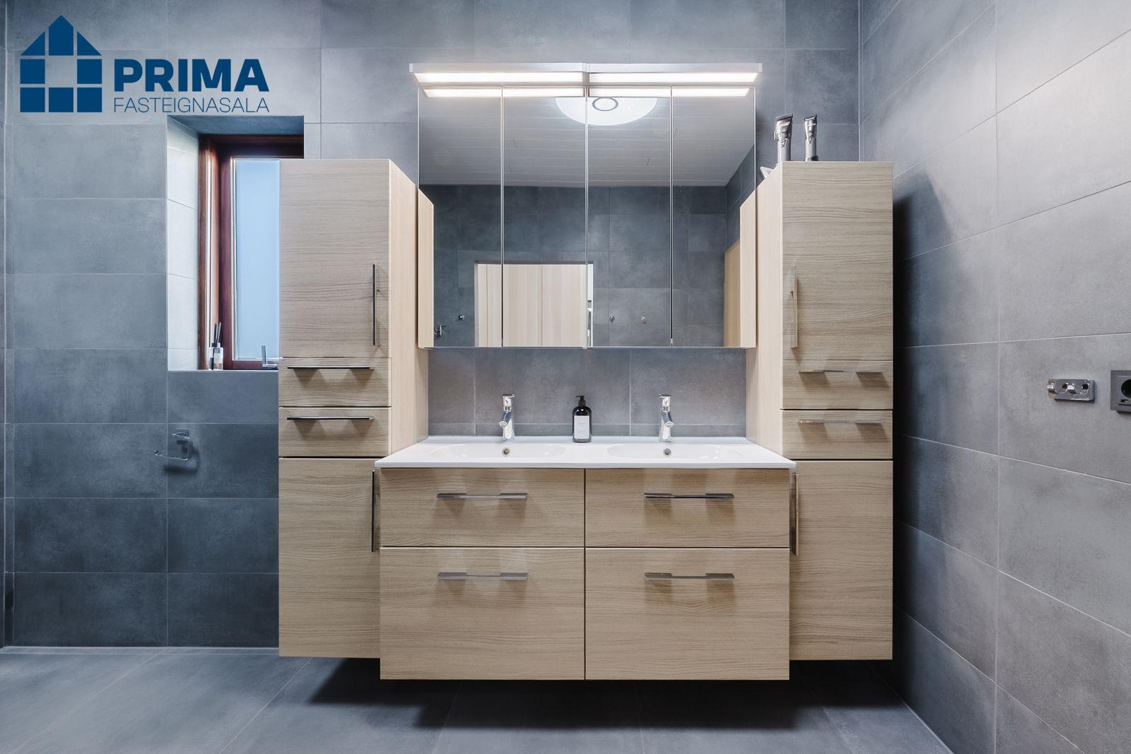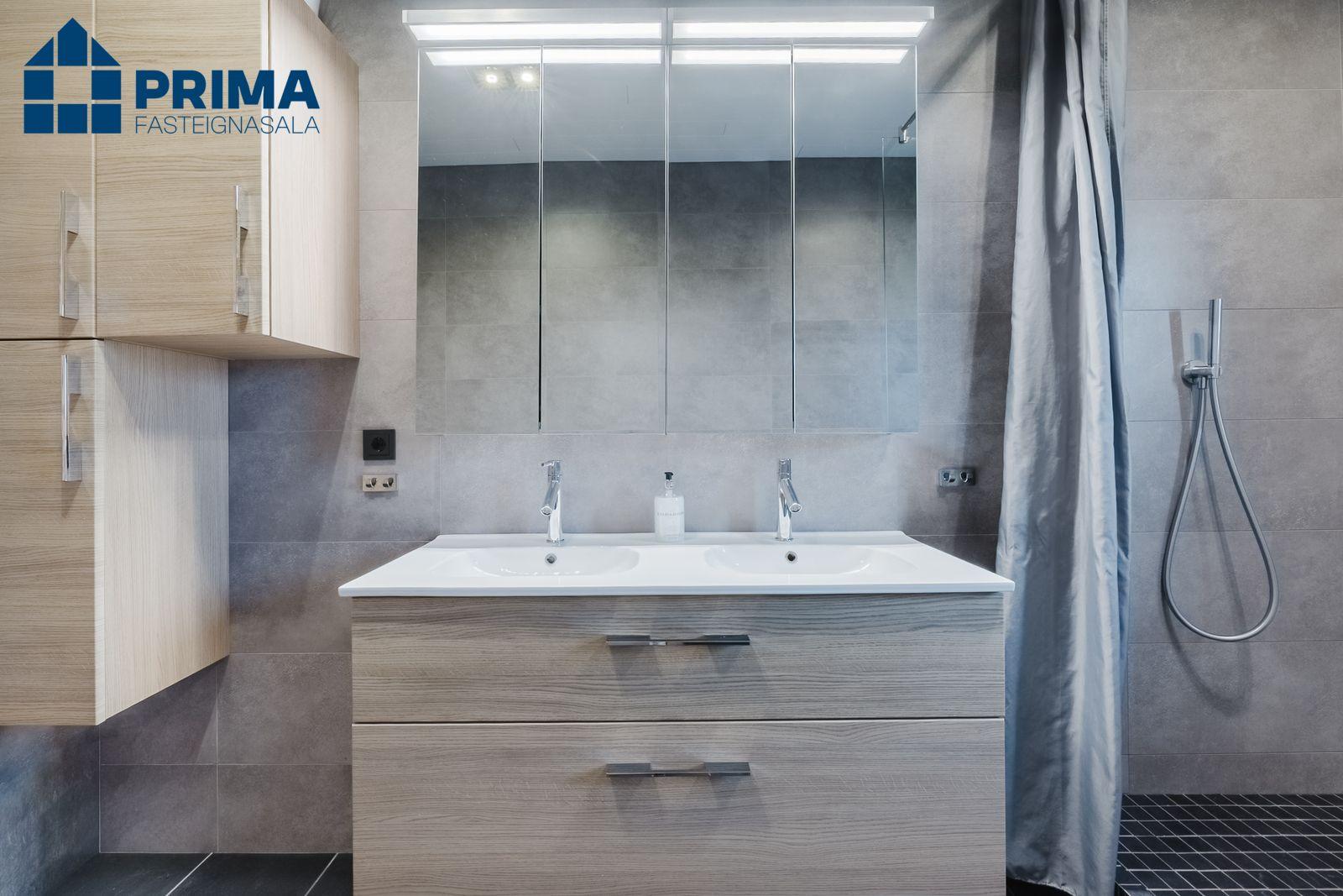 Baðherbergi flísalagt í hólf og gólf með fallegri innréttingu, sturtu aðstöðu, tveimur vöskum og upphengdum speglaskáp.