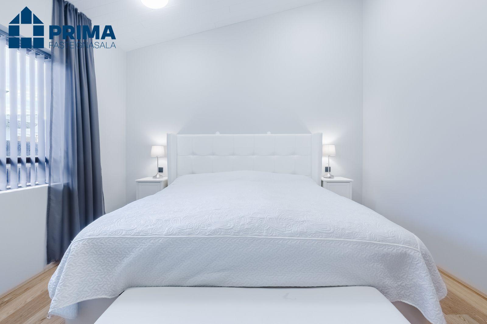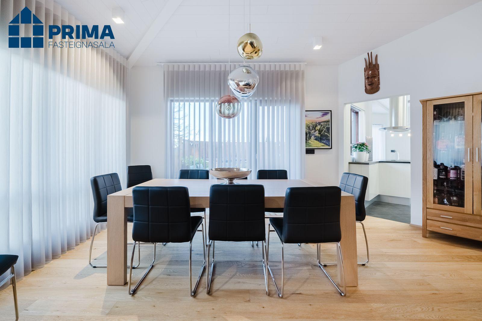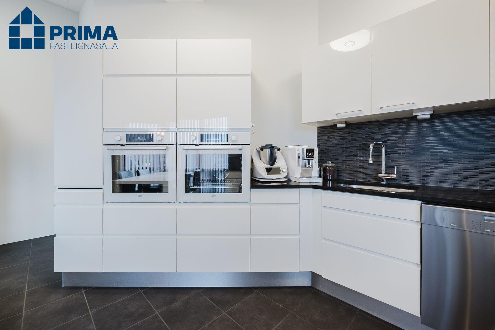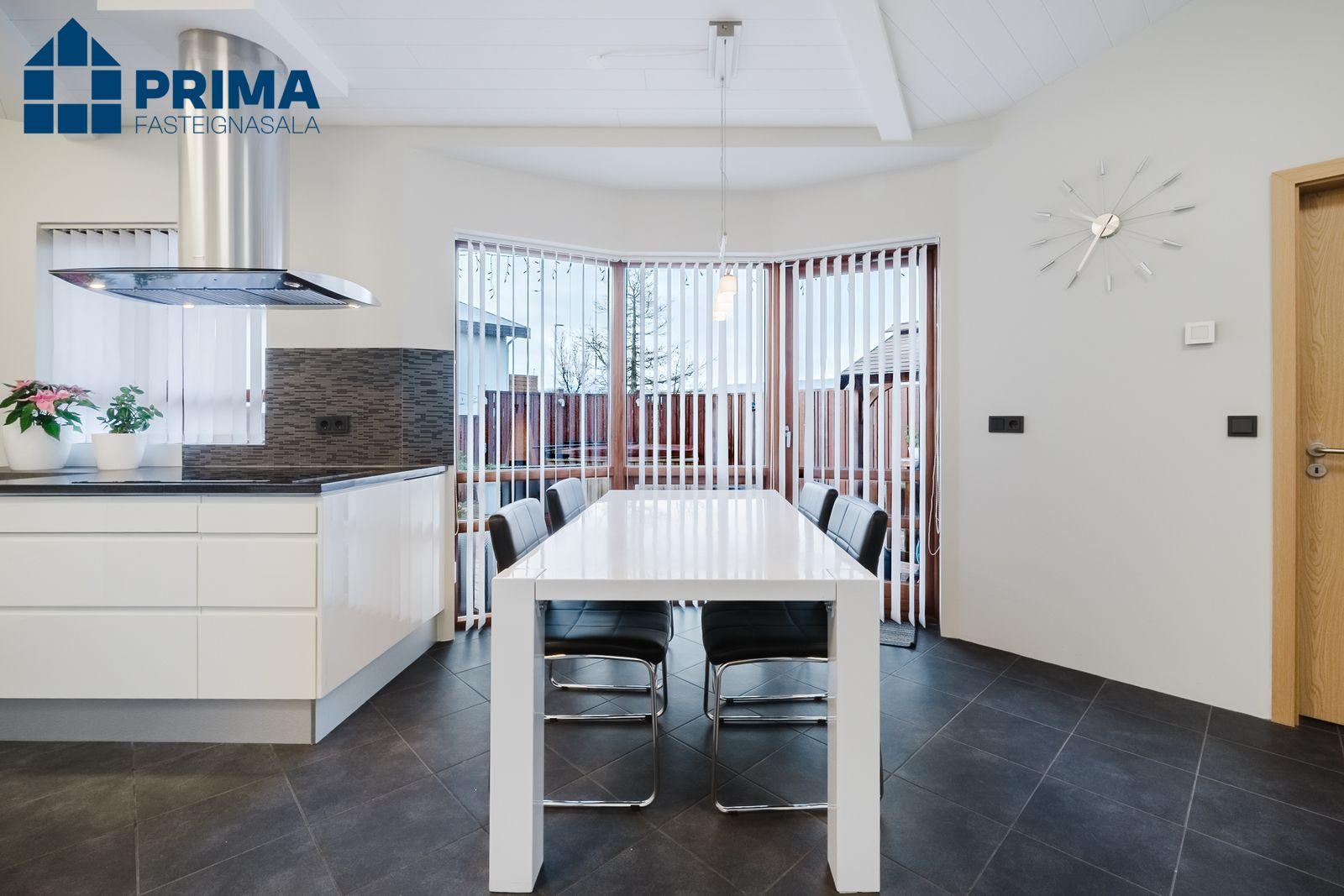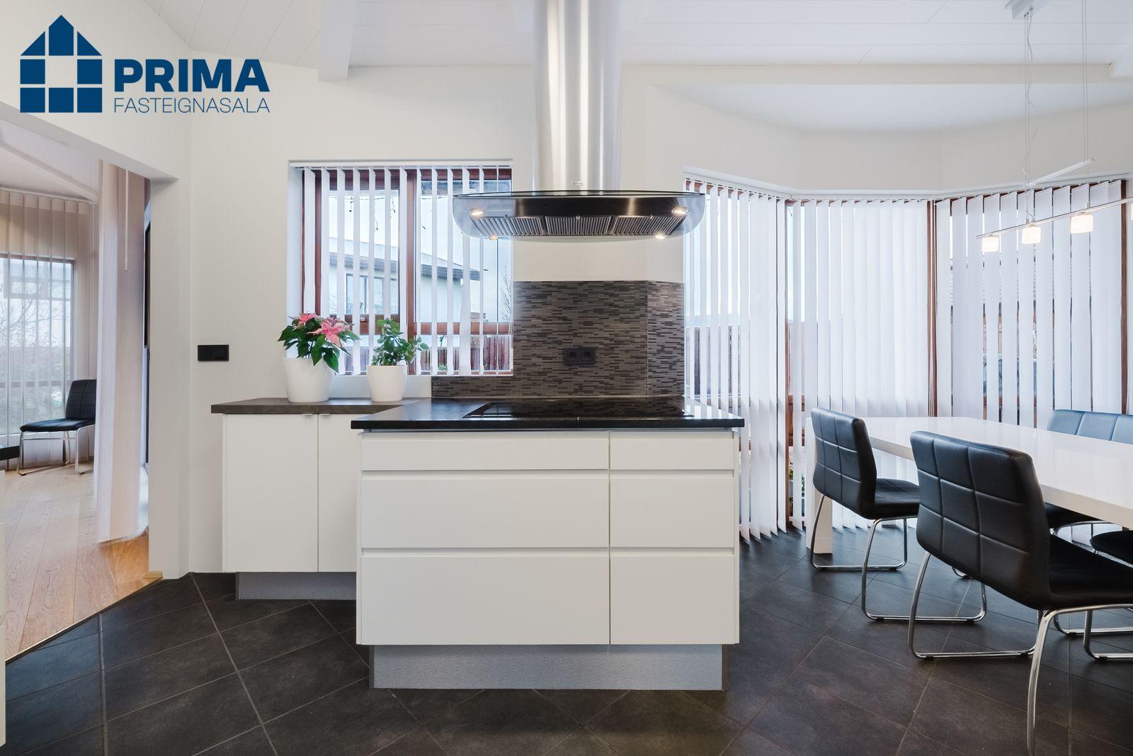 Eldhús mjög rúmgott með fallegri hvítri innréttingu og stórri eyju með upphengdum háfi. Tveir bökunarofnar í vinnuhæð. Útgengt út á sólpall úr eldhúsi.