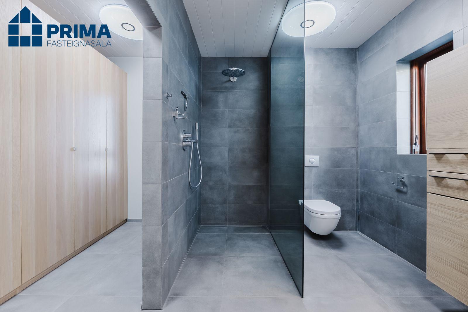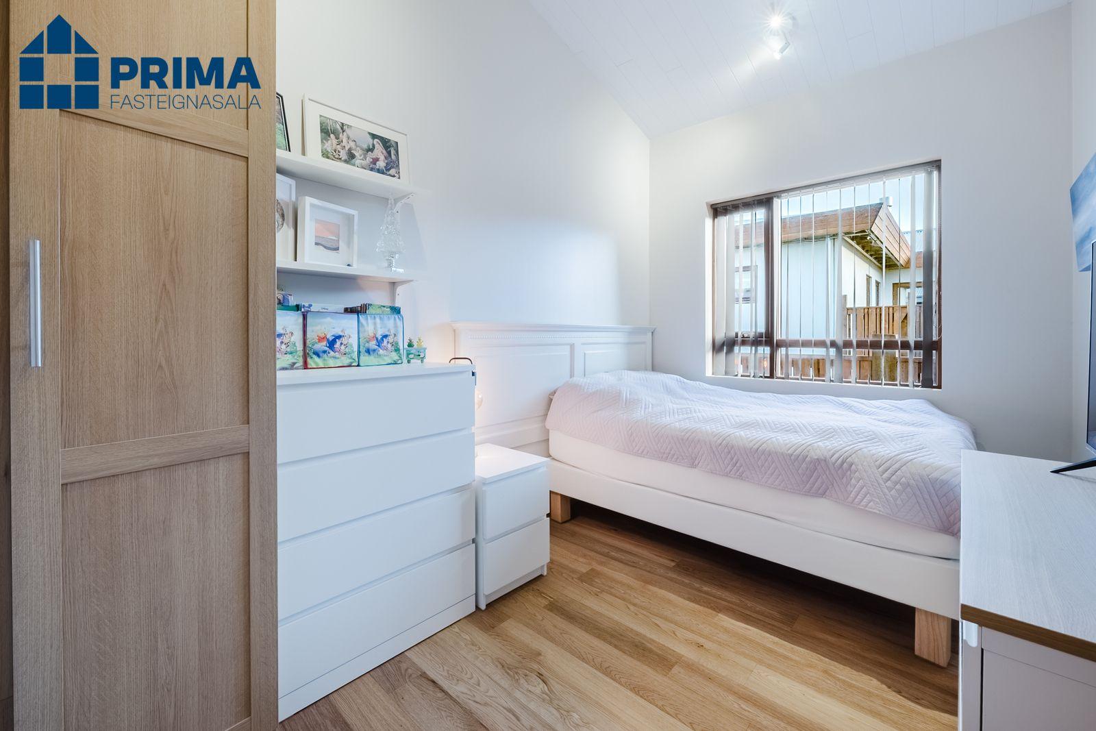 Hjónaherbergi með sturtu og salernisaðstöðu ásamt fataherbergi með stórum skápum.