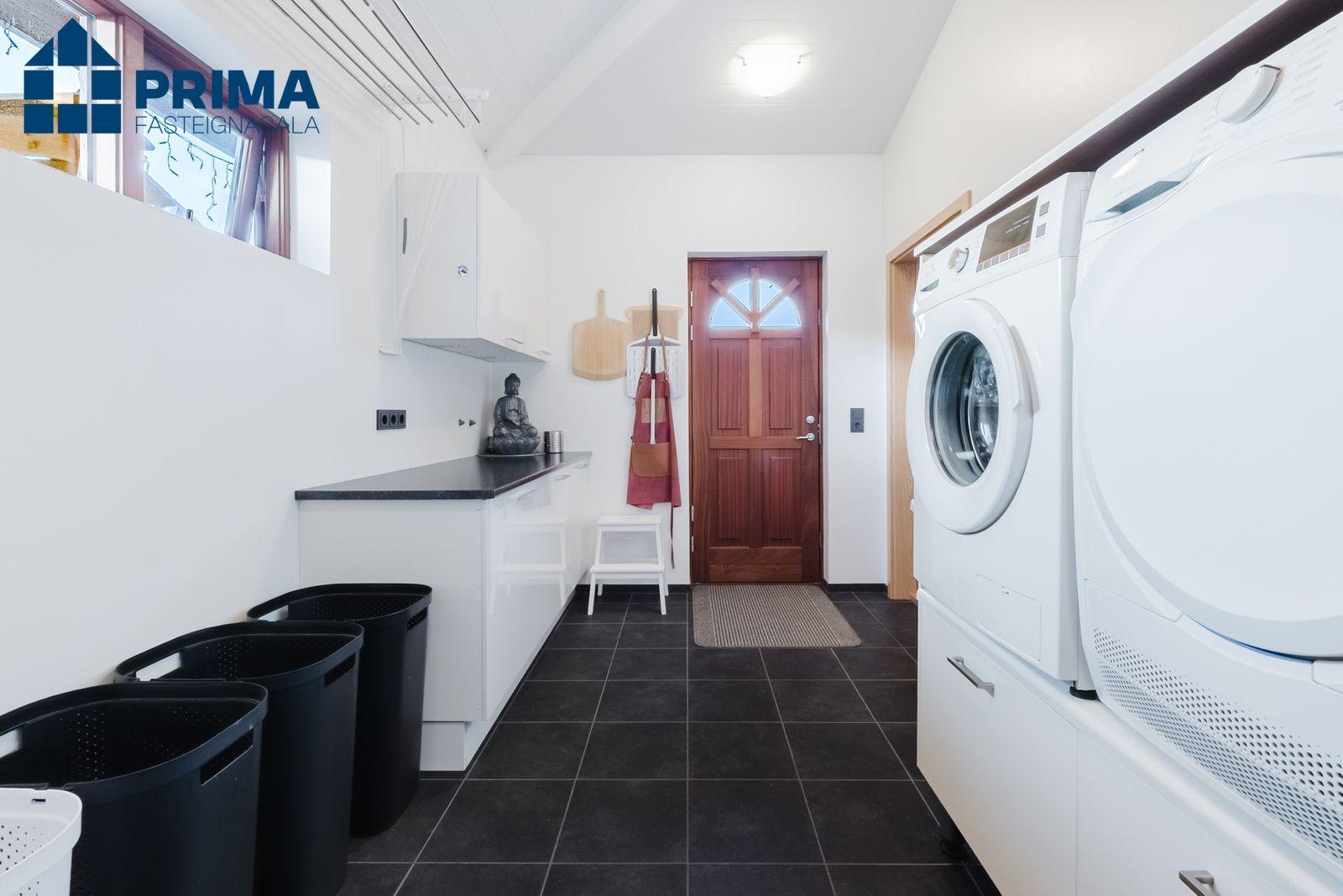 Þvottahús með þvottavél og þurrkara í vinnuhæð ásamt neðri og efri skápum. Einnig er upphengdur vaskur í þvottahúsinu.