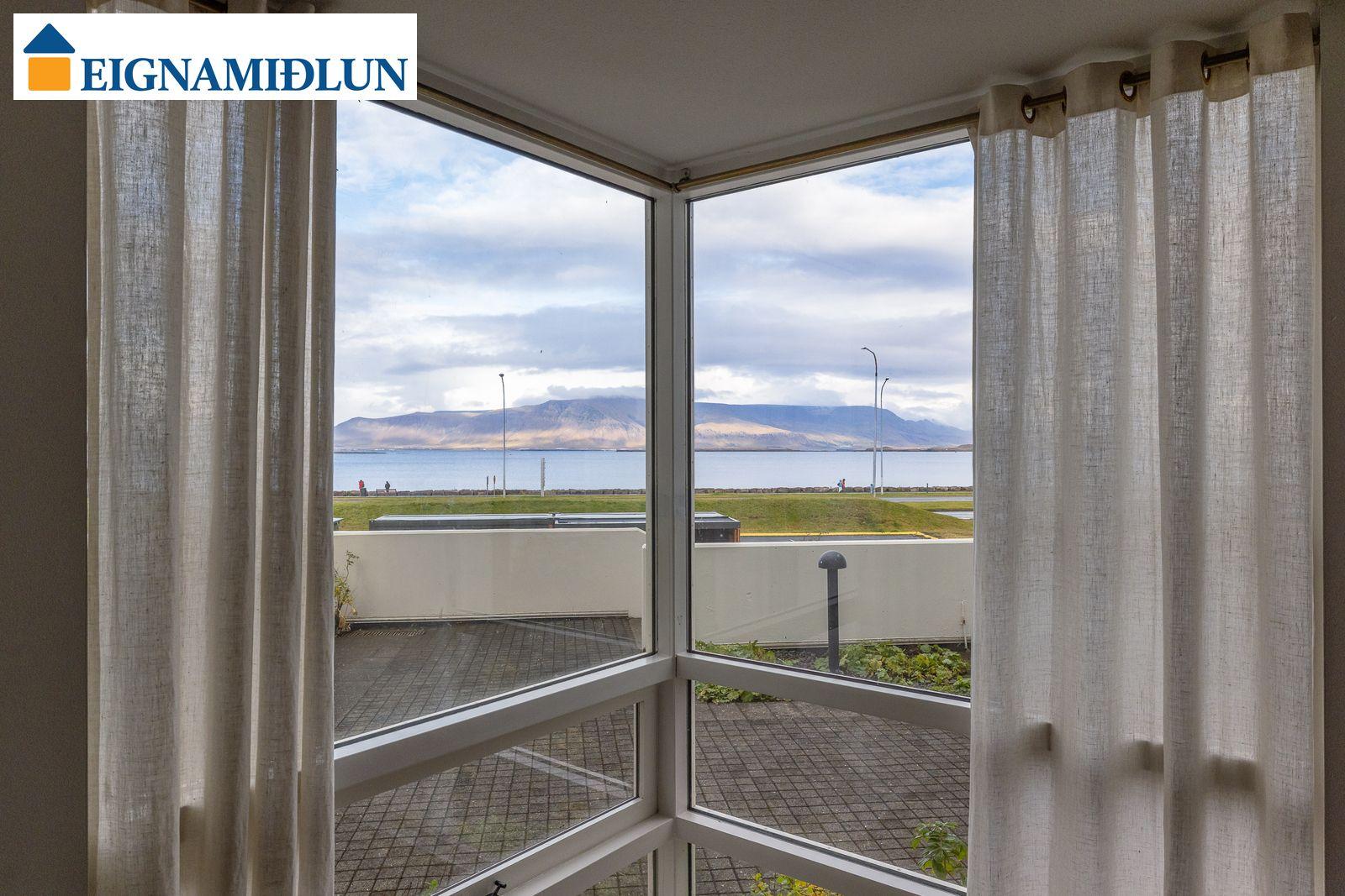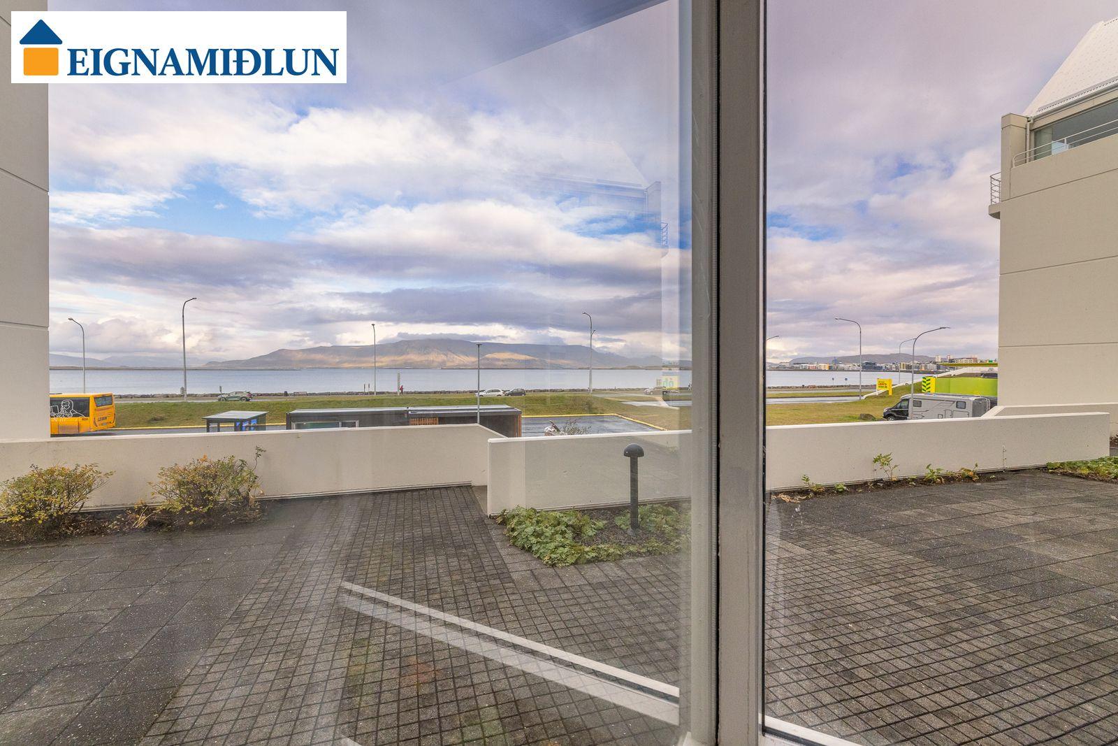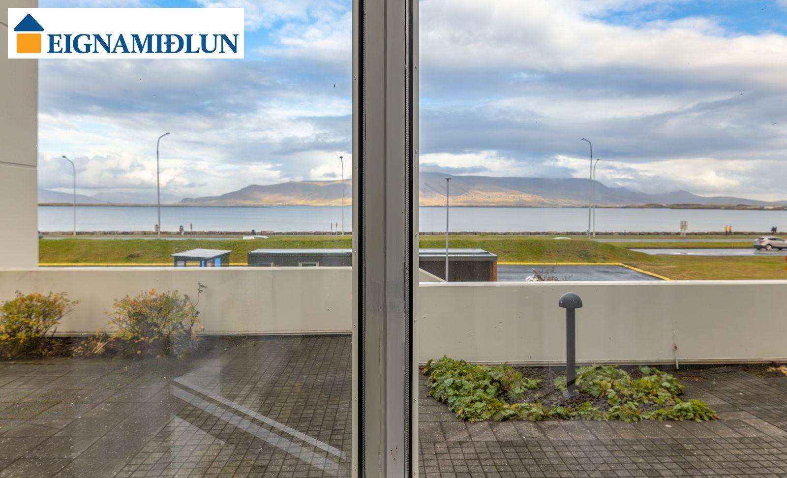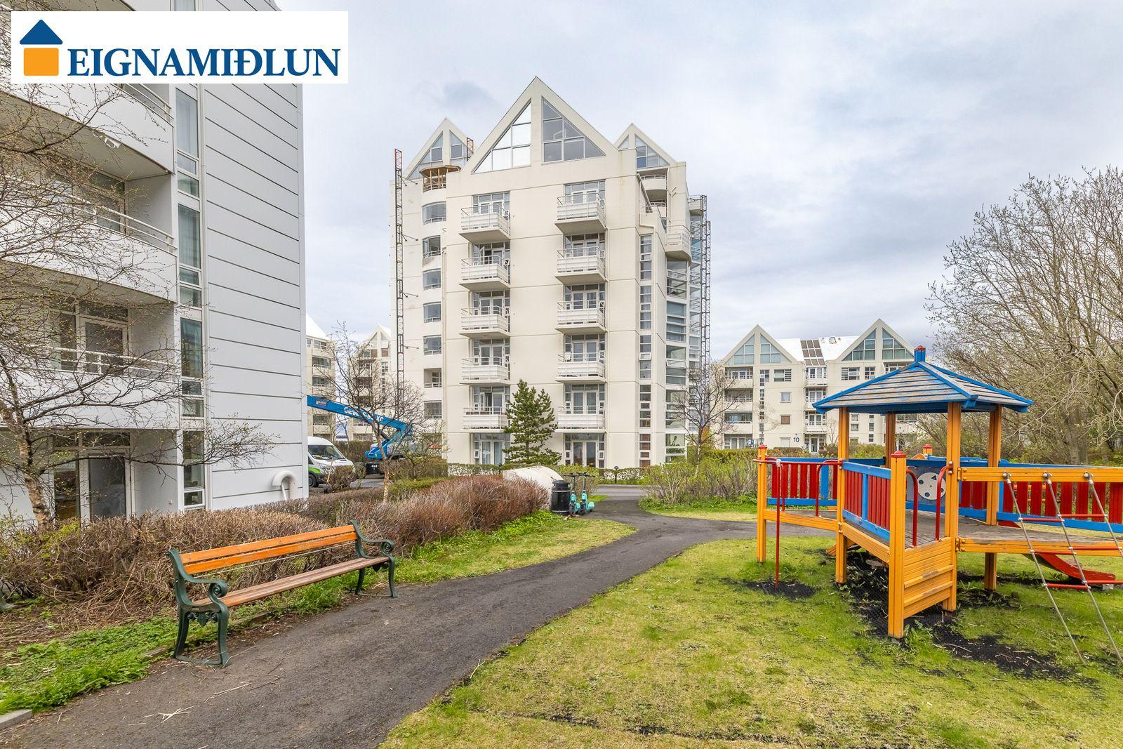 Laus strax - útsýni sem kemur á óvart. Sérlega vel skipulögð 105,0 fermetra björt og mjög rúmgóð íbúð á jarðhæð með afar góðu aðgengi. Íbúðin sjálf er 99 fermetrar og geymsla en 6 fermetrar, en einnig fylgir eigninni bílastæði í lokaðri bílageymslu. Stofur eru mjög rúmgóðar með plássi fyrir stórt borðstofuborð, bjartir gluggar í tvær áttir með útsýni til Esjunnar sem kemur mjög á óvart, útgengi út á sérafnotareit við eldhús og stofu, nýtt eldhús, tvö rúmgóð herbergi, fallegt baðherbergi. Húsið, sem byggt er 1990 og tilheyrir húsaþyrpingu á Völundarlóðinni svokölluðu, lítur vel út og hefur fengið gott viðhald. Verið er að ljúka við stórt viðhaldsverkefni sem seljendur hafa greitt fyrir. Í húsinu starfar húsvörður á vegum húsfélagsins.