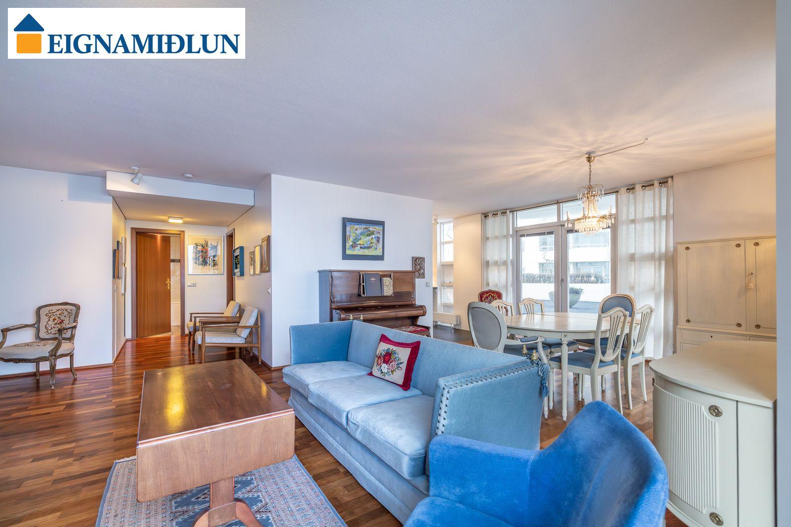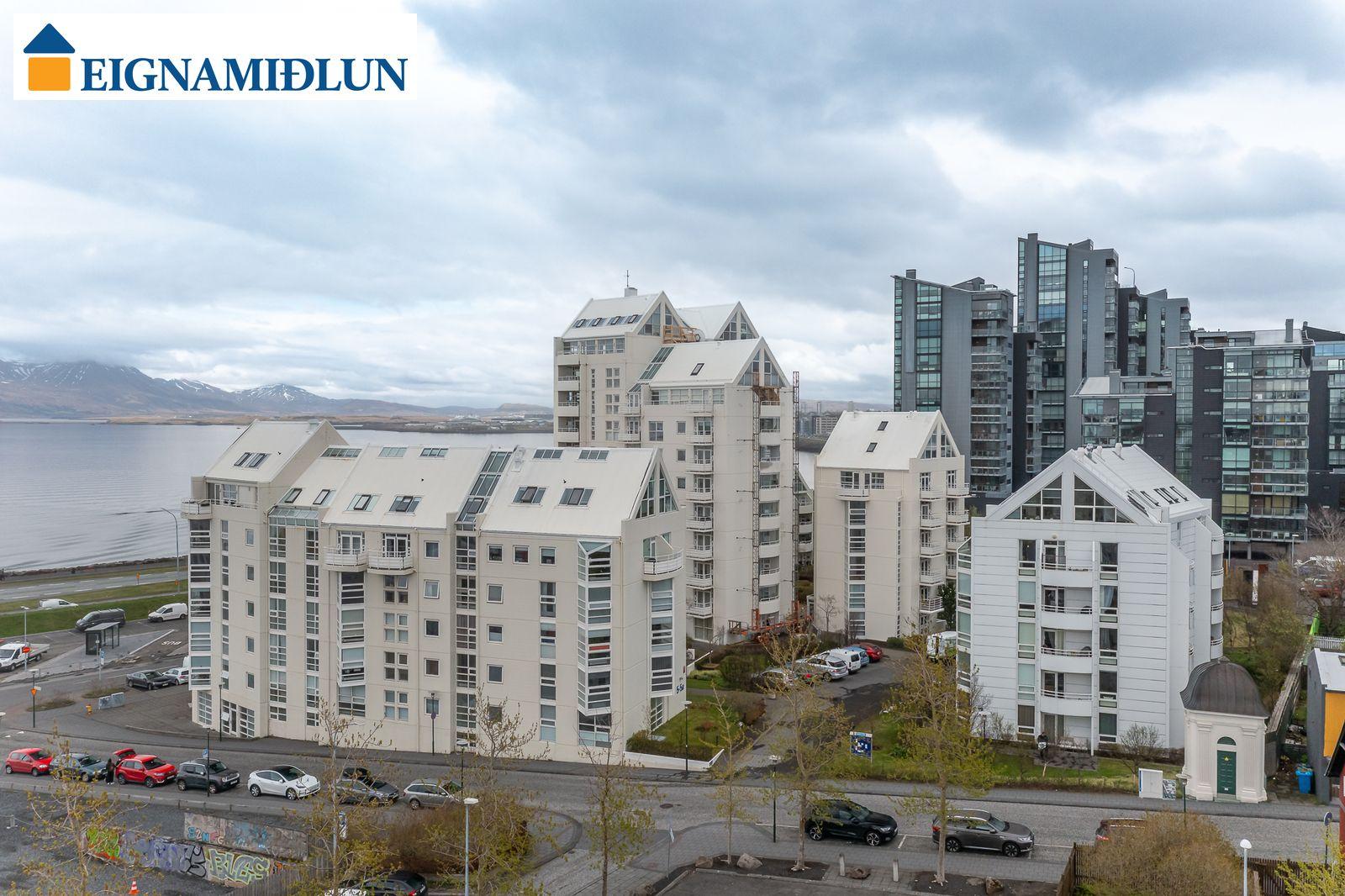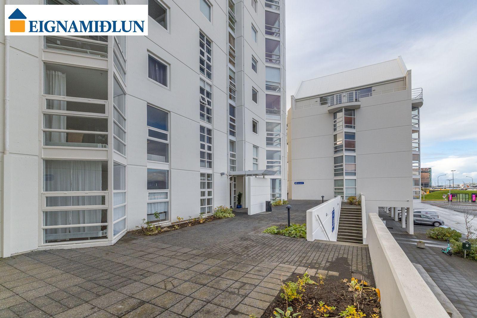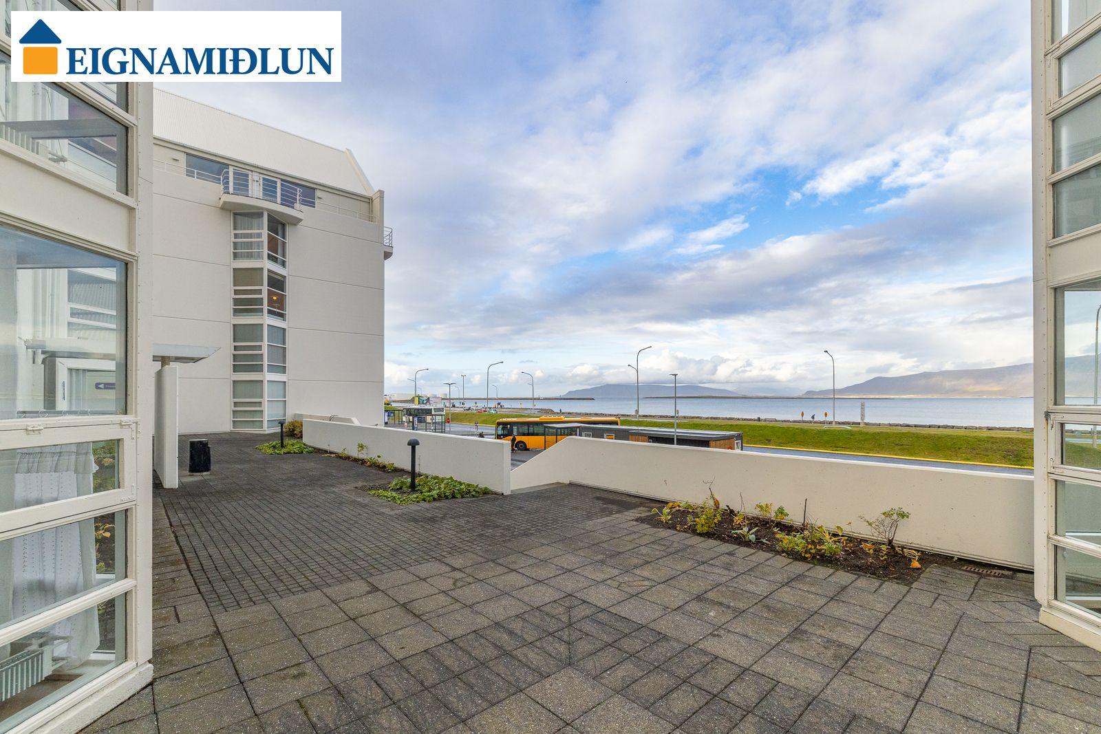 Laus strax - útsýni sem kemur á óvart. Sérlega vel skipulögð 105,0 fermetra björt og mjög rúmgóð íbúð á jarðhæð með afar góðu aðgengi. Íbúðin sjálf er 99 fermetrar og geymsla en 6 fermetrar, en einnig fylgir eigninni bílastæði í lokaðri bílageymslu. Stofur eru mjög rúmgóðar með plássi fyrir stórt borðstofuborð, bjartir gluggar í tvær áttir með útsýni til Esjunnar sem kemur mjög á óvart, útgengi út á sérafnotareit við eldhús og stofu, nýtt eldhús, tvö rúmgóð herbergi, fallegt baðherbergi. Húsið, sem byggt er 1990 og tilheyrir húsaþyrpingu á Völundarlóðinni svokölluðu, lítur vel út og hefur fengið gott viðhald. Verið er að ljúka við stórt viðhaldsverkefni sem seljendur hafa greitt fyrir. Í húsinu starfar húsvörður á vegum húsfélagsins.