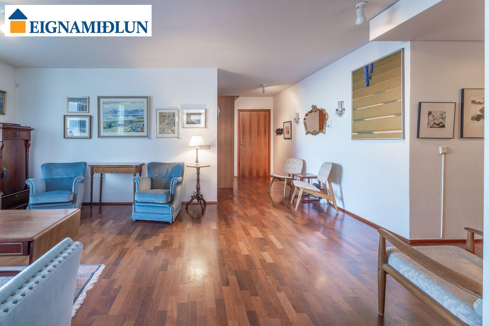 Á gólfum er eldra viðarparket sem lítur ágætlega út og hefur aldrei verið pússað. Dúkur á eldhúsi, flísar á baði. Sérafnotareitur utan eldhúss þar sólar nýtur seinni part dags.