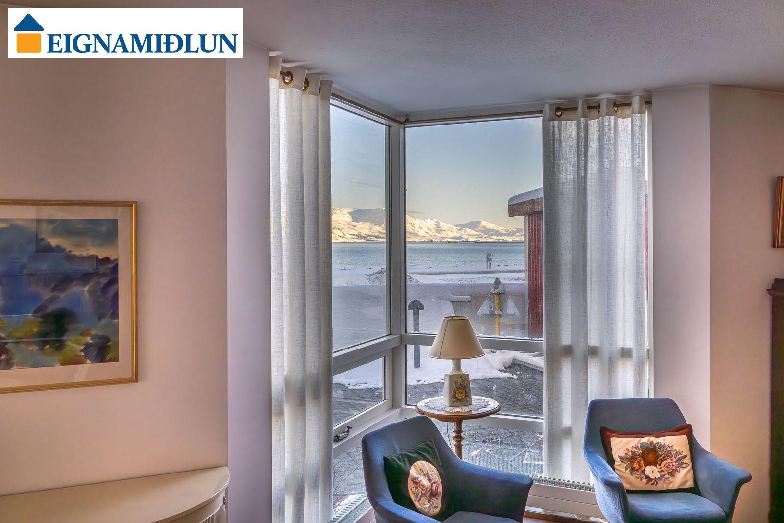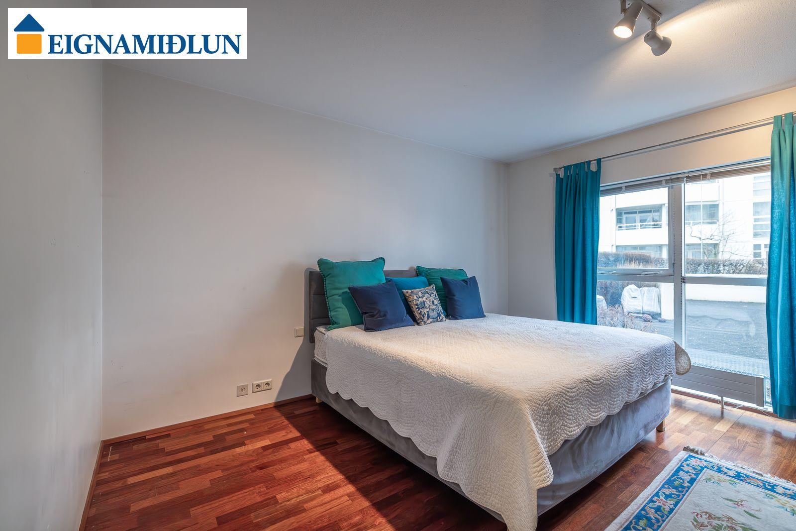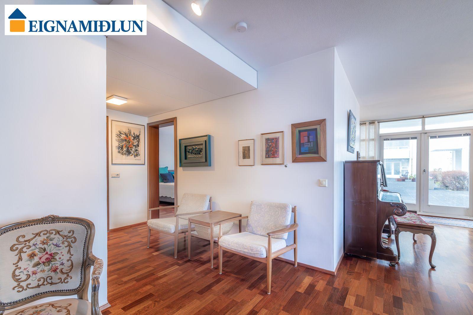Stofur eru áberandi breiðar og bjartar með góðu rými, stórir gluggar í tvær áttir, gluggi við eldhús í enda stofu er með svaladyrum út á sérafnotareit. Góð birta inn um stóra glugga á stofu og útsýni sem kemur á óvart þó íbúðin sé að jarðhæð. Eldhús nýlega endurnýjað með fallegri hvítri innréttingu, nýjum eldhústækjum, innbyggðum ísskáp og dökkum borðplötum, dúkur á gólfi. Baðherbergi er flísalagt, veggir og gólf, vegghengt salerni, baðkar með sturtu, skápur undir vaski. Hjónaherbergi er með gólfsíðum glugga og stórum fataskáp, gott minna herbergi við forstofu einnig með gólfsíðum glugga.