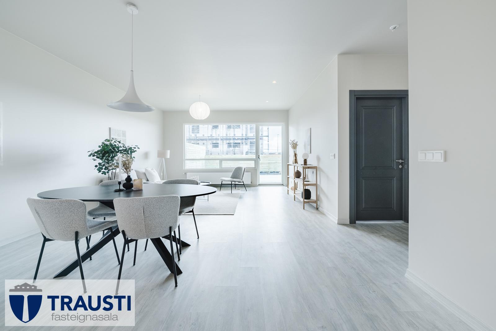 Bjart og opið alrými sameinar stofu, borðstofu og eldhús með vel hannaðri eyju. Íbúðin er með þremur svefnherbergjum, stílhreinu baðherbergi, forstofu, þvottahúsi og innbyggðri geymslu, sem tryggir gott skipulag og þægindi.